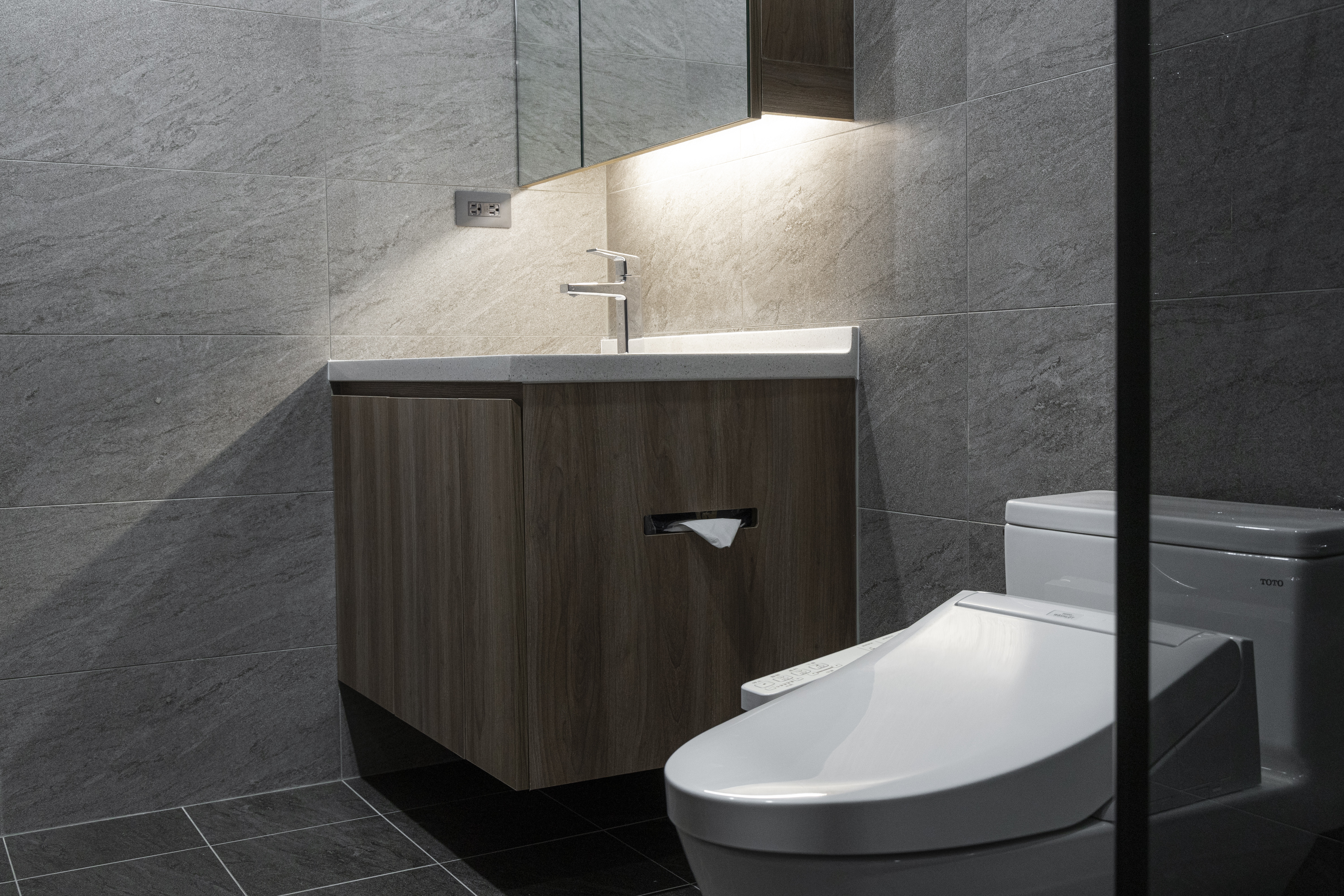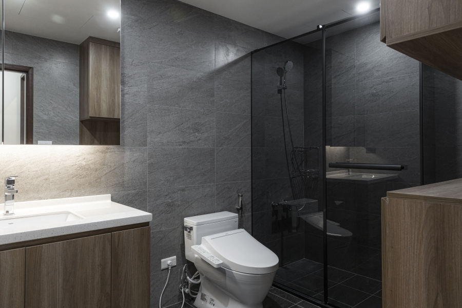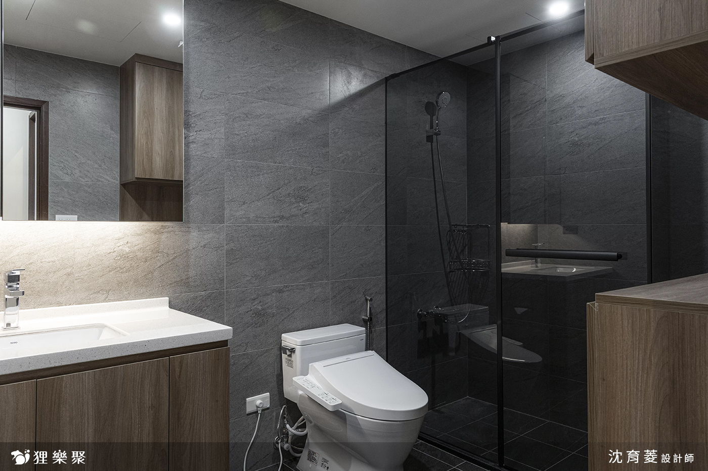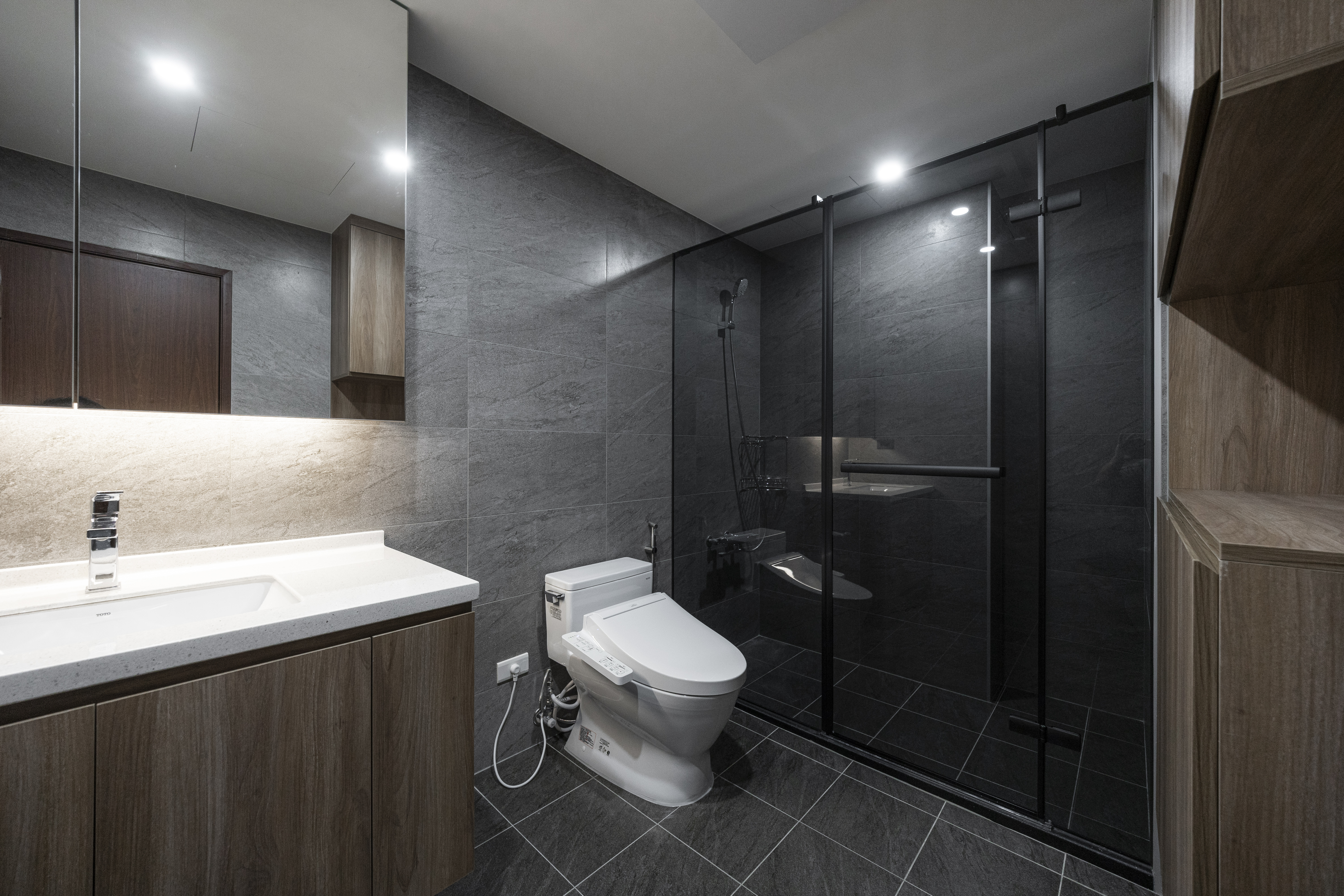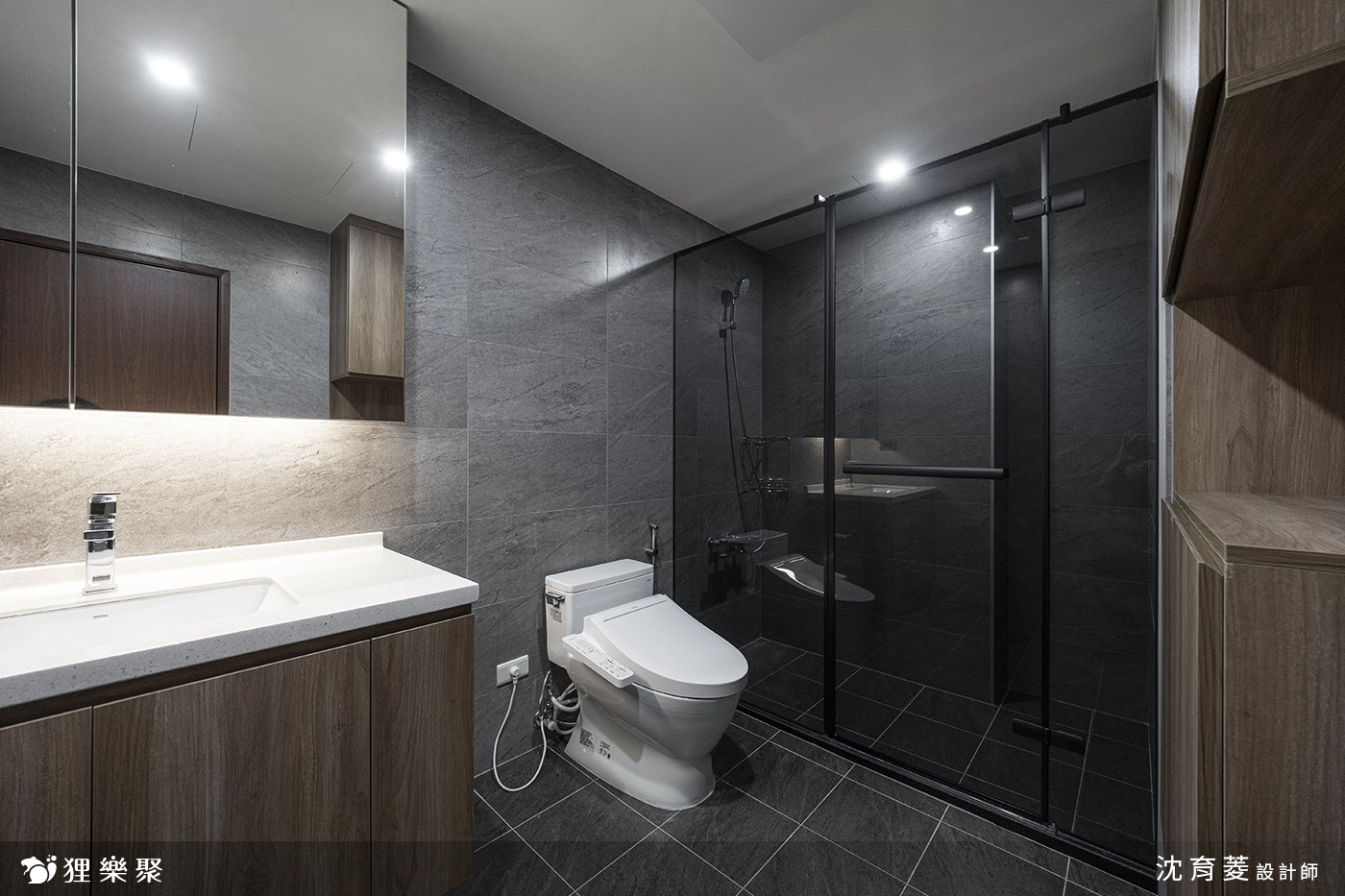 衛浴空間結合鏡櫃、黑框玻璃拉門打造乾溼分離,襯上深灰色磁磚地坪與牆面,呈現沉穩的仛寂現代風格,耐看又好清潔。