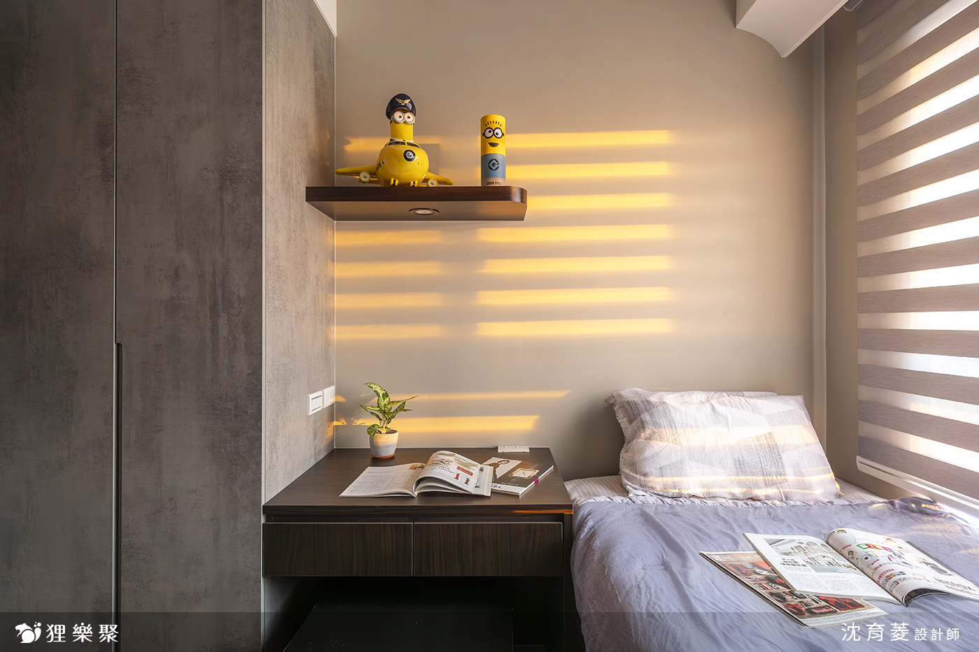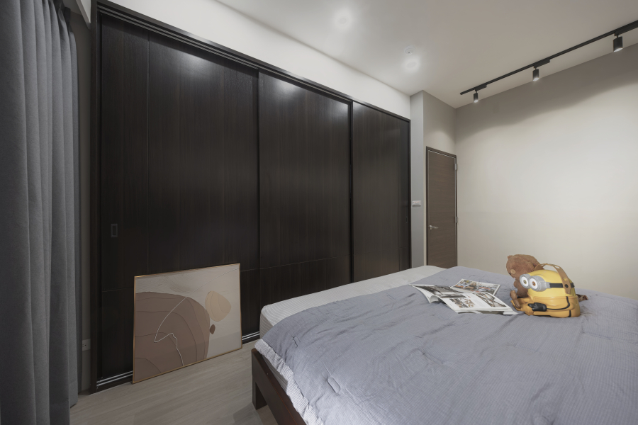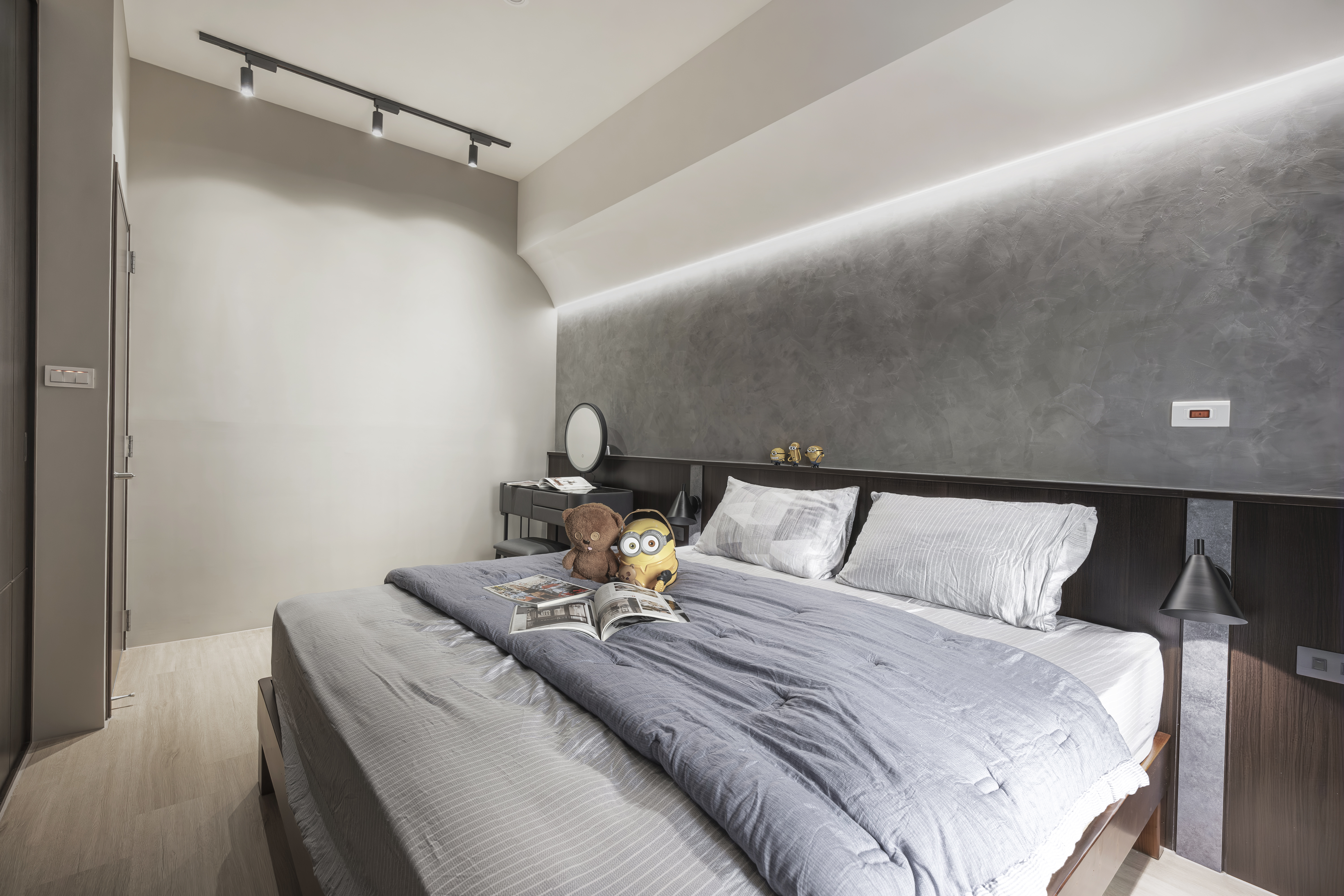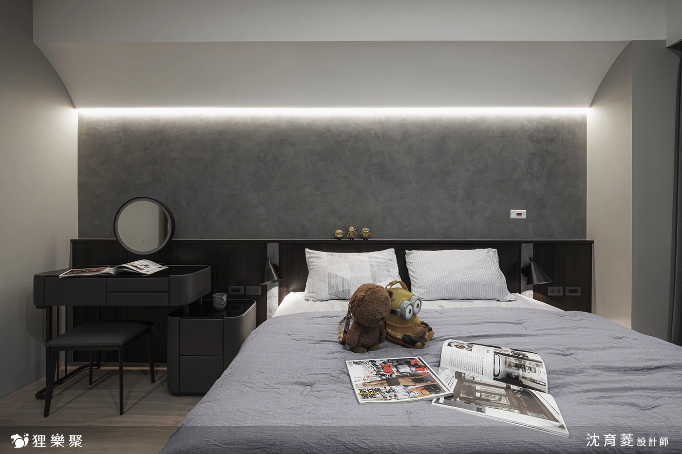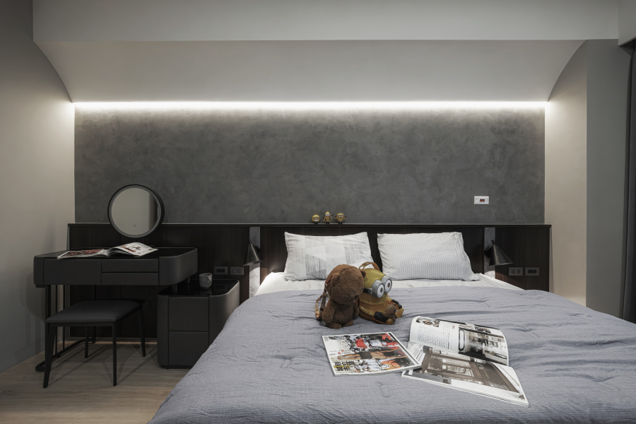 主臥部分,設計師以圓弧天花造型修飾床頭樑柱,搭配柔和的照明光線與整面的系統櫃收納,創造安穩寧靜的休憩氛圍。次臥採小巧布局,深色書桌與大量留白牆面,營造靜謐且舒心的現代風居所。