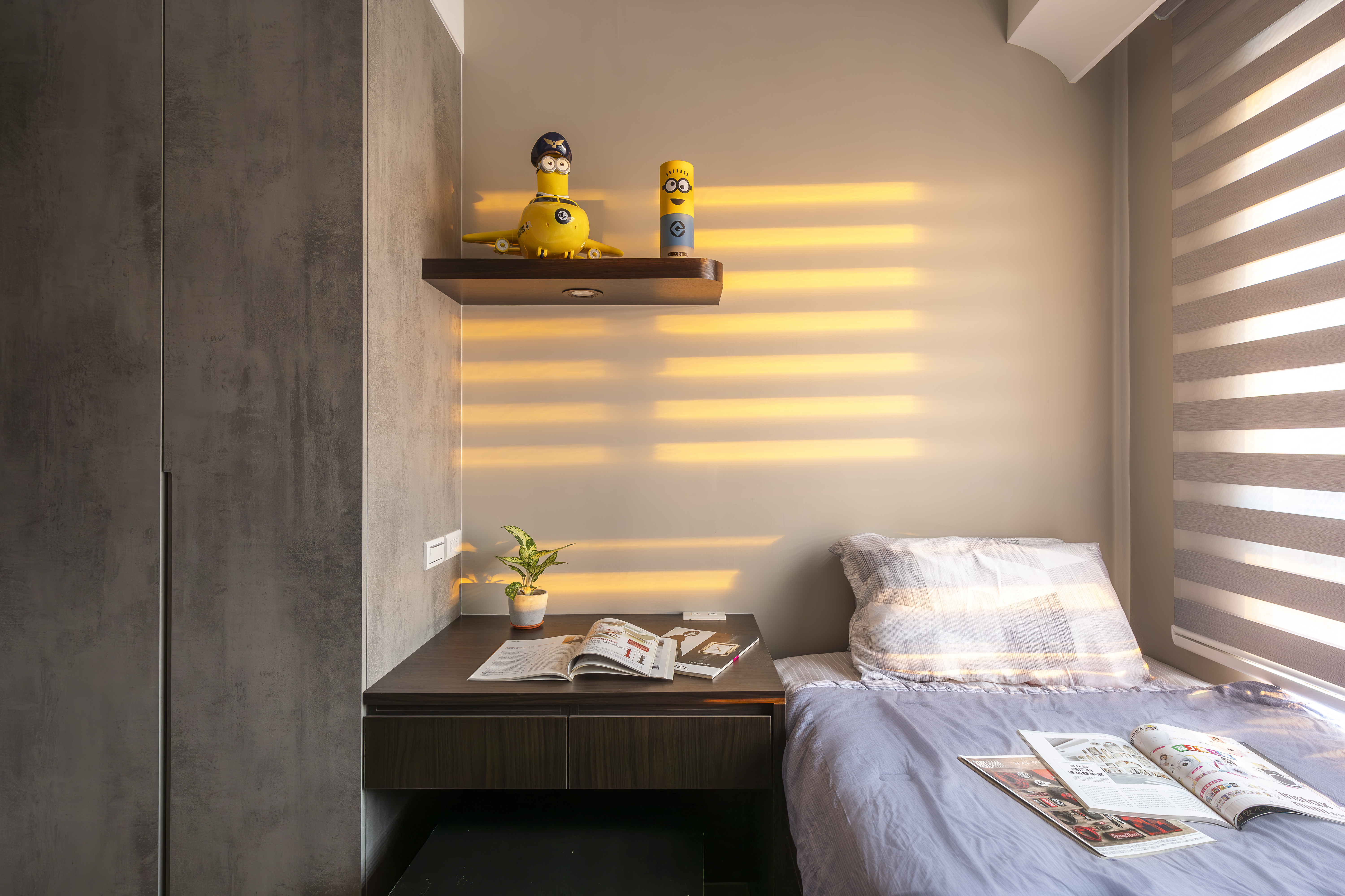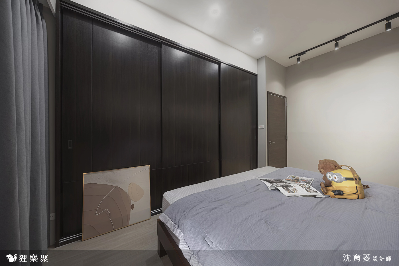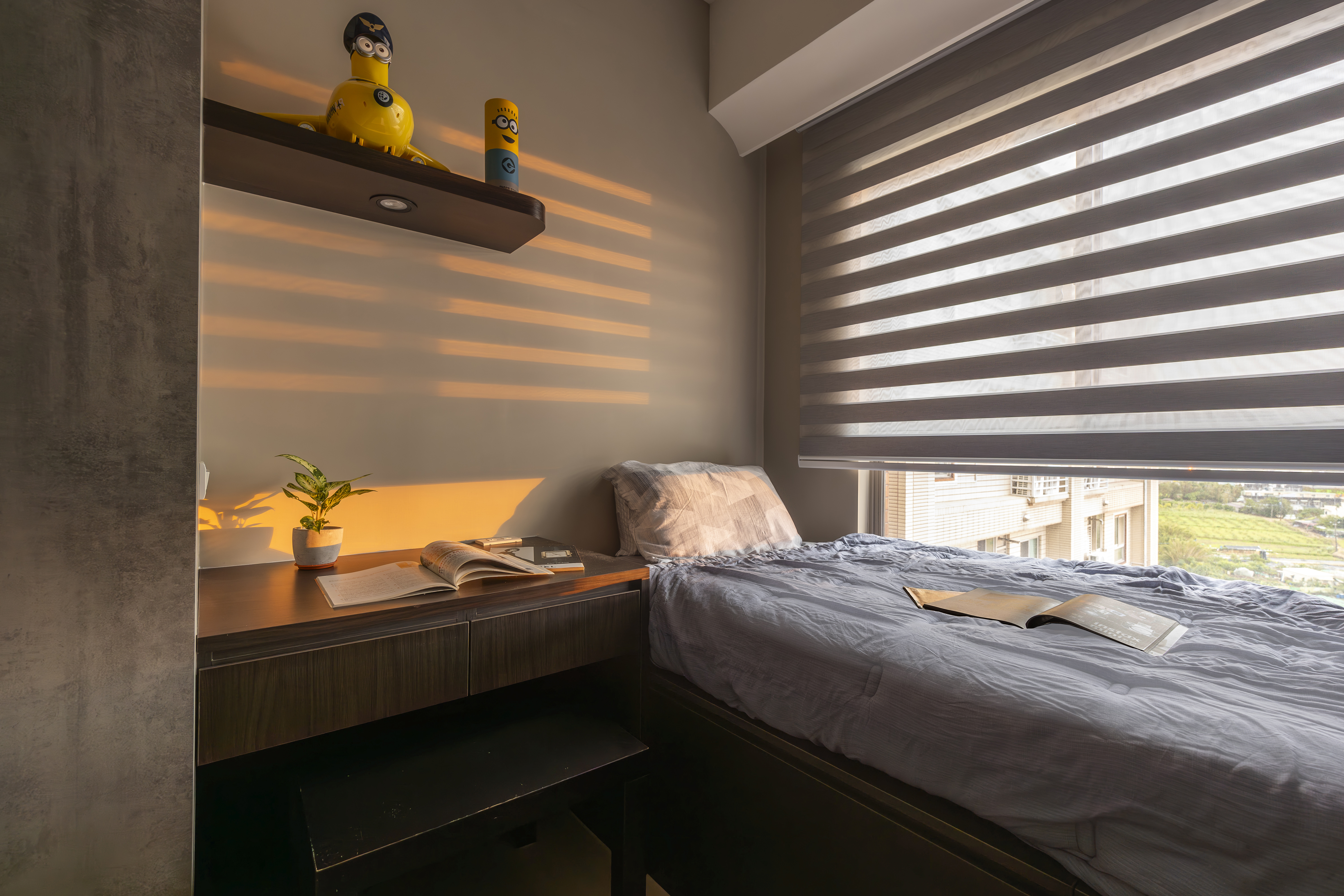 主臥部分,設計師以圓弧天花造型修飾床頭樑柱,搭配柔和的照明光線與整面的系統櫃收納,創造安穩寧靜的休憩氛圍。次臥採小巧布局,深色書桌與大量留白牆面,營造靜謐且舒心的現代風居所。