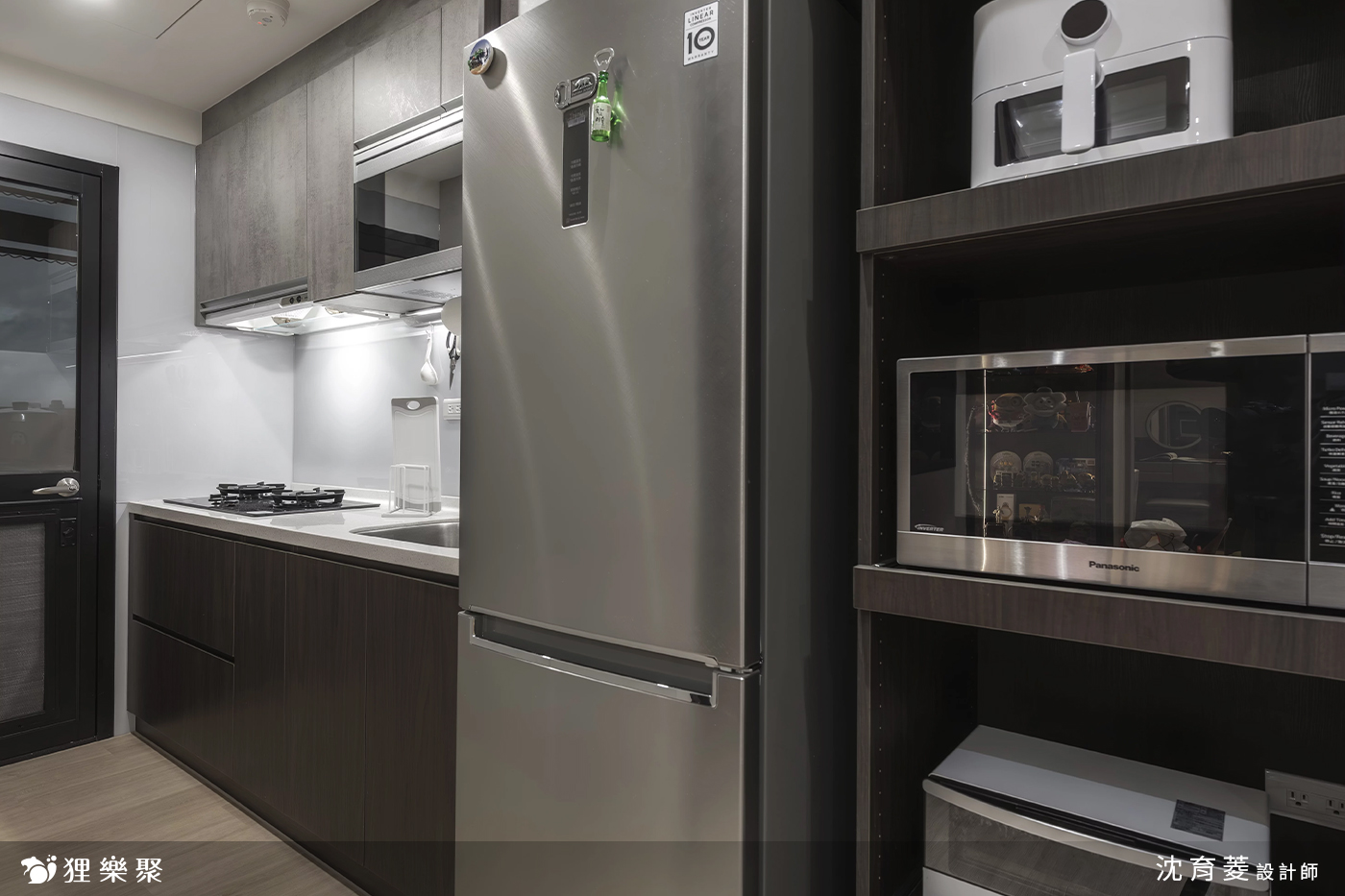 客餐廳電視牆、沙發背牆選用冷冽的灰調司曼特漆,搭配開放式層架巧妙展示各類模型,豐富整體視覺層次。廚房簡潔的檯面配置,襯上霧灰與黑色木紋櫃帶出簡潔俐落感,設計師特別以系統櫃打造可拉出式電器櫃,增添下廚時的方便度,圍塑出沉穩又帶有品味的現代風氛圍。衛浴空間結合鏡櫃、黑框玻璃拉門打造乾溼分離,襯上深灰色磁磚地坪與牆面,呈現沉穩的仛寂現代風格,耐看又好清潔。