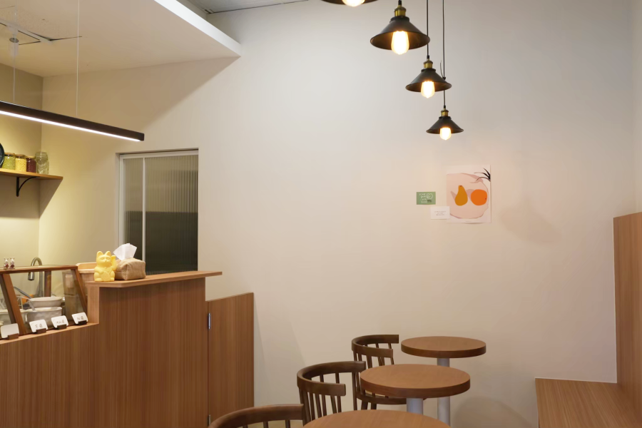 客座區規劃了舒適的木質卡座搭配餐桌、餐椅,以鐵件質感吊燈襯上手繪的牆面插畫點綴,打造出充滿文青感的用餐氛圍,在小小的空間中帶出了滿滿的溫暖感受,讓每位用餐的客人都能感受片刻的寧靜美好。