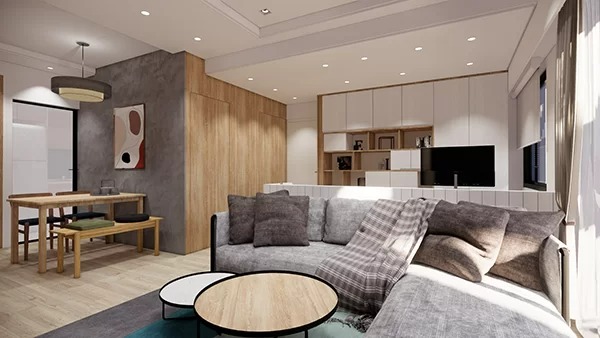 這是一個兩房兩廳的案例,屋主選擇將書房與客廳之間的牆打掉,希望能讓空間更加通透、開闊,結合收納及展示功能的書櫃更成為了公共空間的焦點之一,而臥室和廁所選擇使用隱藏門,讓空間的視覺性更加完整。