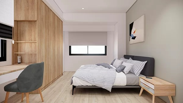 北歐風元素大多以白色和淺色系的木紋做搭配,案例從裡到外具有相當的一致性,整體舒適又耐看,餐桌旁的清水模牆面更為空間帶來一絲沉穩靜謐的感覺,而臥室主牆則選擇灰色系的牆面跳色,與北歐風元素相映成趣。