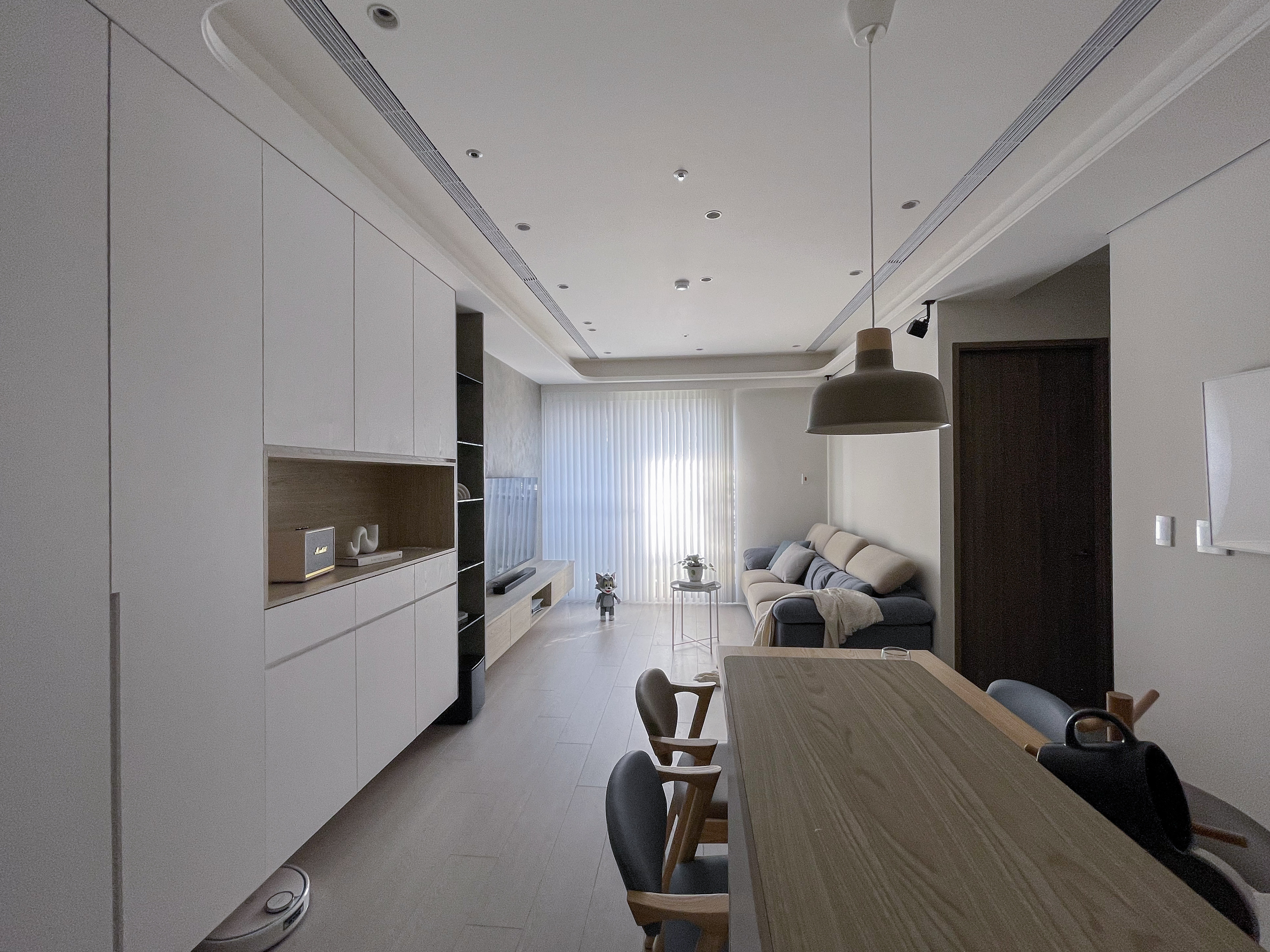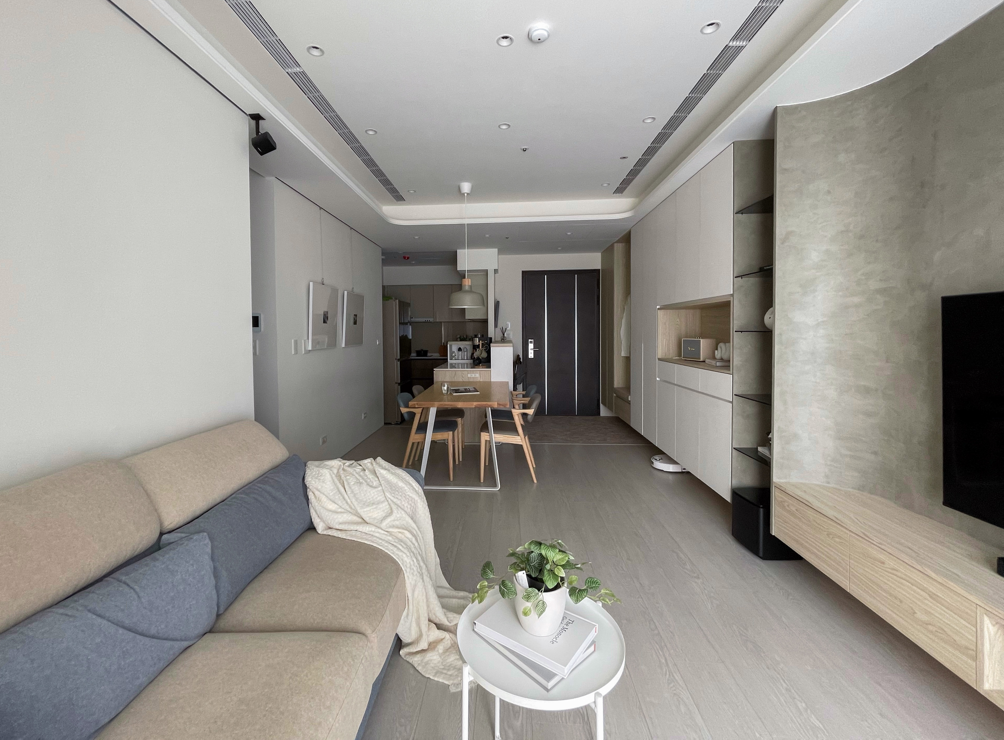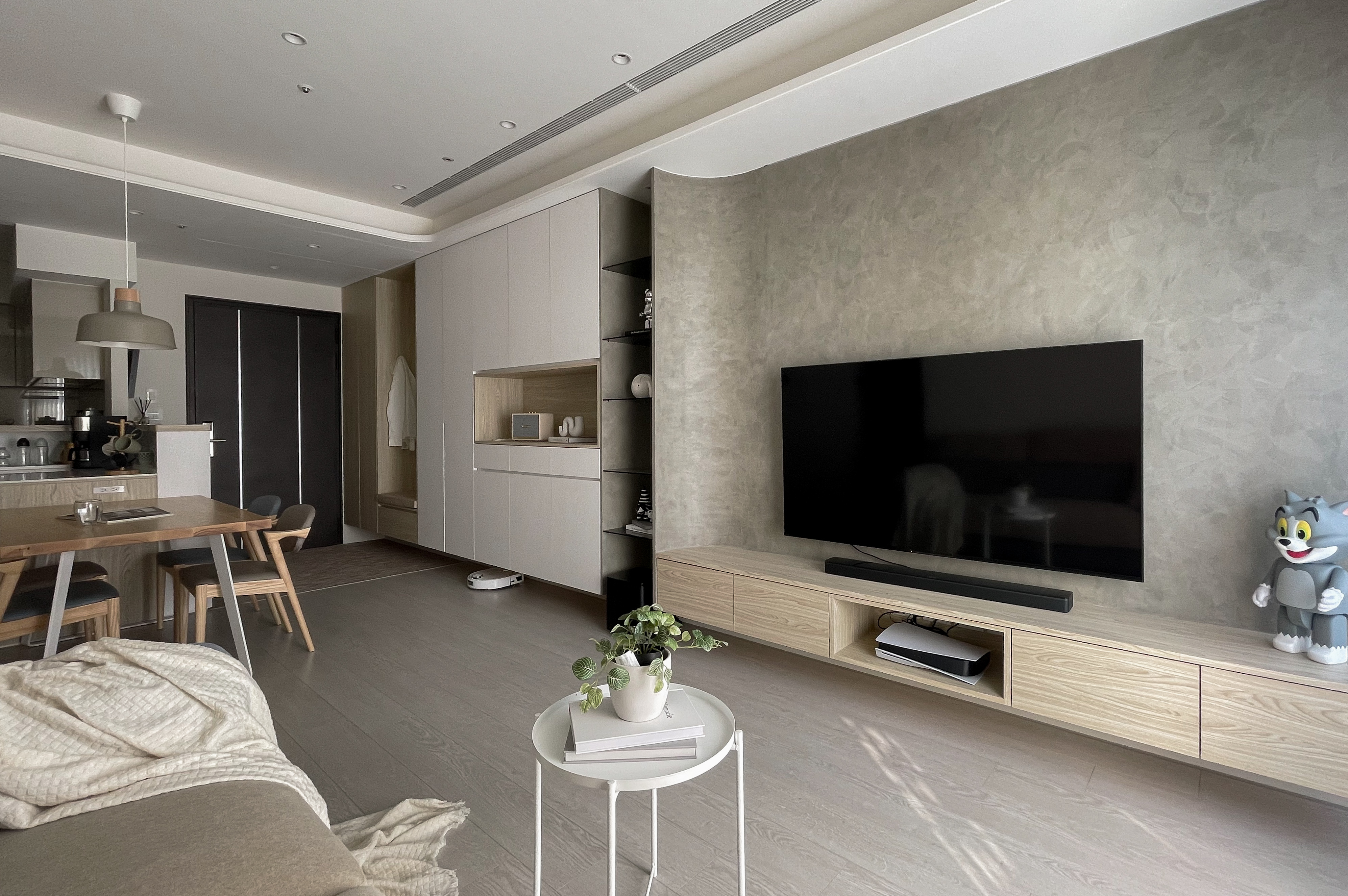 設計師在天花板與電視牆中融入自身偏愛的圓弧造型,電視牆面採用較有個性的灰色司曼特塗料,並利用電視牆背板圓弧形的元素,使搶眼的色調點綴得更加柔和。除了玄關及廚房,設計師在公共空間的客餐廳直鋪超耐磨木地板,也將三間臥室原有的SPC地板都改為超耐磨木地板,為家增添更多木質調的溫度。超耐磨木地板因為其價格親民、環保低甲醛,耐磨又好保養,常是大多數家庭裝潢的首選。