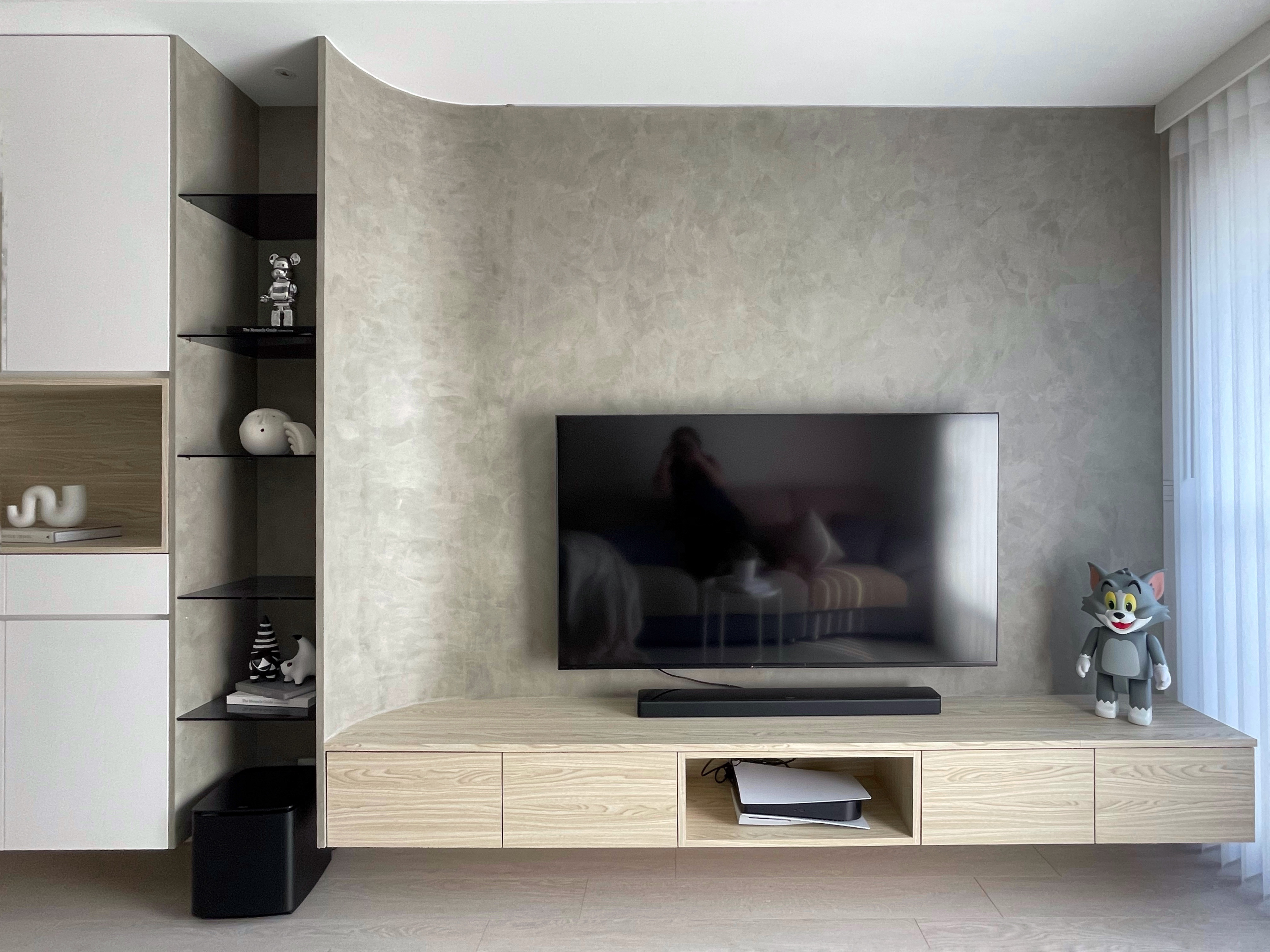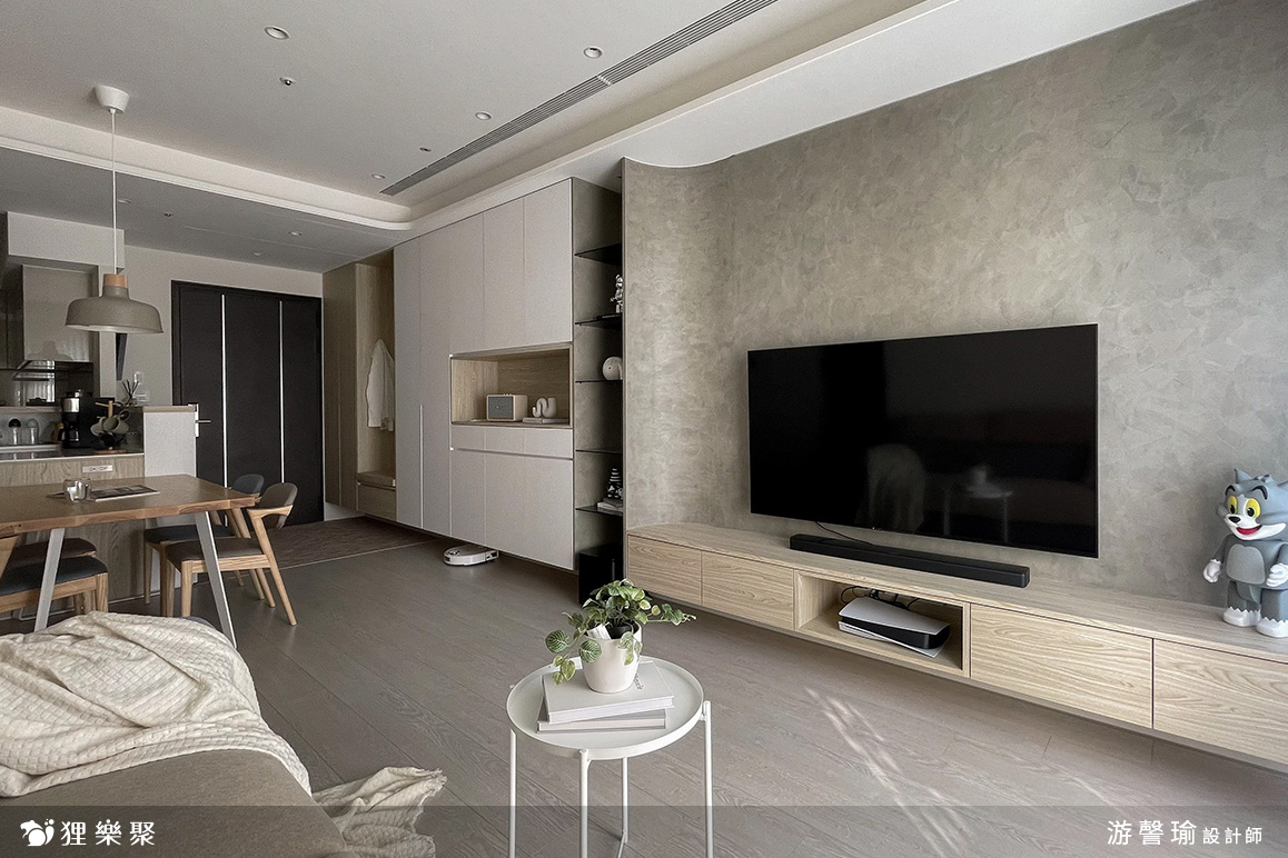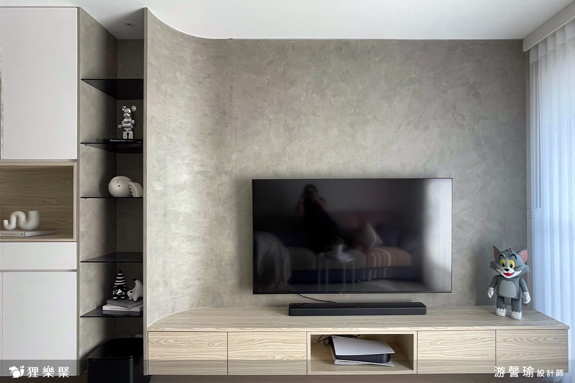 ▲ 電視牆背板、電視櫃皆使用圓弧元素