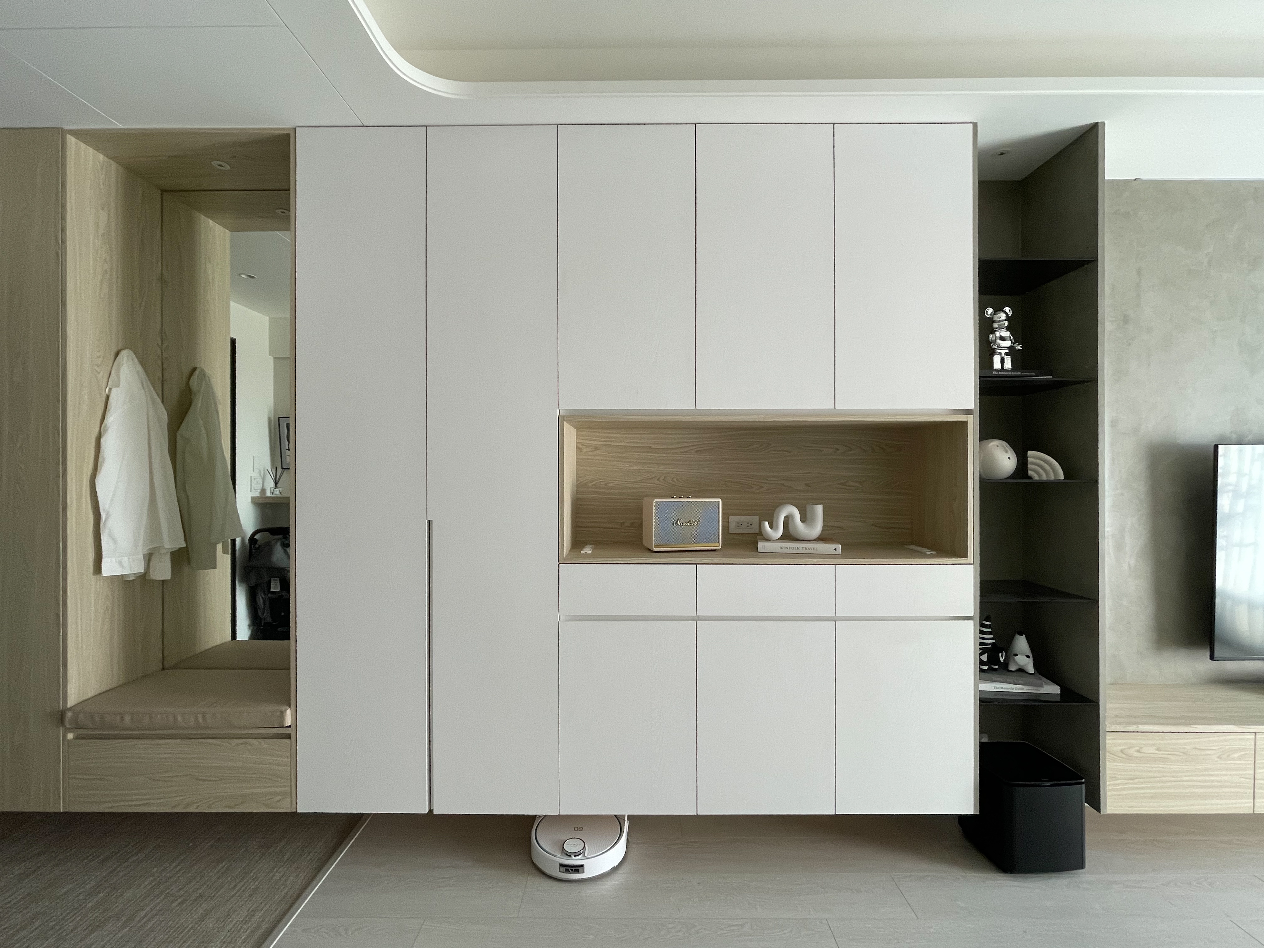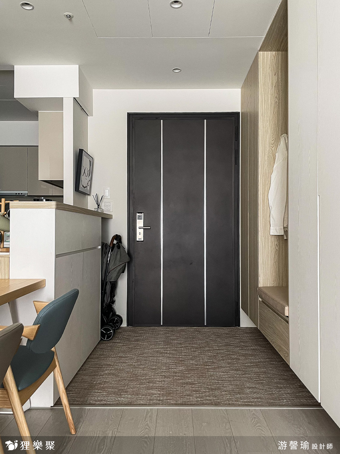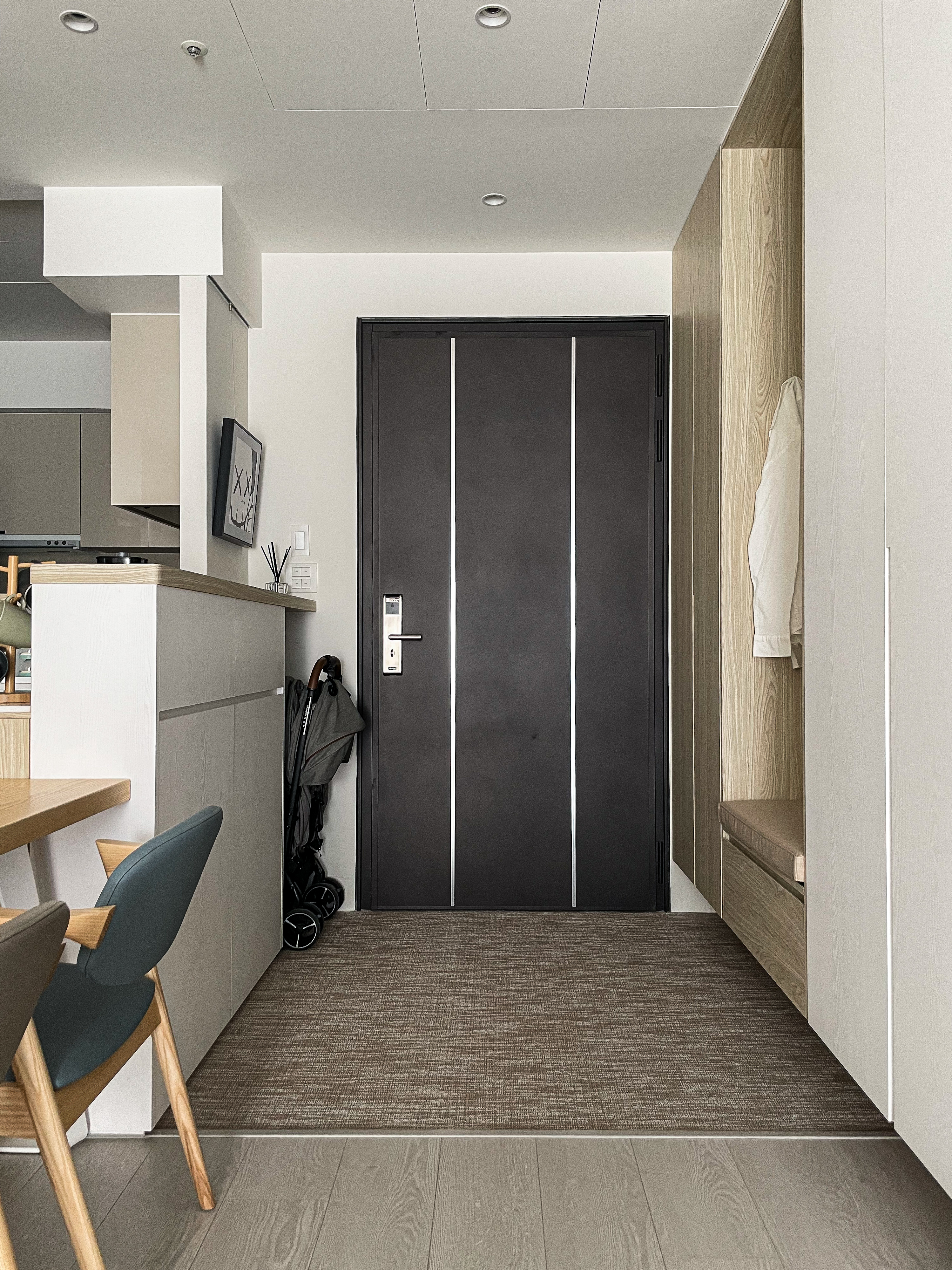 因為先生希望玄關可以有落塵區,設計師選擇在原有地坪磁磚上貼附波龍地毯,並且挑選與室內超耐磨木地板相近色。玄關與廚房相隔的中島吧檯,設計師將對外的正面規劃為小孩的使用空間,未來上學後可以放置書包、餐袋、鞋子,連收納櫃門片暗把手高度,都特地為了符合學齡兒童使用而設計。玄關側邊設置了玄關櫃,並附有吊衣桿與穿衣鏡作為污衣櫃,讓在外忙碌奔波一天的家人,回到家可以將外出用服、外套等掛在此處,不將灰塵帶入房間中,出門時也可以在穿衣鏡前檢視、整理自己的穿著。