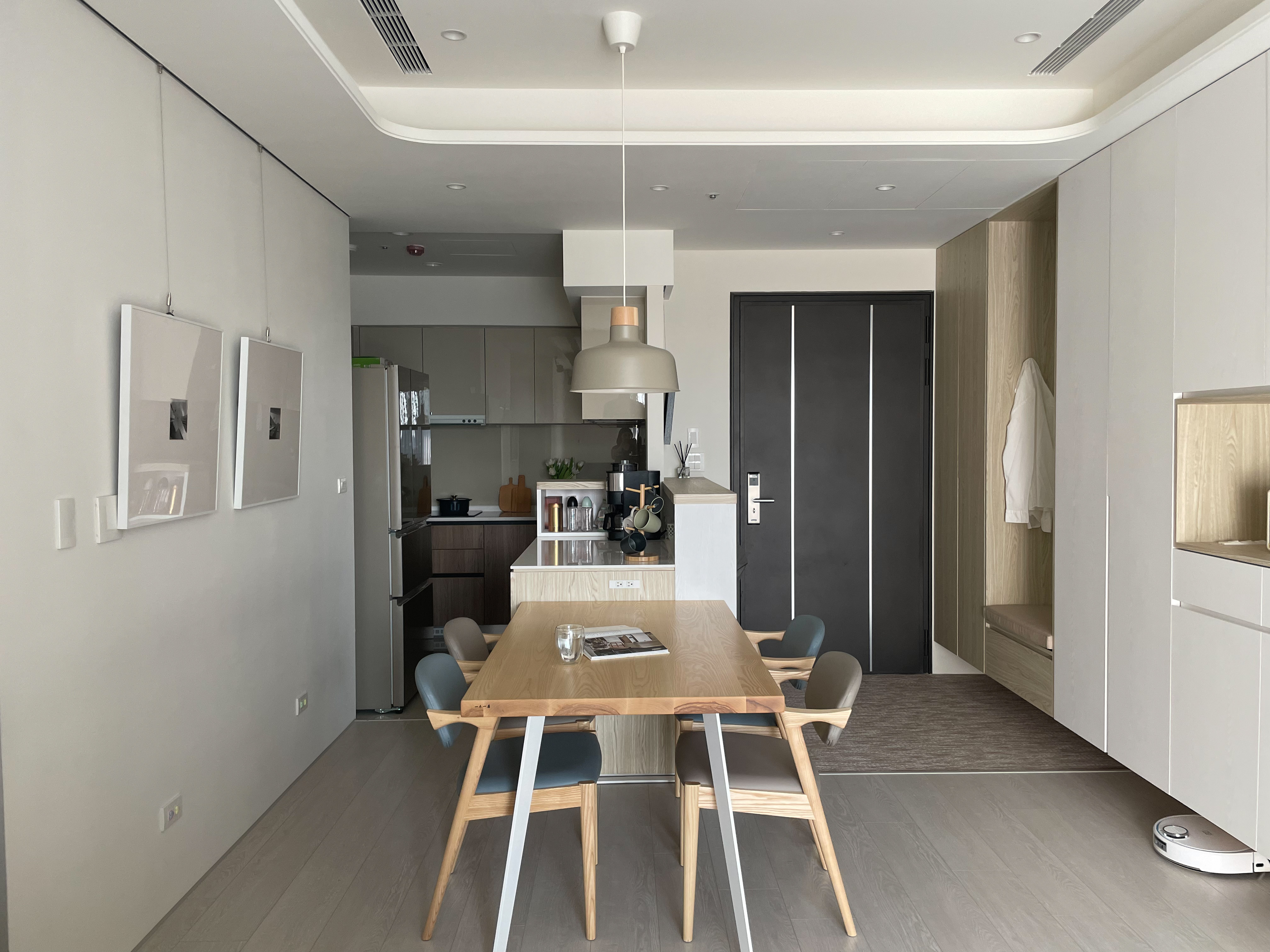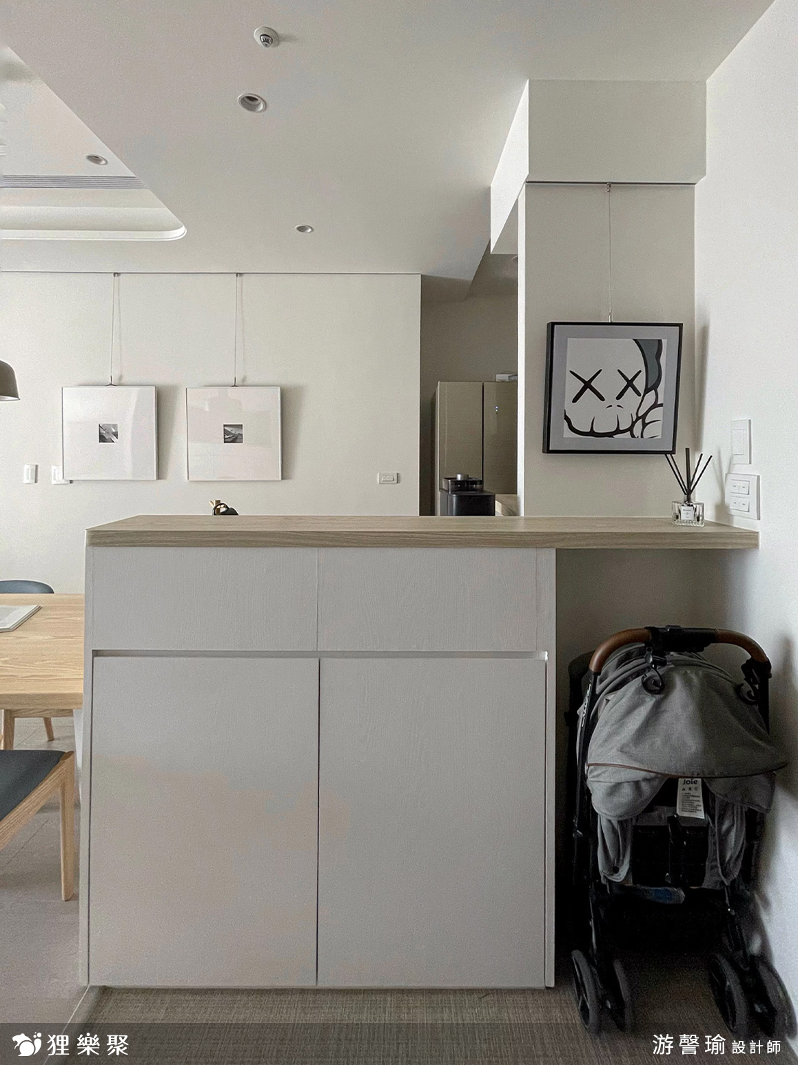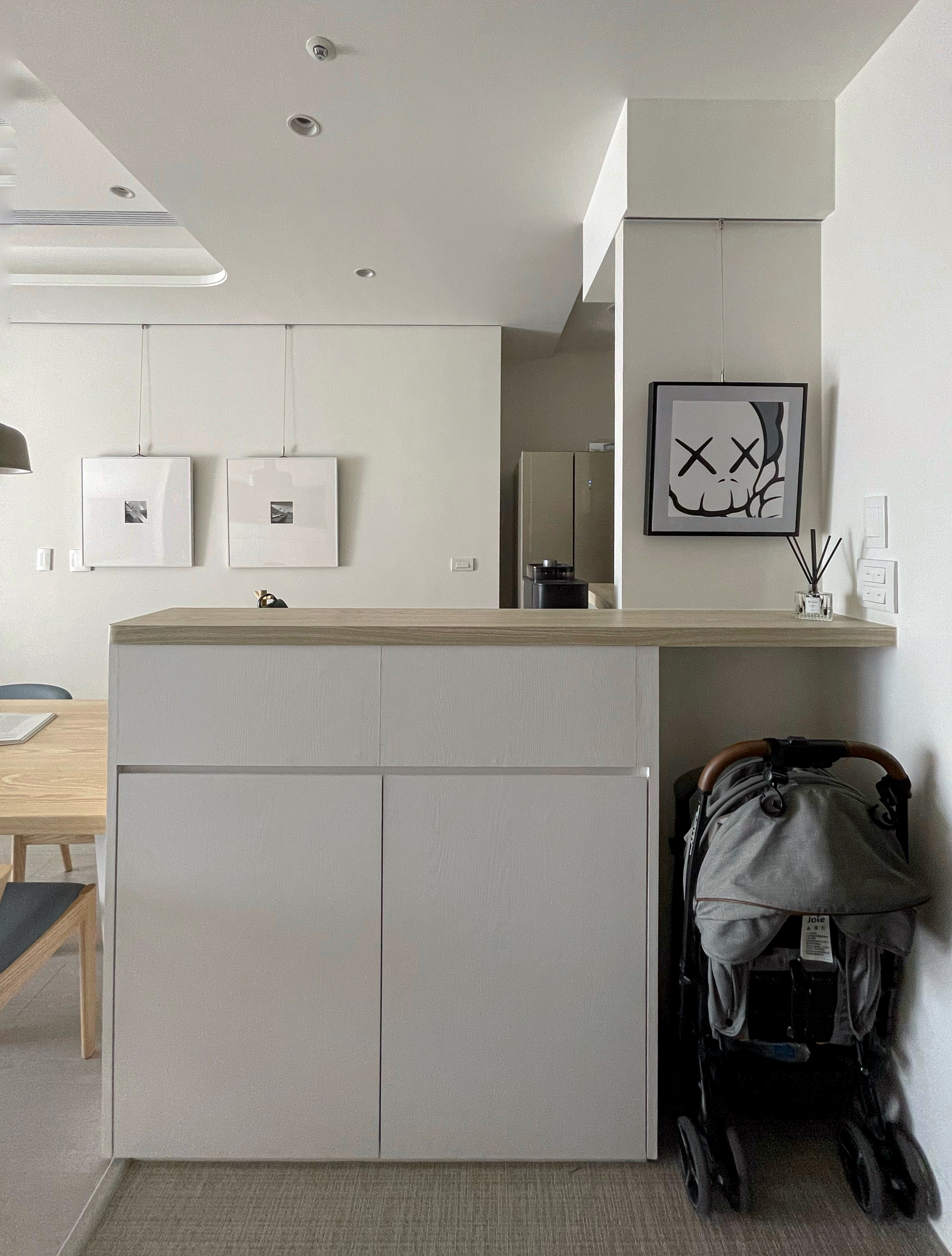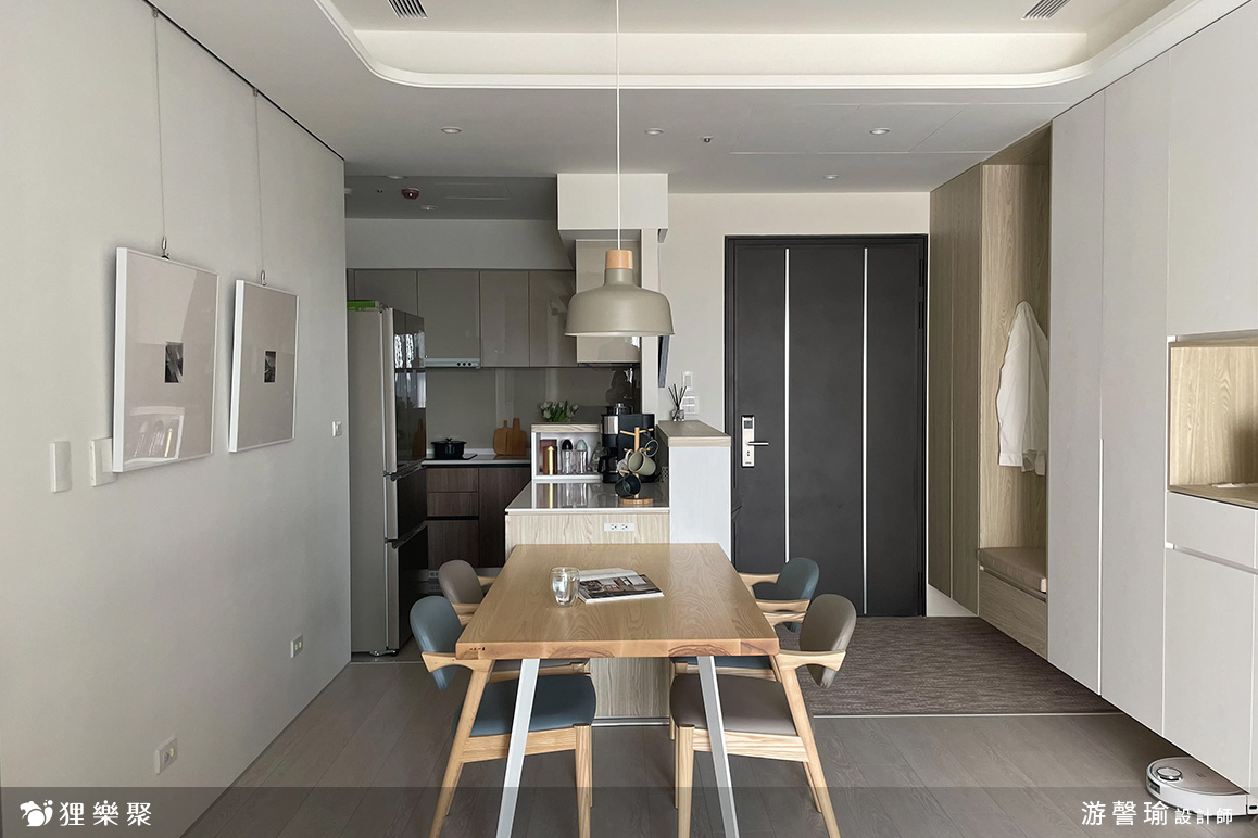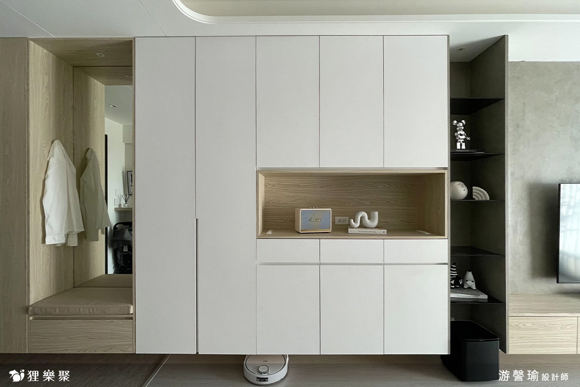 玄關與廚房相隔的中島吧檯,設計師將對外的正面規劃為小孩的使用空間,未來上學後可以放置書包、餐袋、鞋子,連收納櫃門片暗把手高度,都特地為了符合學齡兒童使用而設計。玄關側邊設置了玄關櫃,並附有吊衣桿與穿衣鏡作為污衣櫃,讓在外忙碌奔波一天的家人,回到家可以將外出用服、外套等掛在此處,不將灰塵帶入房間中,出門時也可以在穿衣鏡前檢視、整理自己的穿著。