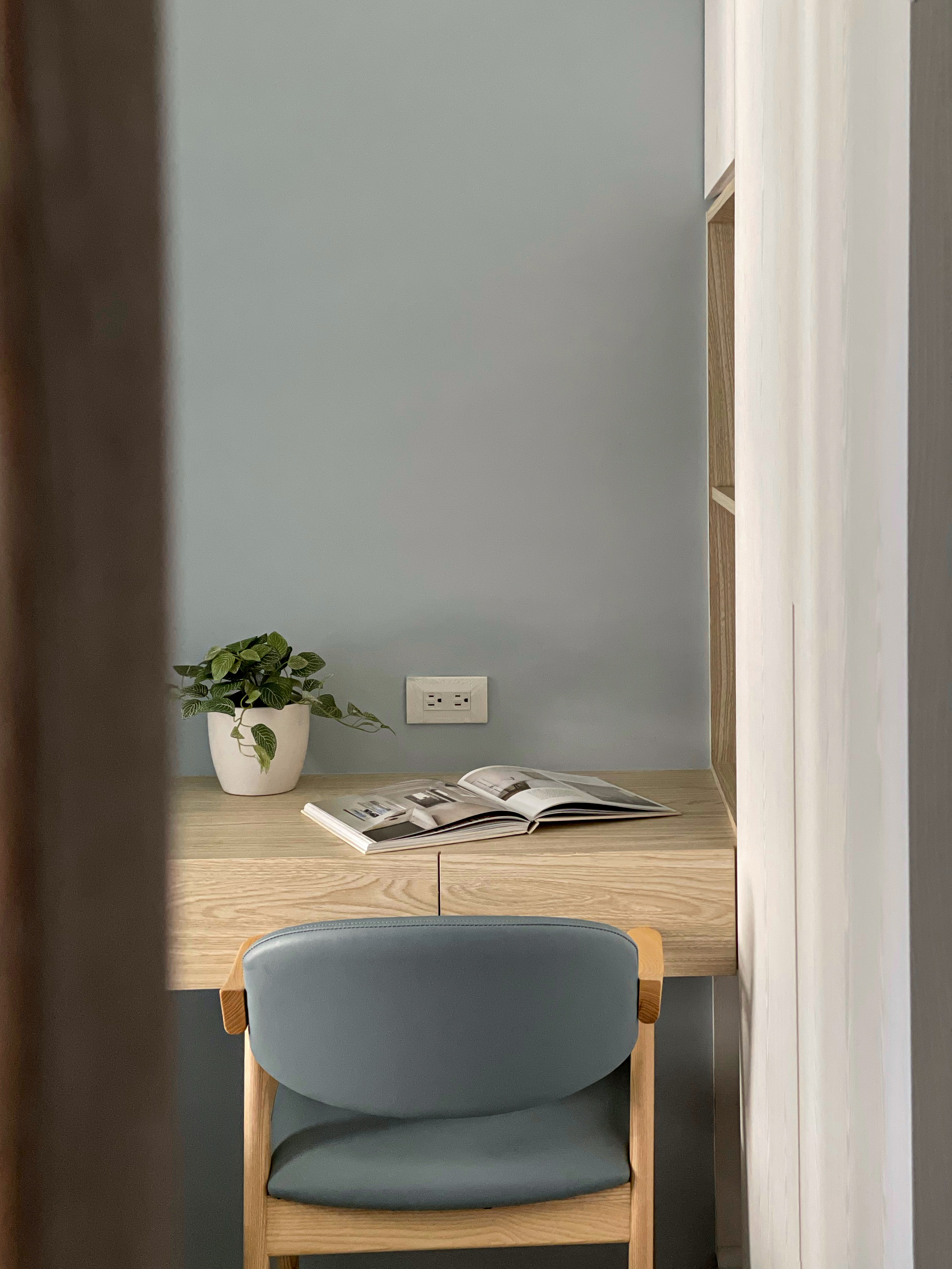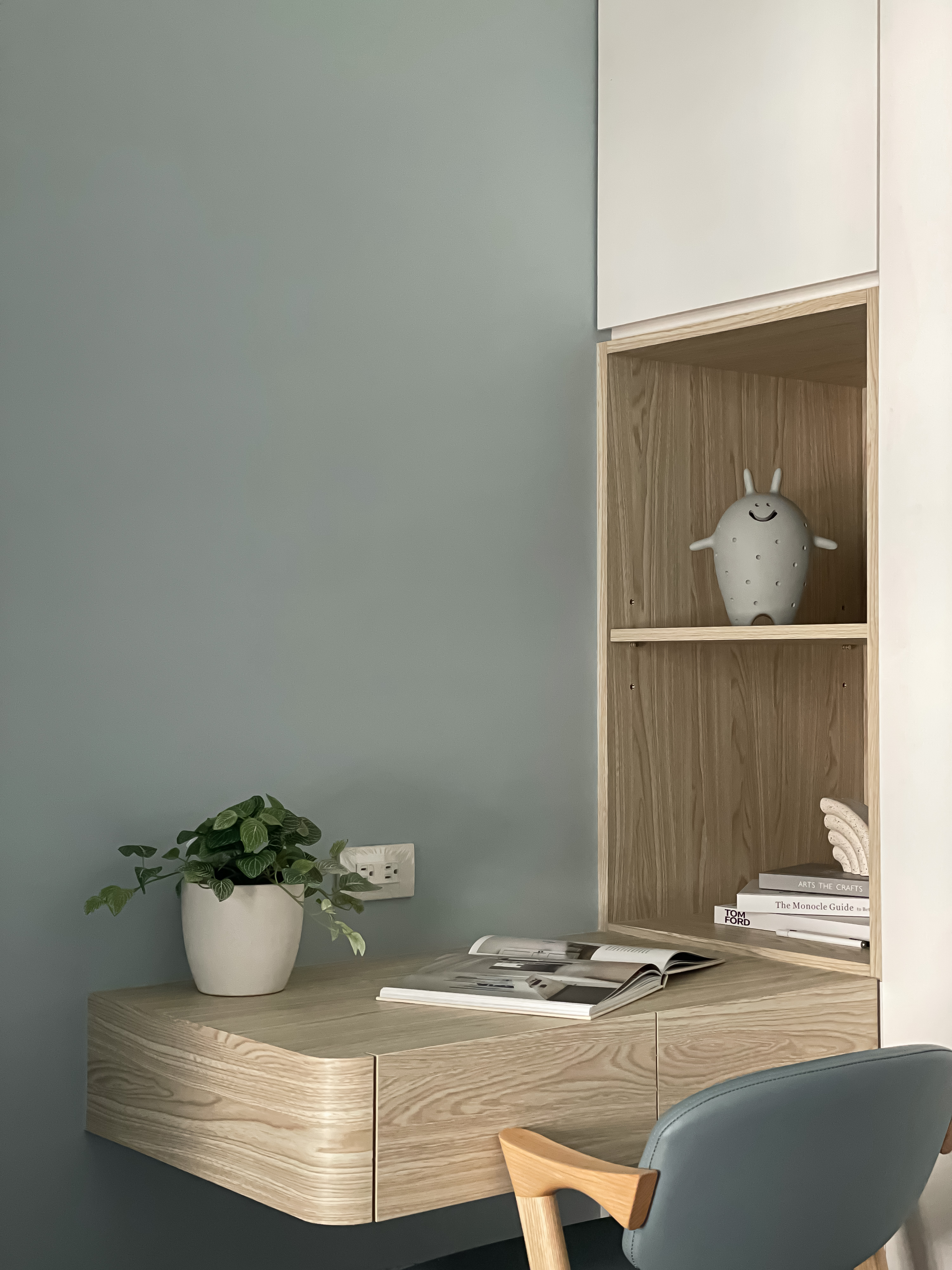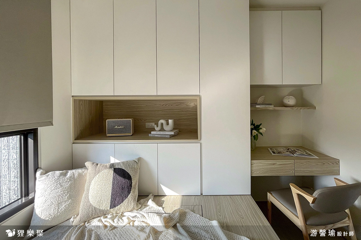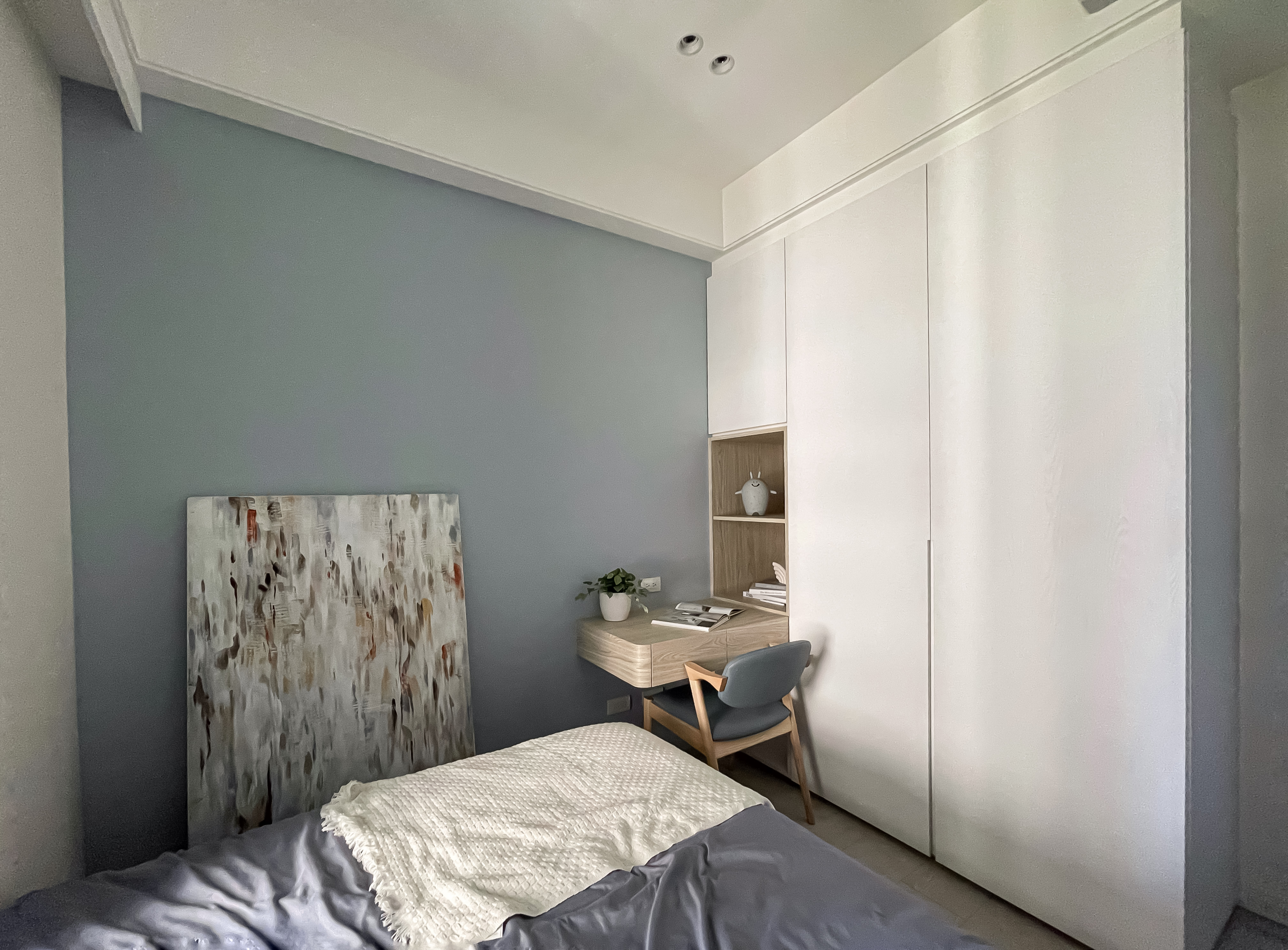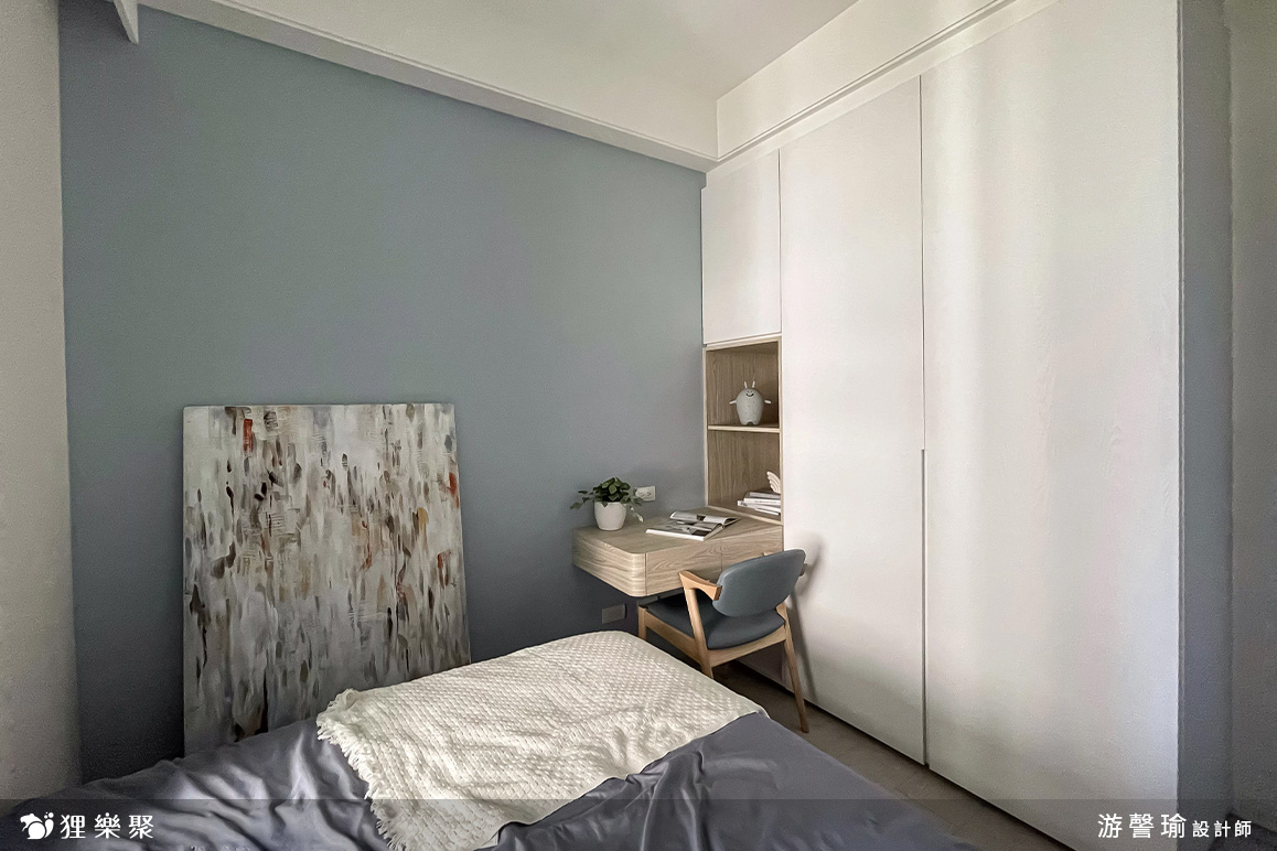 次臥室整體色系採用灰藍色為主題,不走一般較活潑的兒童房設計,而是能夠使用至成年後也能符合年齡的中性設計,白色系統櫃簡潔明亮,整體十分乾淨俐落,在書桌的邊緣做了圓角設計,不只防止小孩碰撞,看起來也符合整體柔和美觀的調性。客房設計規劃為臥榻式,可收納最大尺寸行李箱,方便留宿的客人使用,牆面保留大面積留白不特別刷跳色漆,方便直接客人使用投影機投影觀賞影片。