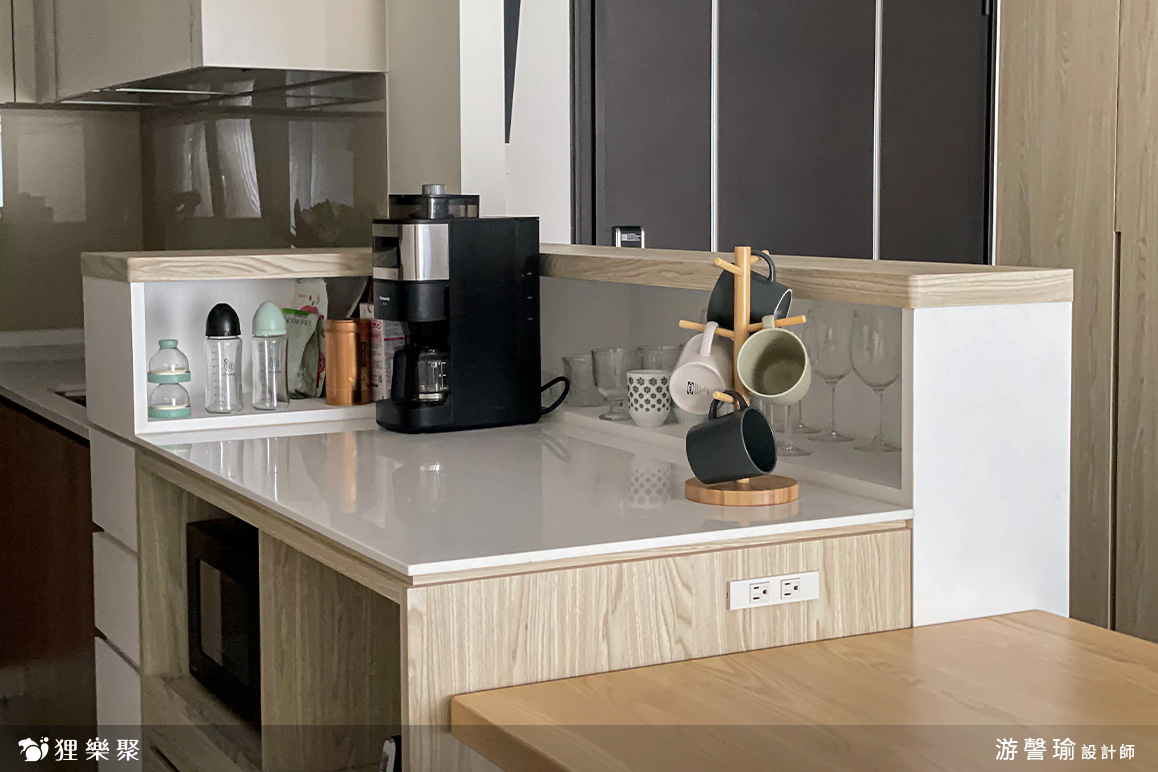 原有廚房隔間不符合家人的使用習慣,設計師將其拆除切割,調整規劃為開放式中島,檯面上的收納設計,可以將奶粉罐、奶瓶、咖啡罐、高腳酒杯等物品乾淨收納,一眼望去不會見到雜亂無章的生活雜物,讓公共空間的視線範圍更為清爽整潔,中島也規劃了電器櫃擺放小家電,其餘的部分則規劃為抽屜式收納。餐桌椅緊鄰開放式中島旁,除了可以做為不同區域的軟性劃分,在料理過程中也能化作臨時備餐檯使用。