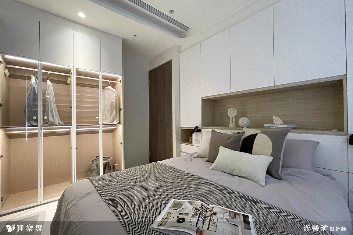 主臥室衣櫃經設計師夫妻討論生活習慣後,將收納方式全數設計為吊衣桿的型式,並使用北二高開門式玻璃鋁框門,讓大量體的衣櫃視覺效果更輕量化。而床頭設計規劃床背櫃,不但左右皆可以收納夫妻倆的長大衣、襪子、貼身衣褲,中間上下收納櫃還可以收納使用頻率較低的換季衣物或是換季寢具。