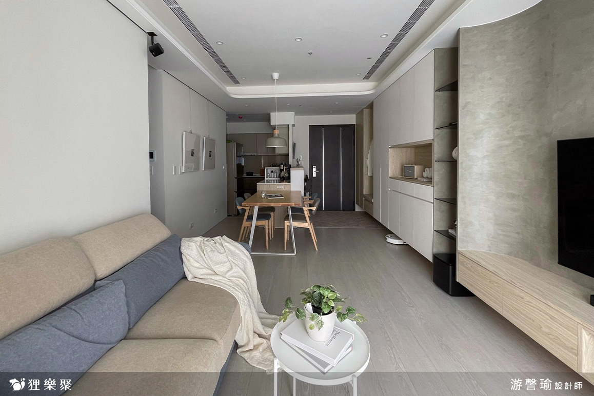 本案是設計師的自住宅,設計師對於自己居住需求的規劃十分詳盡。雖然在購屋階段時已經來不及客變,但仍結合專業知識與設計創意,滿足了自己與家人的所有需求,不管是自身偏好的圓弧元素,或是先生希望的玄關落塵區,就連小孩未來上學所需的機能規劃,設計師都做到盡善盡美。機能與美感並重設計的公領域