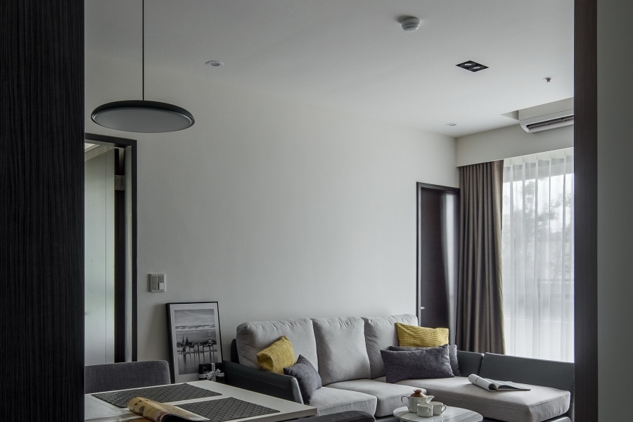 現代風的色調整體偏冷色系,可以利用布質的家具或軟件來中和,客廳沙發選擇淺灰色的布沙發,搭配深灰色和芥末黃的抱枕,成為家中的小亮點,再搭配餐廳主燈散發出的溫暖黃光,完成了屋主獨特的質感居家。