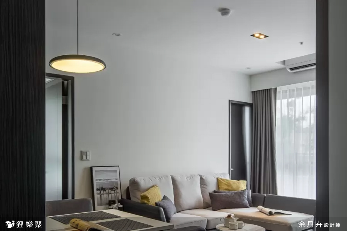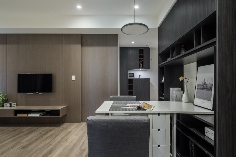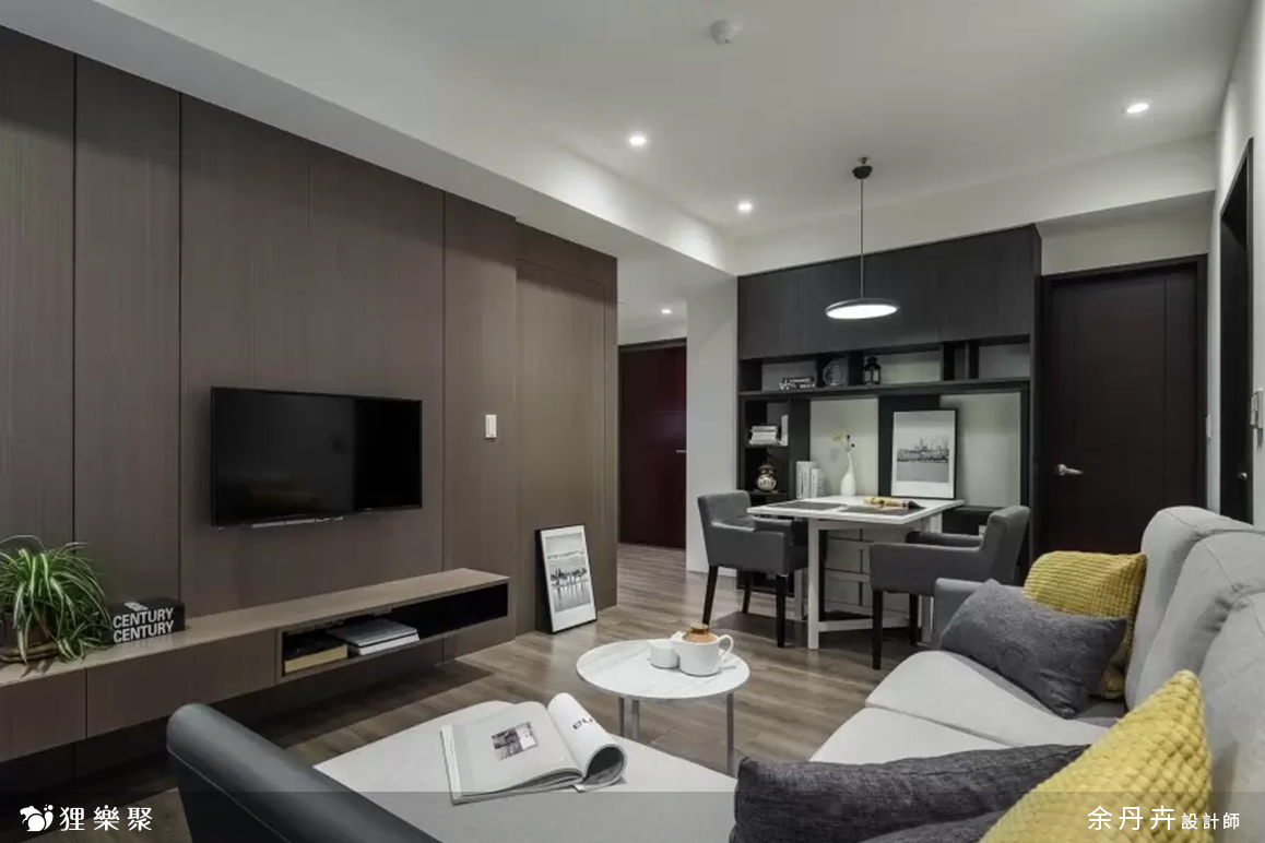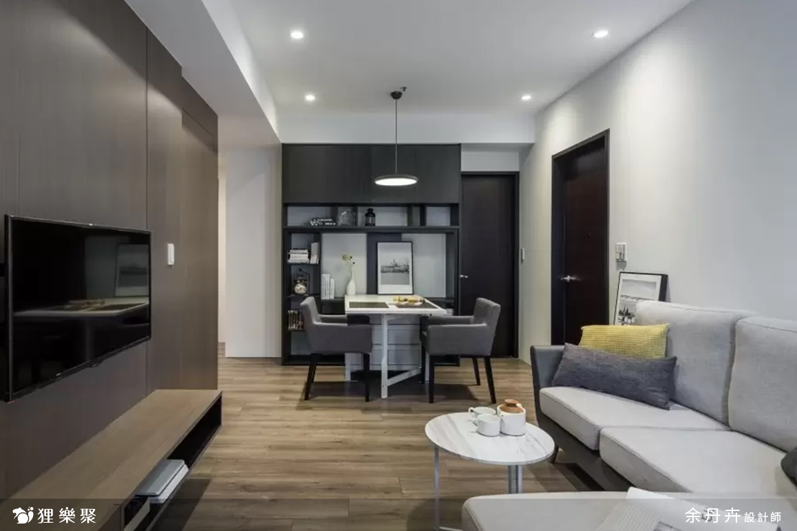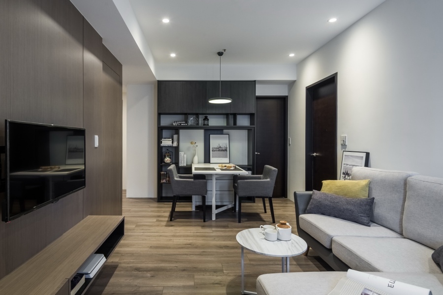 由於早出晚歸、外食、喜歡吃飯配電視、或是頂客族夫妻增多等因素,許多現代人對於大餐桌的需求漸漸降低,考慮到屋主的使用習慣,餐桌設計得簡單小巧就已經足夠使用。客廳因為是長形,擺放太多家具或櫃體會顯得雜亂,因此在設計上把空間留給L型沙發,另外在旁邊配搭桌椅,一樣能多元運用,也不會受到空間限制。