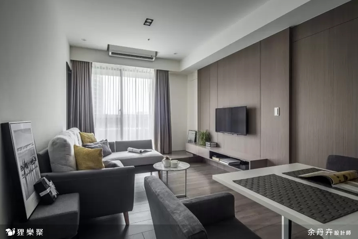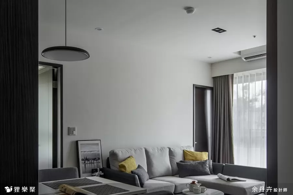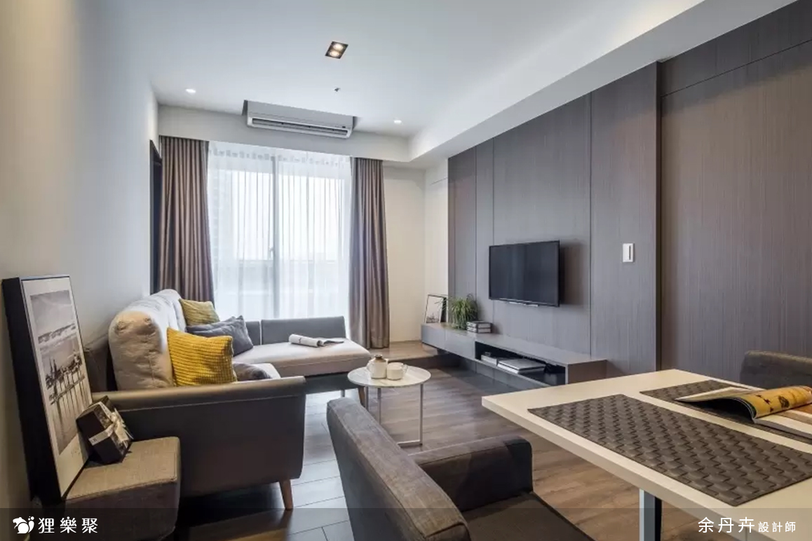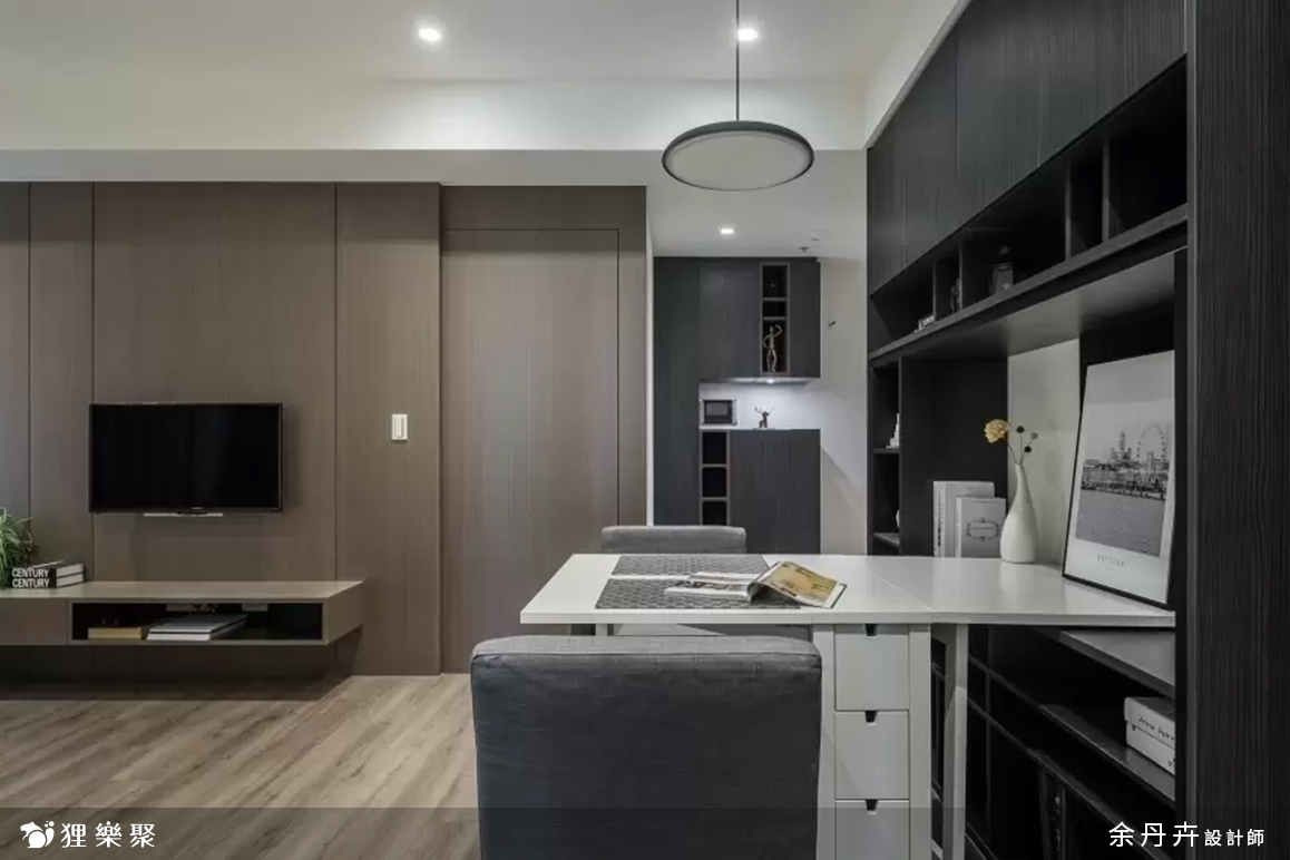 由於早出晚歸、外食、喜歡吃飯配電視、或是頂客族夫妻增多等因素,許多現代人對於大餐桌的需求漸漸降低,考慮到屋主的使用習慣,餐桌設計得簡單小巧就已經足夠使用。客廳因為是長形,擺放太多家具或櫃體會顯得雜亂,因此在設計上把空間留給L型沙發,另外在旁邊配搭桌椅,一樣能多元運用,也不會受到空間限制。