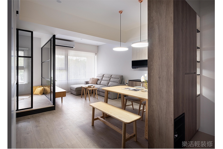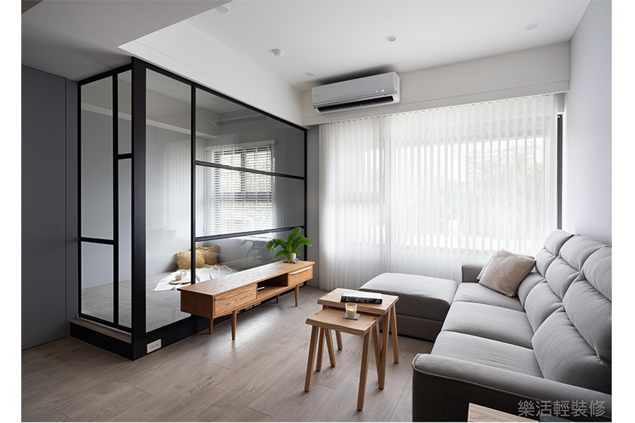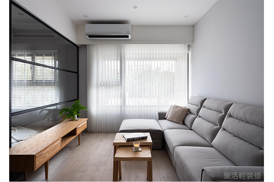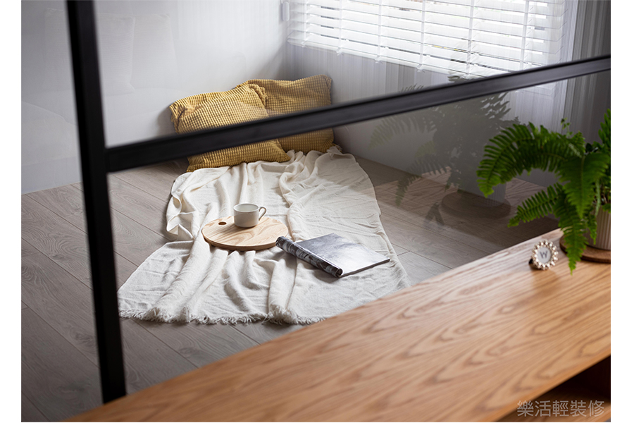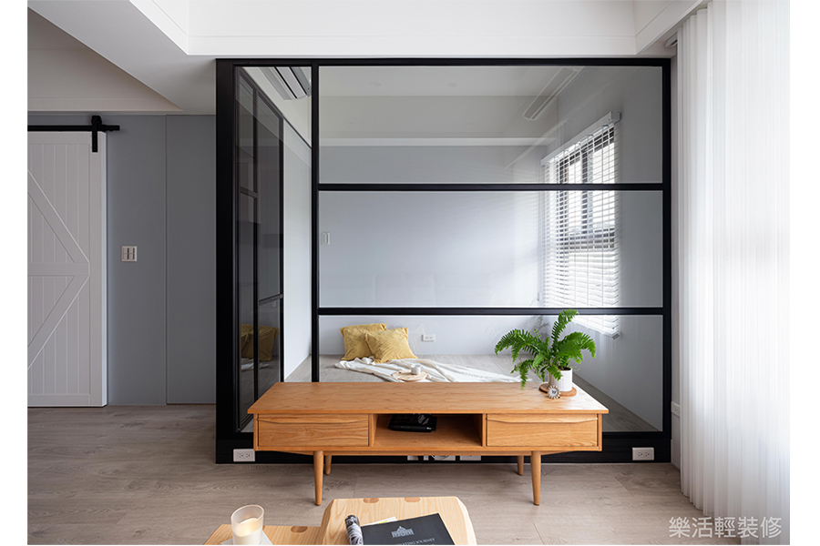 將客廳後方最小的房間隔間拿掉,改成透明玻璃做區隔,不但保留一個房間,也同時讓空間感提升,更讓家中整體採光更寬闊明亮。
