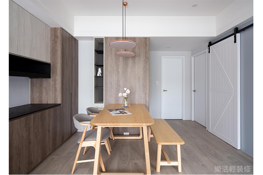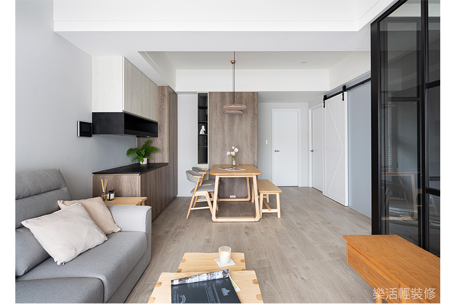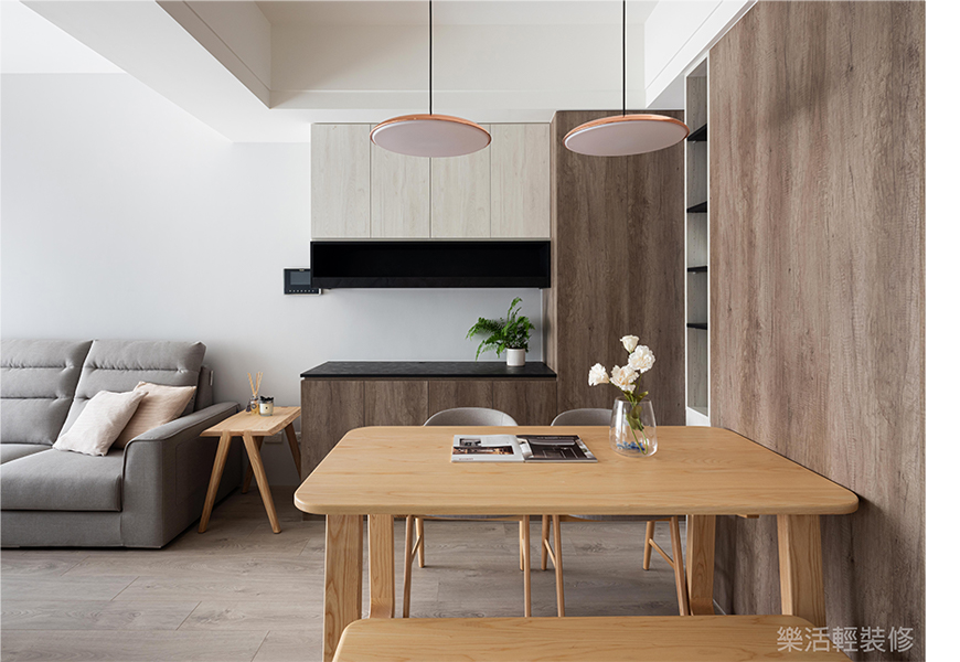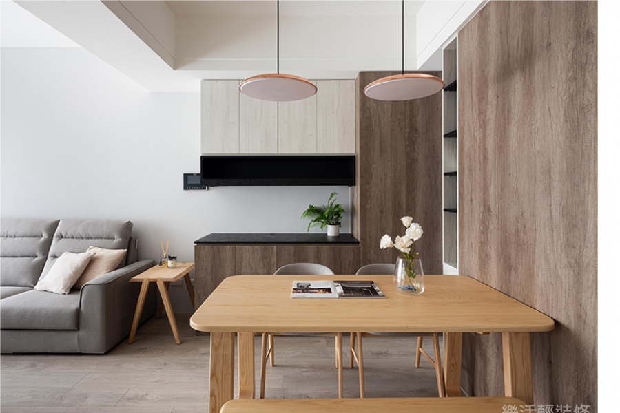 空間感受:兩個人的世界簡單平穩,一起休憩在L型沙發的日常,計劃著未來的新成員加入,填滿既有的寬闊空間,幻想著坐滿餐桌的嘻鬧聲。
