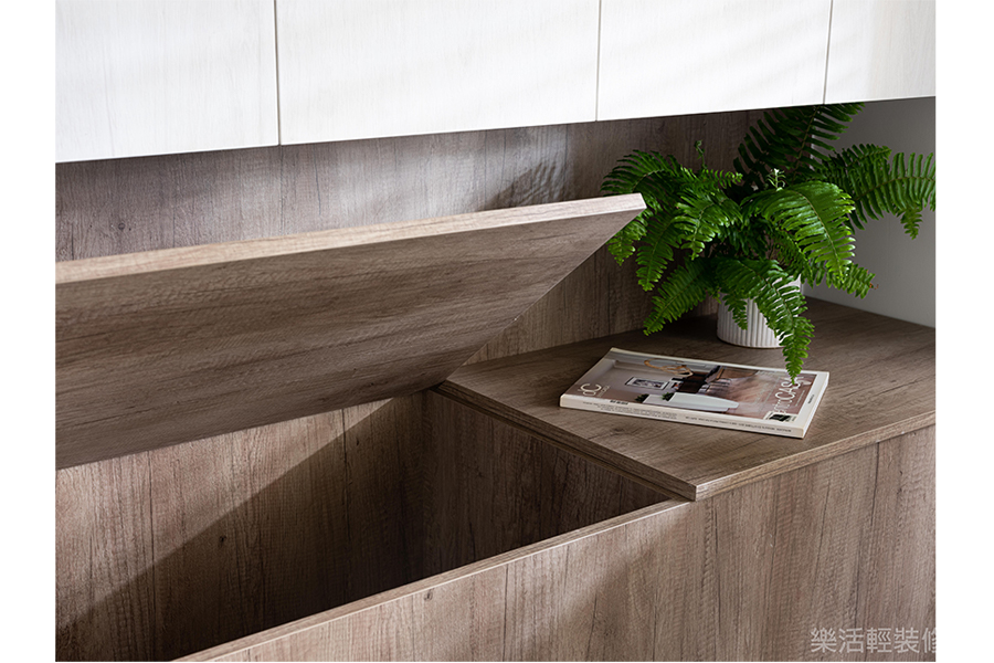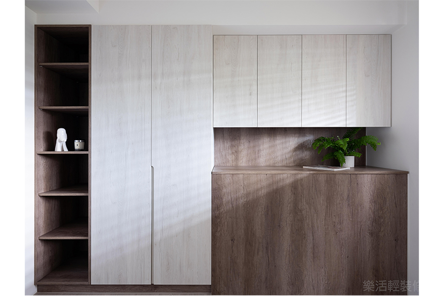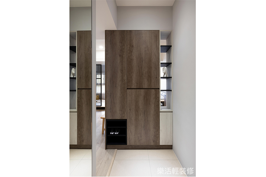 因為購屋者有收集愛鞋的習慣,所以特別利用大門對向一處轉角牆面增設鞋櫃,並且規劃地磚當作落塵區,與室內其他地方的超耐磨地板做出區隔。