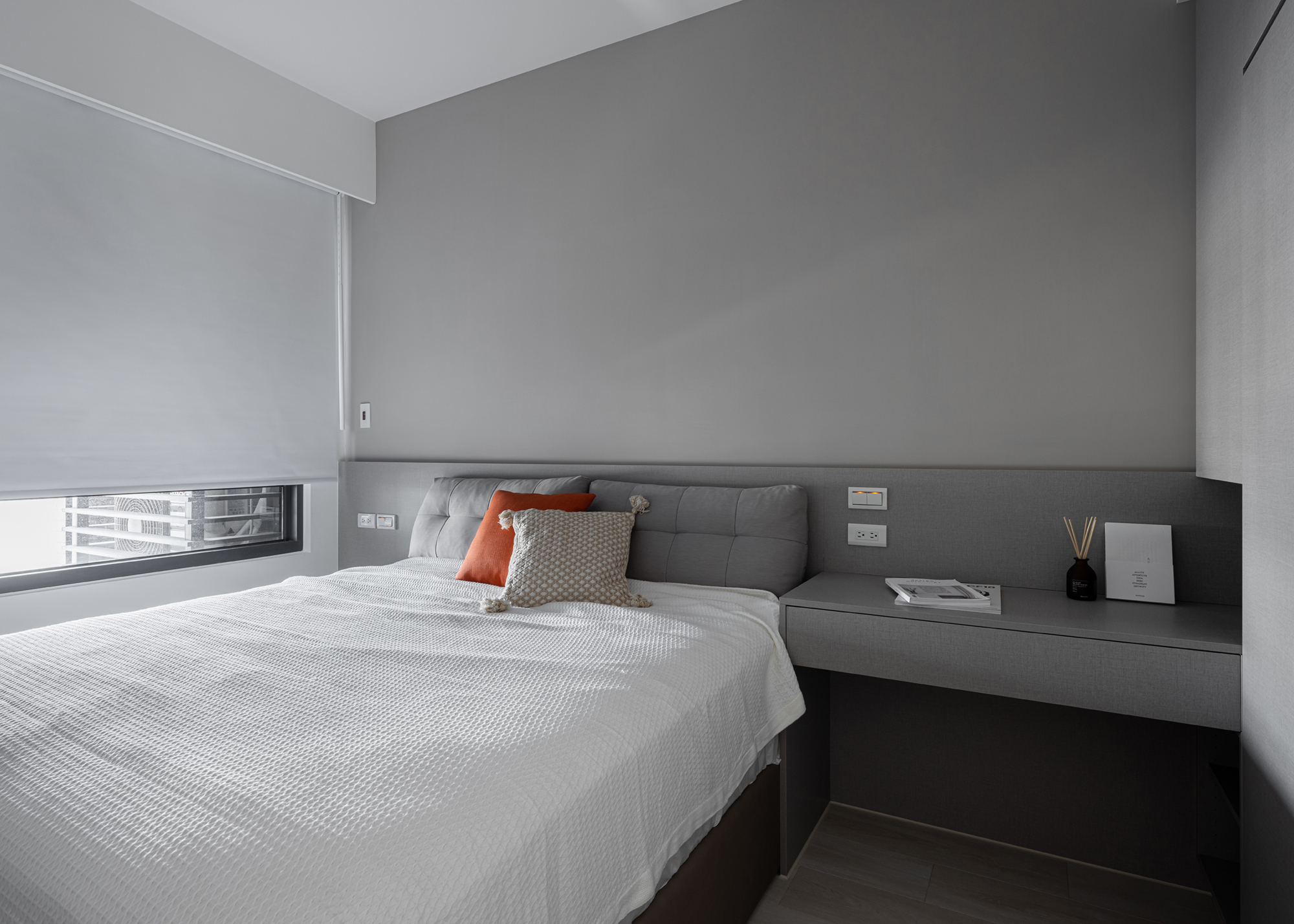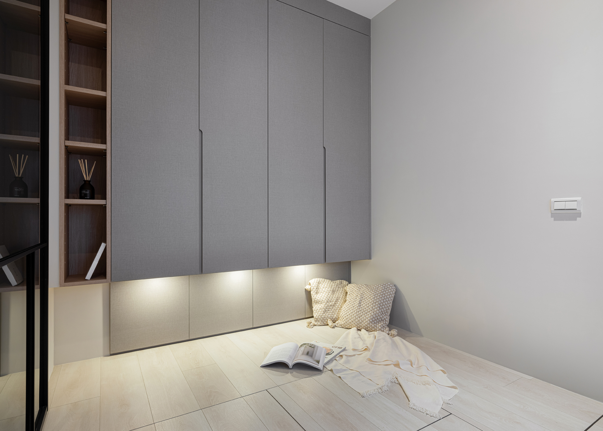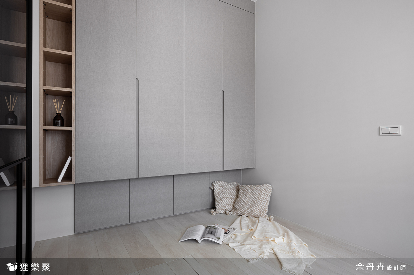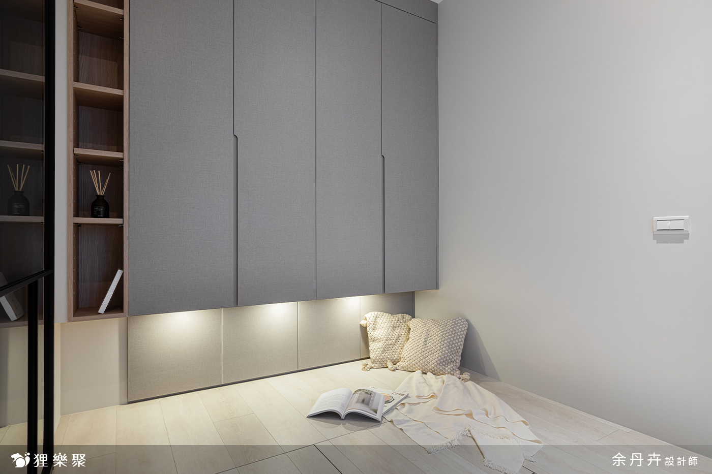 主臥需求為Queen Size床組、化妝桌,為此,設計師安排了一體成形的衣櫃與化妝桌,不僅有足夠的檯面空間,桌面內凹部分也可放化妝品,以極簡風裝潢線條提升整體空間坪效。而牆面退縮後,次臥室因空間有限,設計師以和室概念配置空間,設計了底部收納與衣櫃,不論是收放玩具、厚重衣物、棉被寢具都很適用,若孩子出生僅須添購床墊即可使用。此外,也確保日後能有足夠的儲物空間收納嬰兒備品,以多元的收納機能完善五年內使用需求。