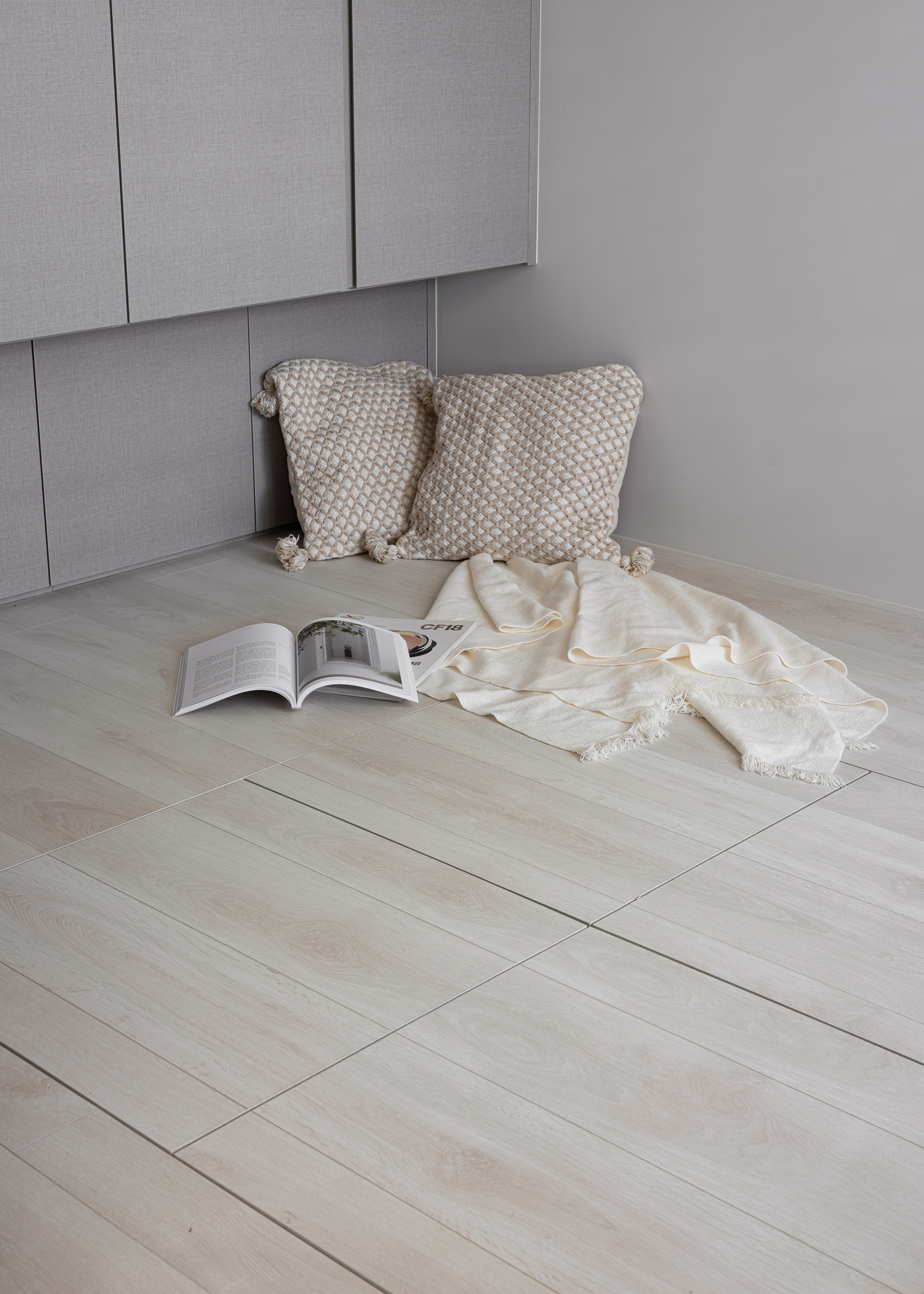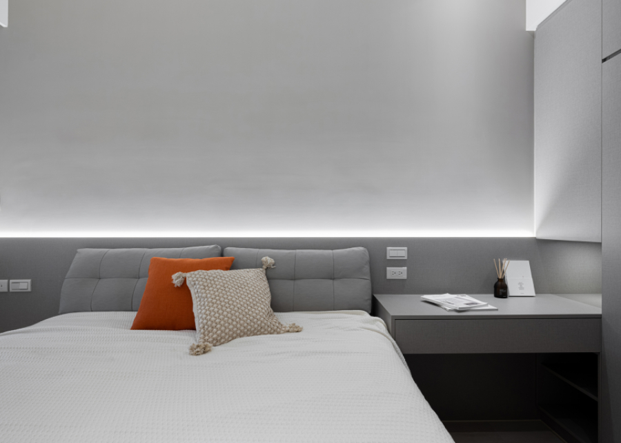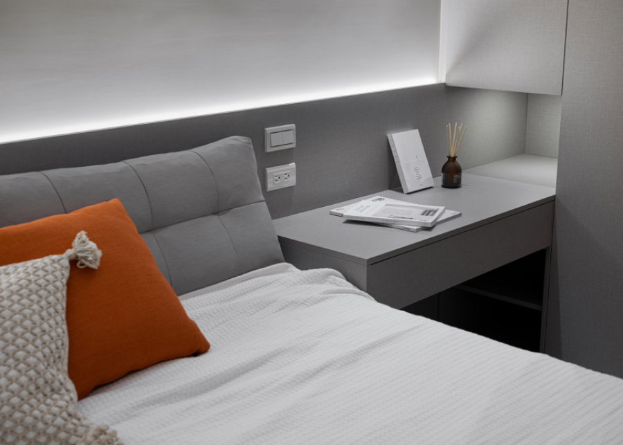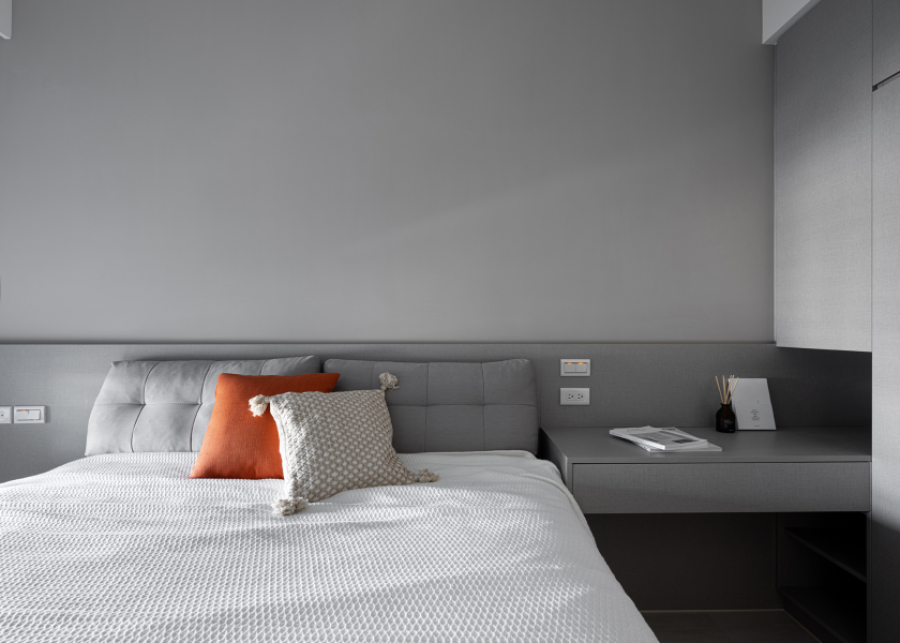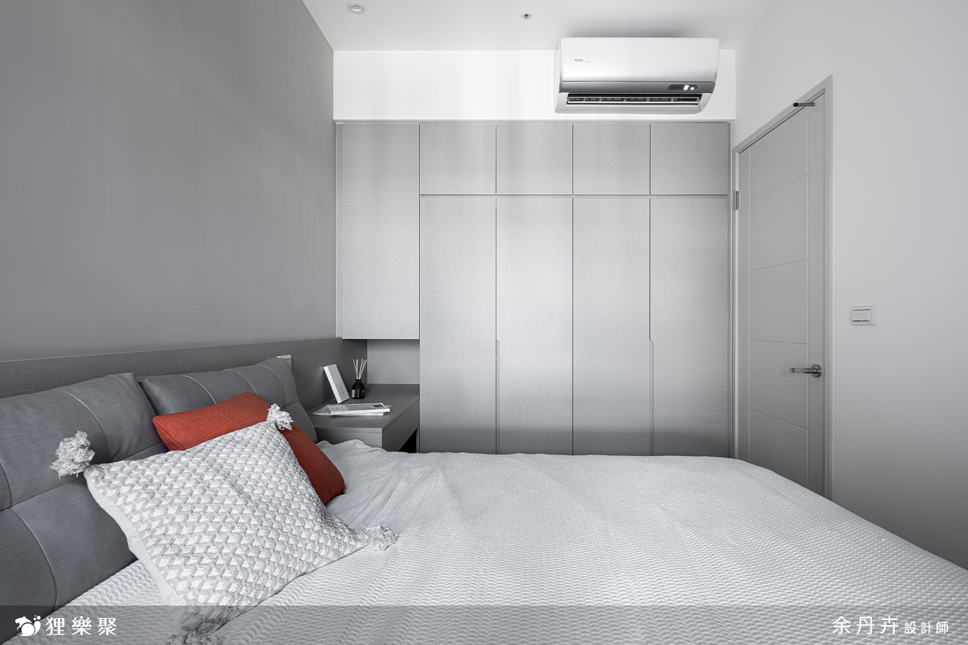 主臥需求為Queen Size床組、化妝桌,為此,設計師安排了一體成形的衣櫃與化妝桌,不僅有足夠的檯面空間,桌面內凹部分也可放化妝品,以極簡風裝潢線條提升整體空間坪效。而牆面退縮後,次臥室因空間有限,設計師以和室概念配置空間,設計了底部收納與衣櫃,不論是收放玩具、厚重衣物、棉被寢具都很適用,若孩子出生僅須添購床墊即可使用。此外,也確保日後能有足夠的儲物空間收納嬰兒備品,以多元的收納機能完善五年內使用需求。