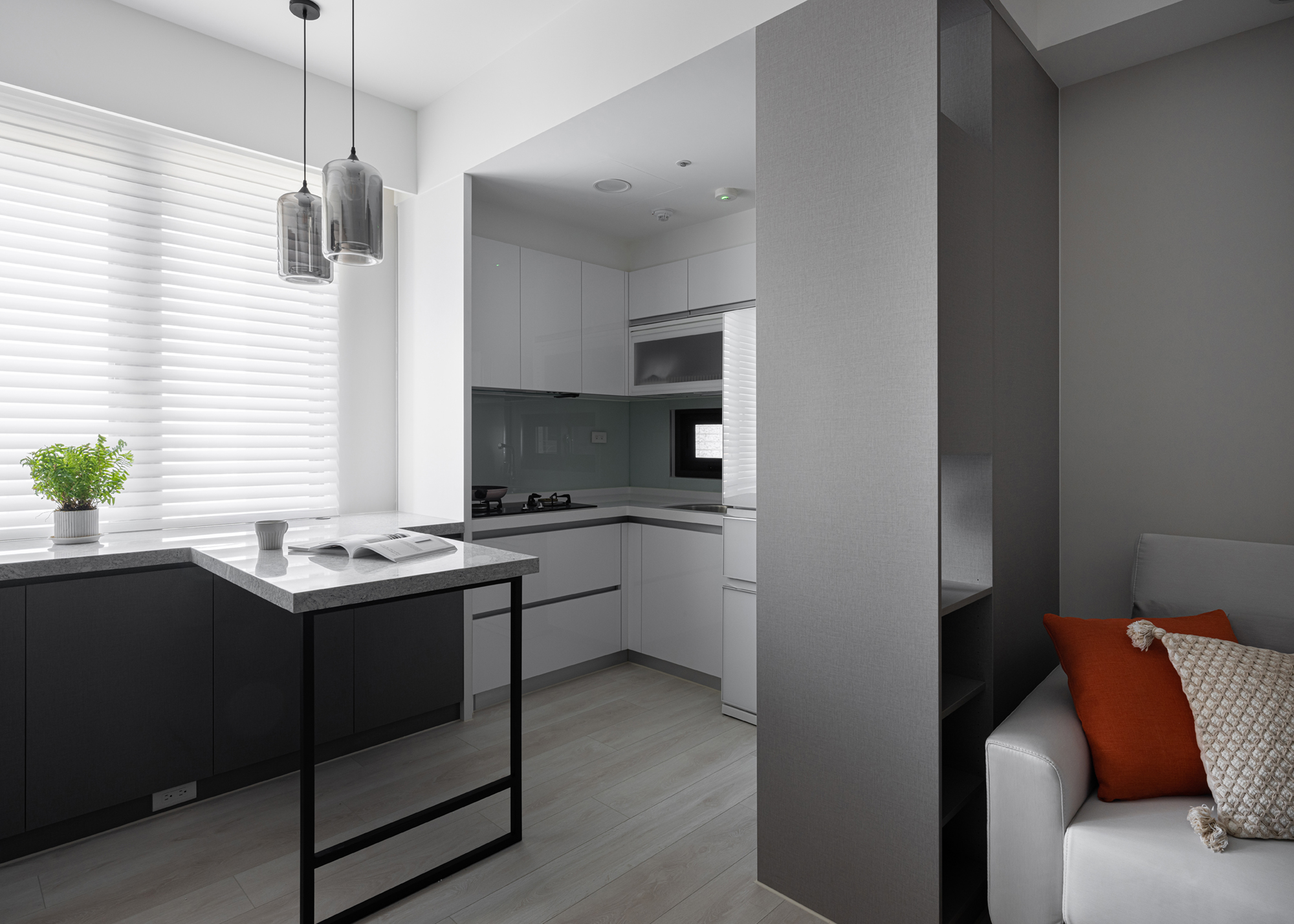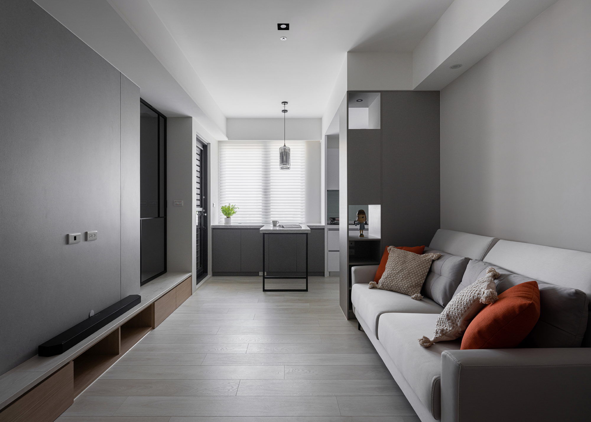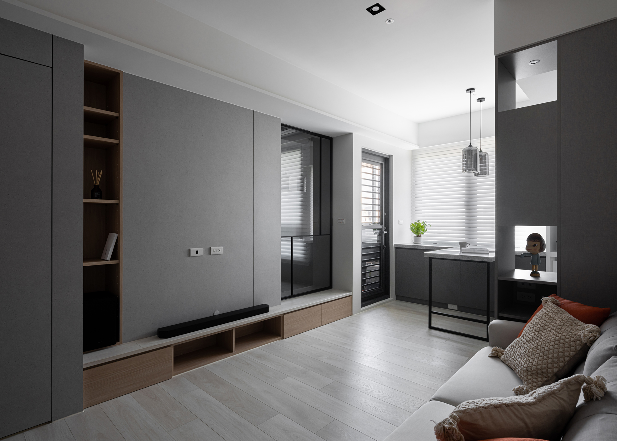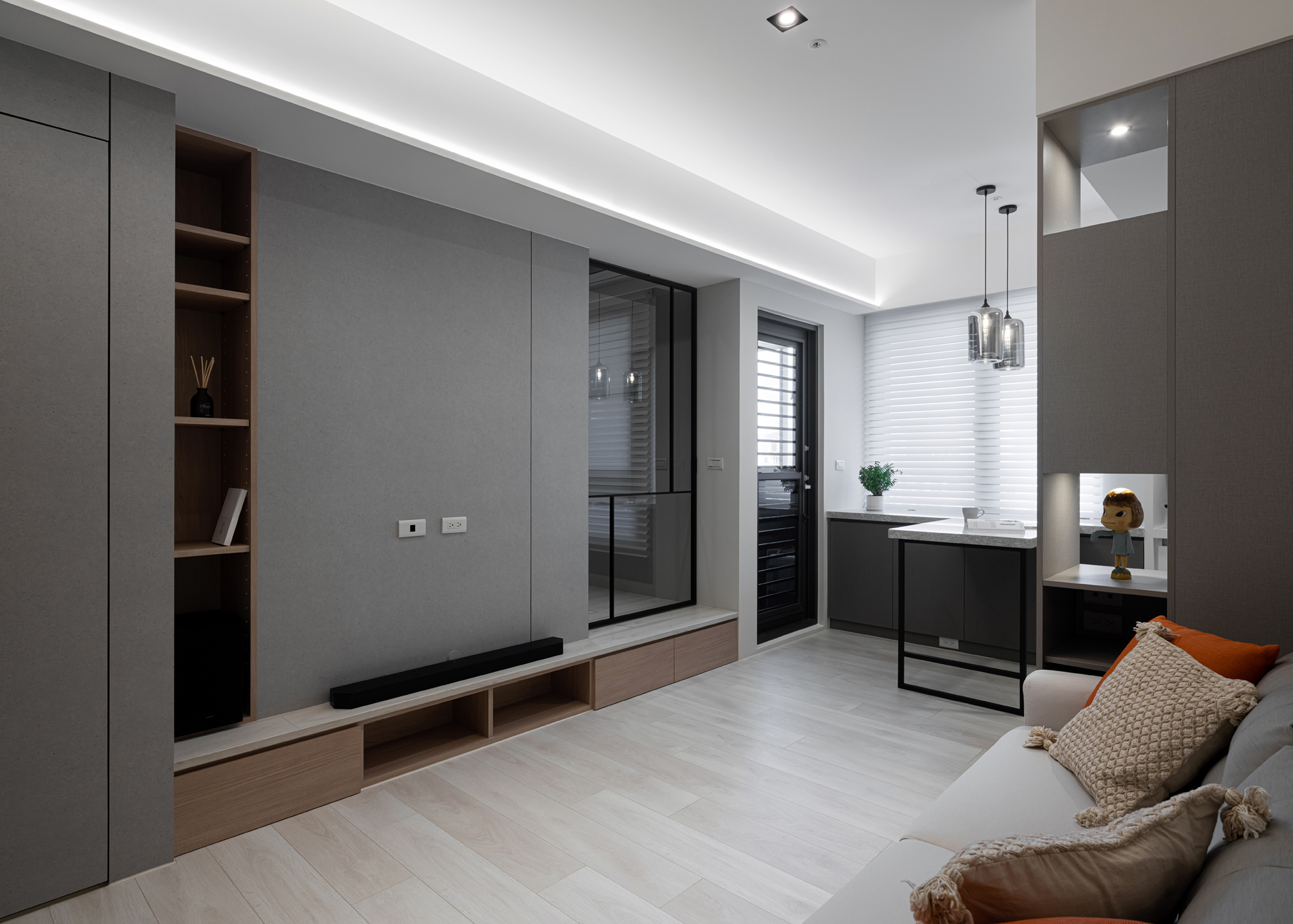 考慮到屋主未來可能會生小孩,因此配置了兩房格局,一房作為主臥使用,另一房則退掉隔間牆,以玻璃門片規劃作為彈性書房,若屋主未來有了孩子,則可隨時改為遊戲房或小孩房使用。但裝修丈量時,發現實體格局空間壓迫感太重,故設計師與屋主溝通採退縮方式雙面規劃,將原先退掉的隔間部分退縮30公分,將前方配置為電視牆使用,而延伸至房內的部分,則隱藏四方格可收納棉被等大型衣物,同時另外規劃玻璃拉門,使客廳空間更為開闊舒適。沙發一側的灰色櫃體為廚房區的電器櫃,60公分為電器置放區,而40公分改作穿透式櫃體,如此一來不僅能擺放展示物,也能引入光線,增添整體的明亮度,打造高機能的現代風小宅。