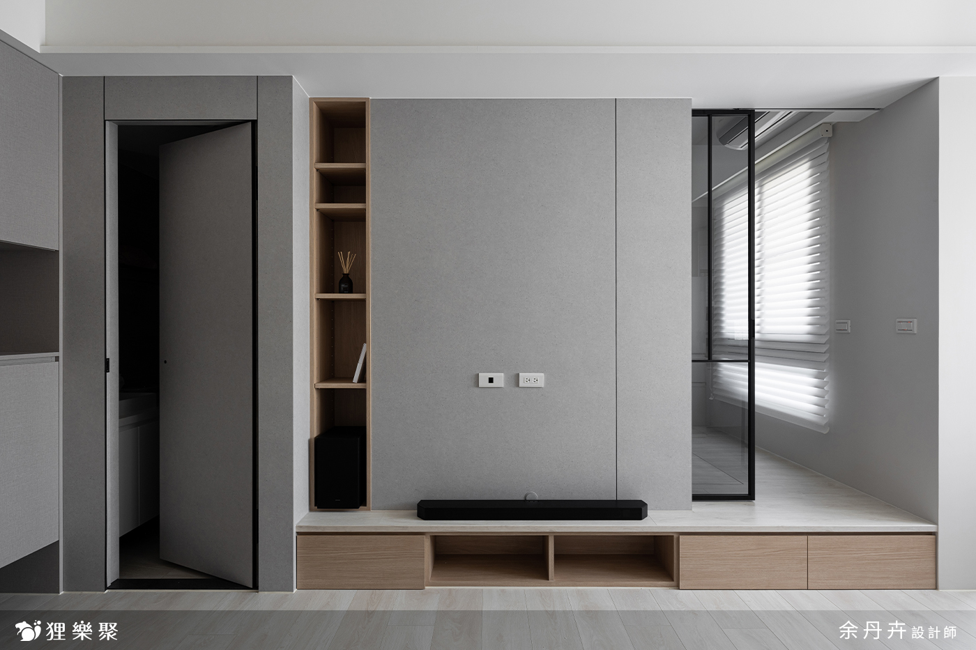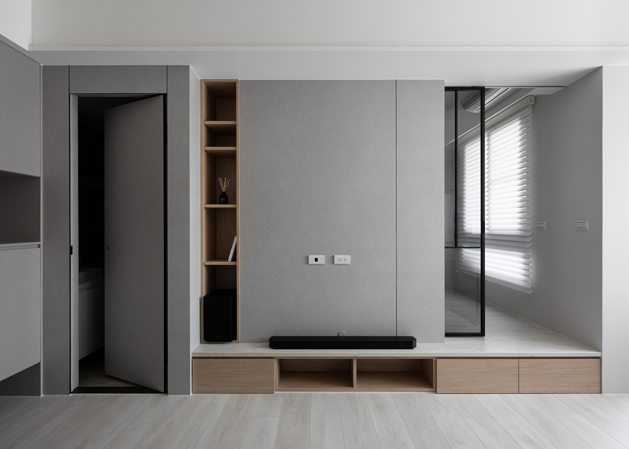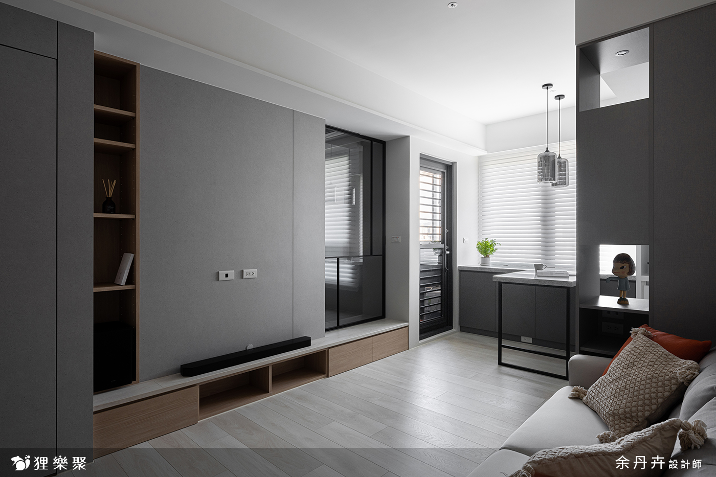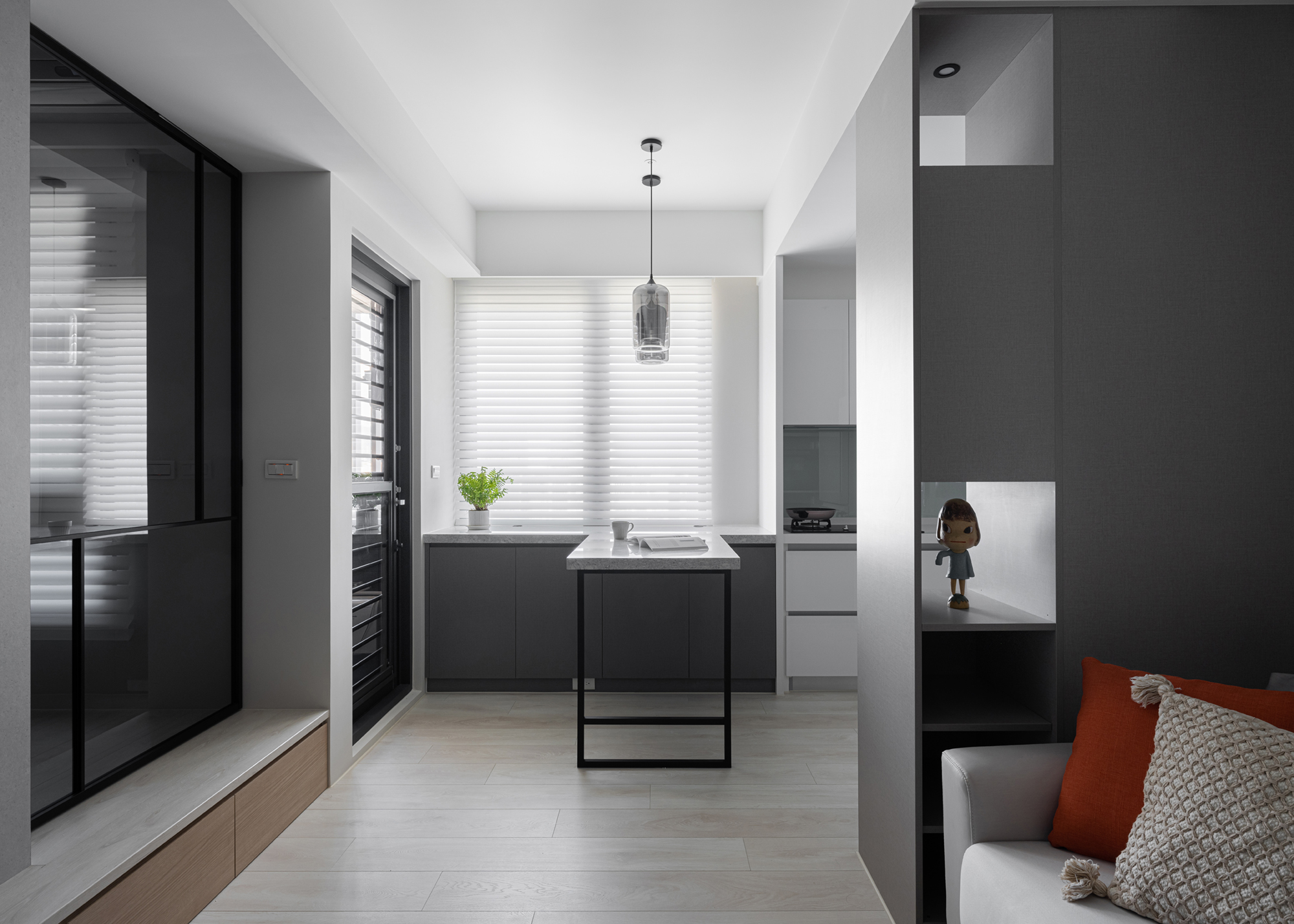 考慮到屋主未來可能會生小孩,因此配置了兩房格局,一房作為主臥使用,另一房則退掉隔間牆,以玻璃門片規劃作為彈性書房,若屋主未來有了孩子,則可隨時改為遊戲房或小孩房使用。但裝修丈量時,發現實體格局空間壓迫感太重,故設計師與屋主溝通採退縮方式雙面規劃,將原先退掉的隔間部分退縮30公分,將前方配置為電視牆使用,而延伸至房內的部分,則隱藏四方格可收納棉被等大型衣物,同時另外規劃玻璃拉門,使客廳空間更為開闊舒適。沙發一側的灰色櫃體為廚房區的電器櫃,60公分為電器置放區,而40公分改作穿透式櫃體,如此一來不僅能擺放展示物,也能引入光線,增添整體的明亮度,打造高機能的現代風小宅。