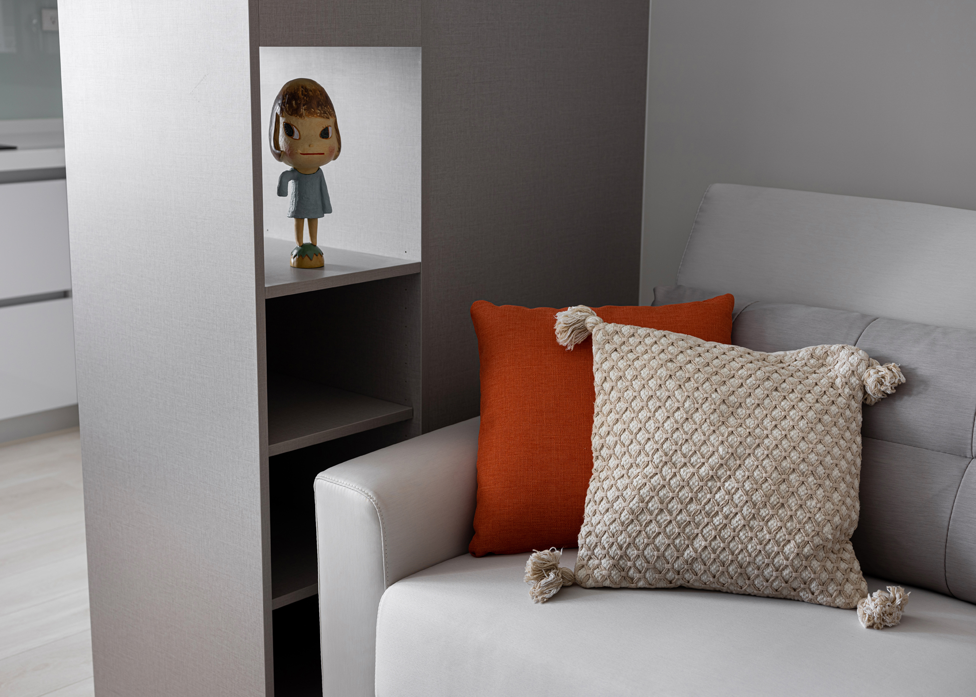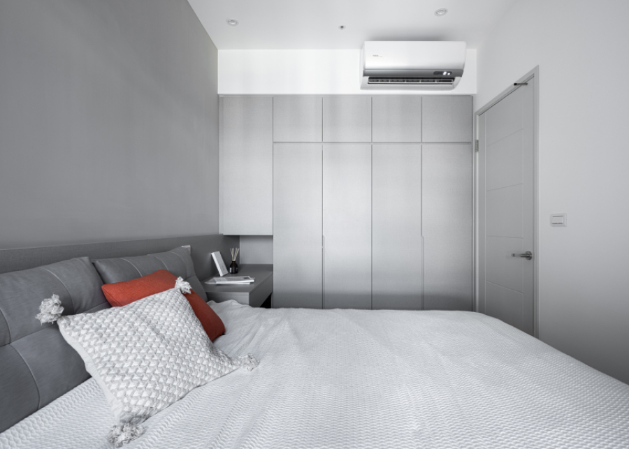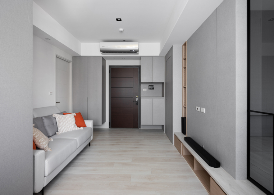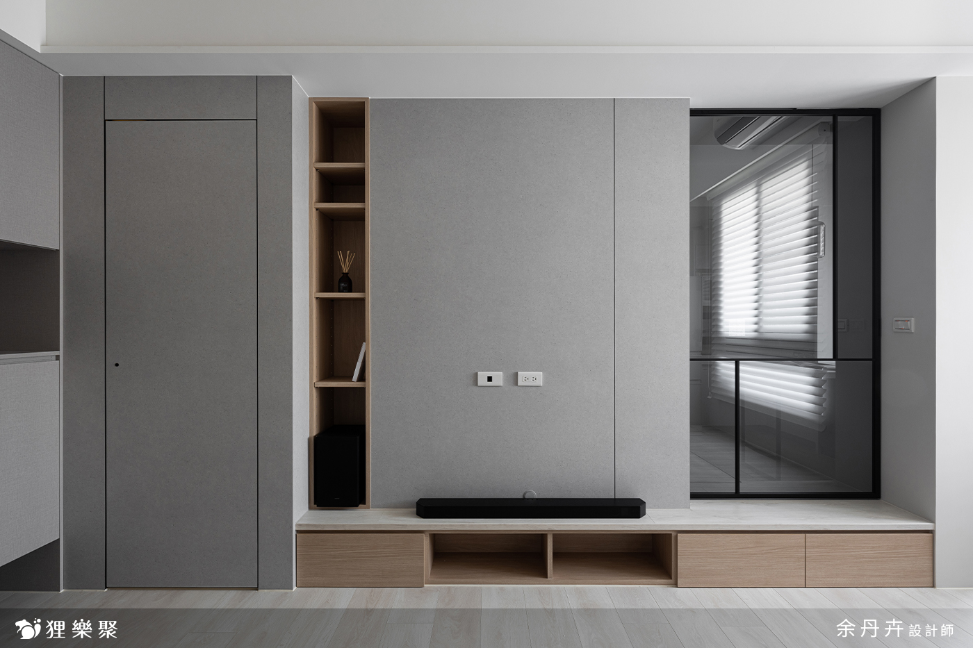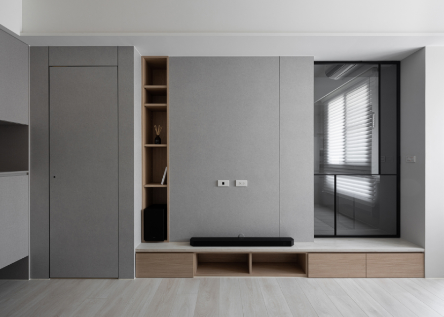 考慮到屋主未來可能會生小孩,因此配置了兩房格局,一房作為主臥使用,另一房則退掉隔間牆,以玻璃門片規劃作為彈性書房,若屋主未來有了孩子,則可隨時改為遊戲房或小孩房使用。但裝修丈量時,發現實體格局空間壓迫感太重,故設計師與屋主溝通採退縮方式雙面規劃,將原先退掉的隔間部分退縮30公分,將前方配置為電視牆使用,而延伸至房內的部分,則隱藏四方格可收納棉被等大型衣物,同時另外規劃玻璃拉門,使客廳空間更為開闊舒適。沙發一側的灰色櫃體為廚房區的電器櫃,60公分為電器置放區,而40公分改作穿透式櫃體,如此一來不僅能擺放展示物,也能引入光線,增添整體的明亮度,打造高機能的現代風小宅。