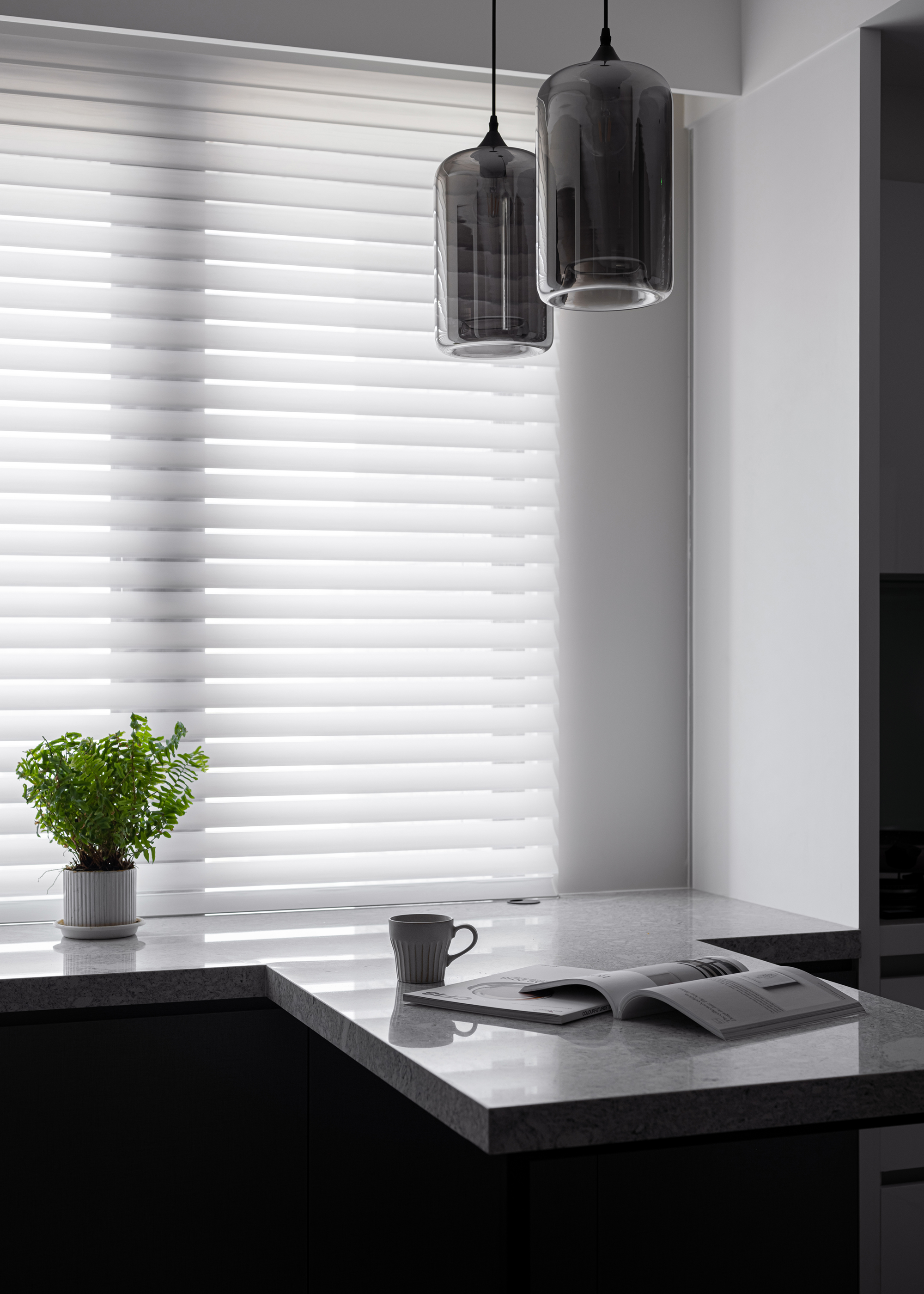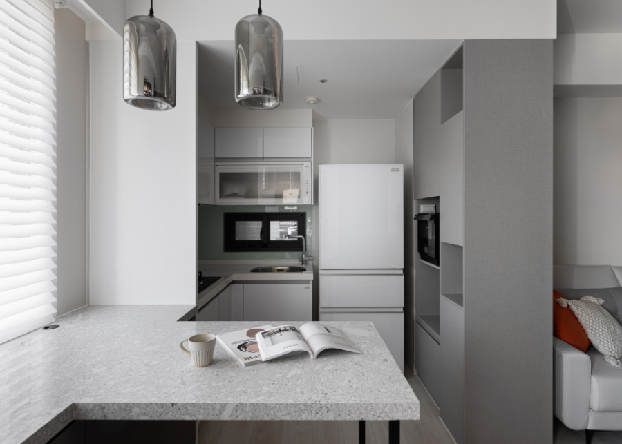 改採開放式後,不僅工作檯面增加,還多了電器櫃空間,動線流暢的同時也提升家人間互動性,讓屋主相當開心。餐廚區的空間有限,直接擺放實體餐桌容易顯得過於擁擠,因此設計師規劃了長94cm×寬70cm的桌面連結雨遮前櫃體,不僅適合雙人用餐,還能作為工作、備餐平台,也能作為朋友來訪時的社交空間,完整小坪數裝潢的各項機能。