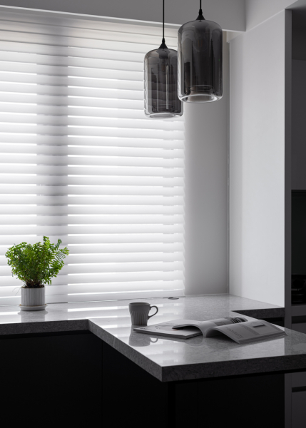 建商原始配置的封閉式廚房不僅使得整體空間受限,也無法讓製作菜餚的人與家人進行近距離對話,客變時考量建商不開放退火區實牆,設計師與建商溝通配置空心牆,以便往後改成開放空間時好敲除,而此建商也樂於配合。改採開放式後,不僅工作檯面增加,還多了電器櫃空間,動線流暢的同時也提升家人間互動性,讓屋主相當開心。餐廚區的空間有限,直接擺放實體餐桌容易顯得過於擁擠,因此設計師規劃了長94cm×寬70cm的桌面連結雨遮前櫃體,不僅適合雙人用餐,還能作為工作、備餐平台,也能作為朋友來訪時的社交空間,完整小坪數裝潢的各項機能。