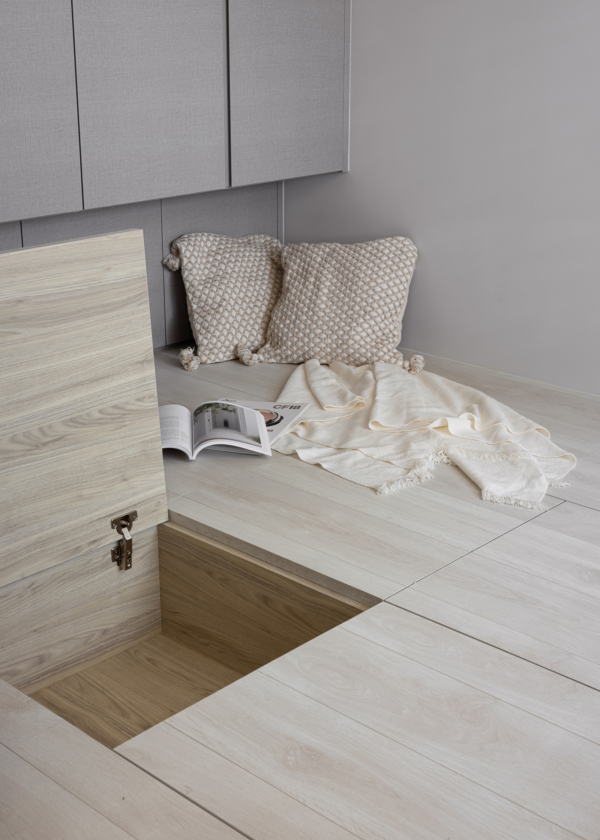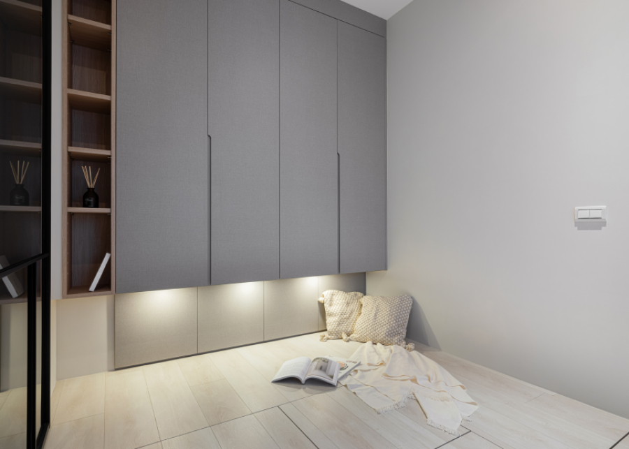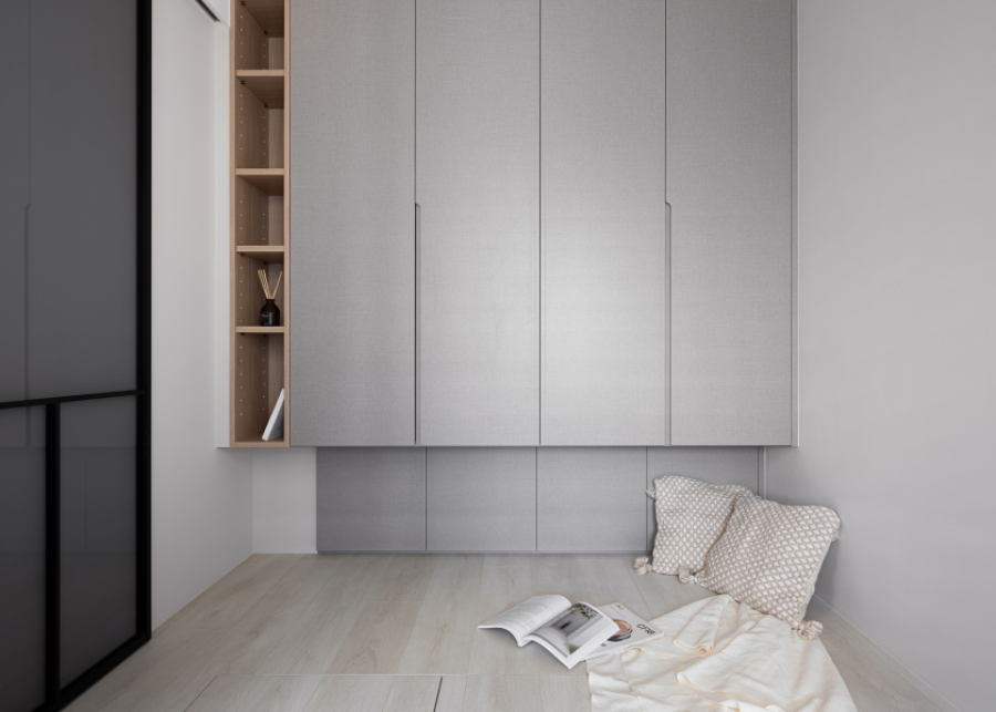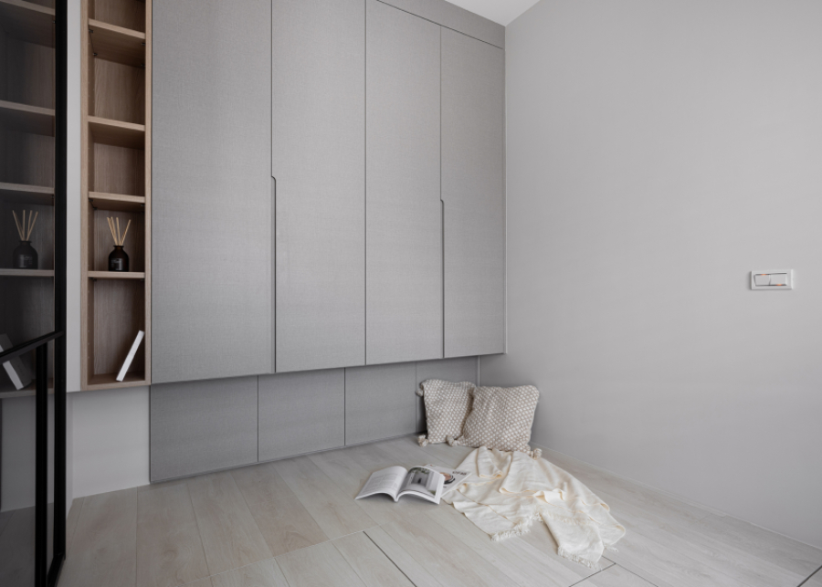 而牆面退縮後,次臥室因空間有限,設計師以和室概念配置空間,設計了底部收納與衣櫃,不論是收放玩具、厚重衣物、棉被寢具都很適用,若孩子出生僅須添購床墊即可使用。此外,也確保日後能有足夠的儲物空間收納嬰兒備品,以多元的收納機能完善五年內使用需求。