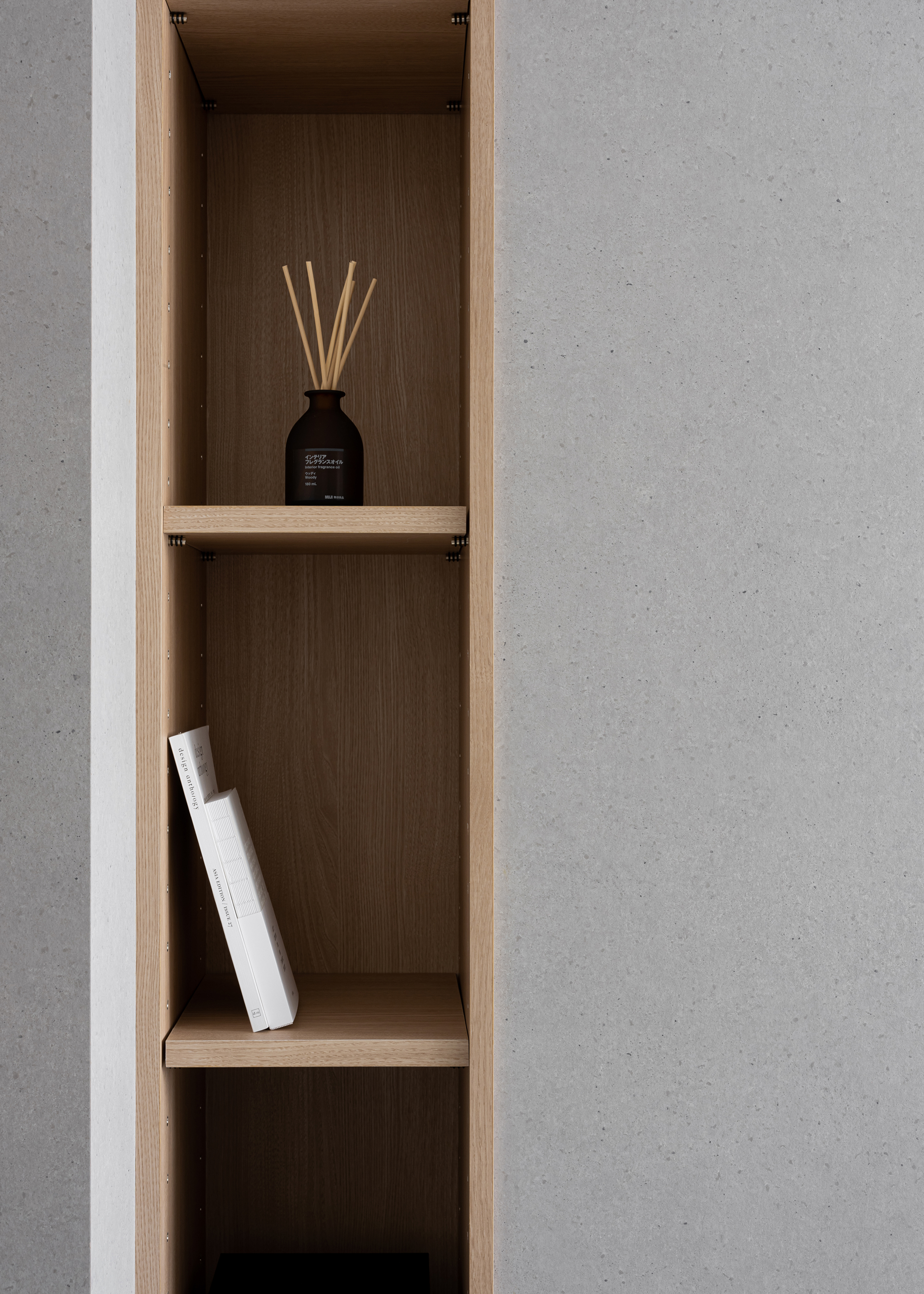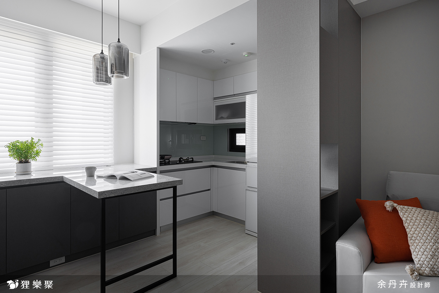 此案有著高樓層、周邊無其他更高建案的優勢,但因空間坪數小,且僅有單面採光,加上廚房配置於窗邊,大大阻擋了客廳的採光,使室內顯得昏暗。格局方面,建商規劃一進門即為衛浴、客廳,缺少轉圜的玄關空間,使得收納空間不足,令屋主相當困擾。屋主經常開火,原有廚房僅有兩爐,且無可實際操作的工作台、電器櫃,希望能改善上述問題。因此設計師在客變階段以「整體空間重劃、增加收納、提升廚房使用性」為核心考量重新規劃空間。設計師於客變時協助屋主退掉廚房隔間牆、門片,開放的餐廚區不僅能增加空間採光與視覺效果,還能透過雙面櫃區隔餐廚與客廳空間,面廚房的櫃體可做為電器櫃、面客廳櫃體則採開放式設計,兼具實用與美觀性。屋主的餐桌需求則與雨遮前置物區板材一同規劃,設計出一體成型、能擺放菜餚且使視覺延伸的桌面空間。引入充足的室內光線後,設計師於入門處規劃頂天櫃體,不僅能完善鞋櫃、收納機能,視覺上也不會過於壓迫,以簡約的線條,營造出溫暖的現代風小坪數裝潢。
