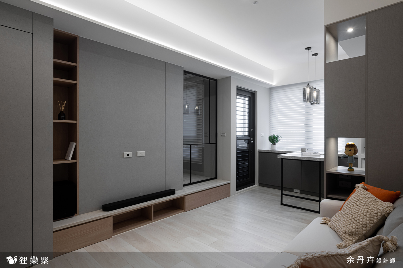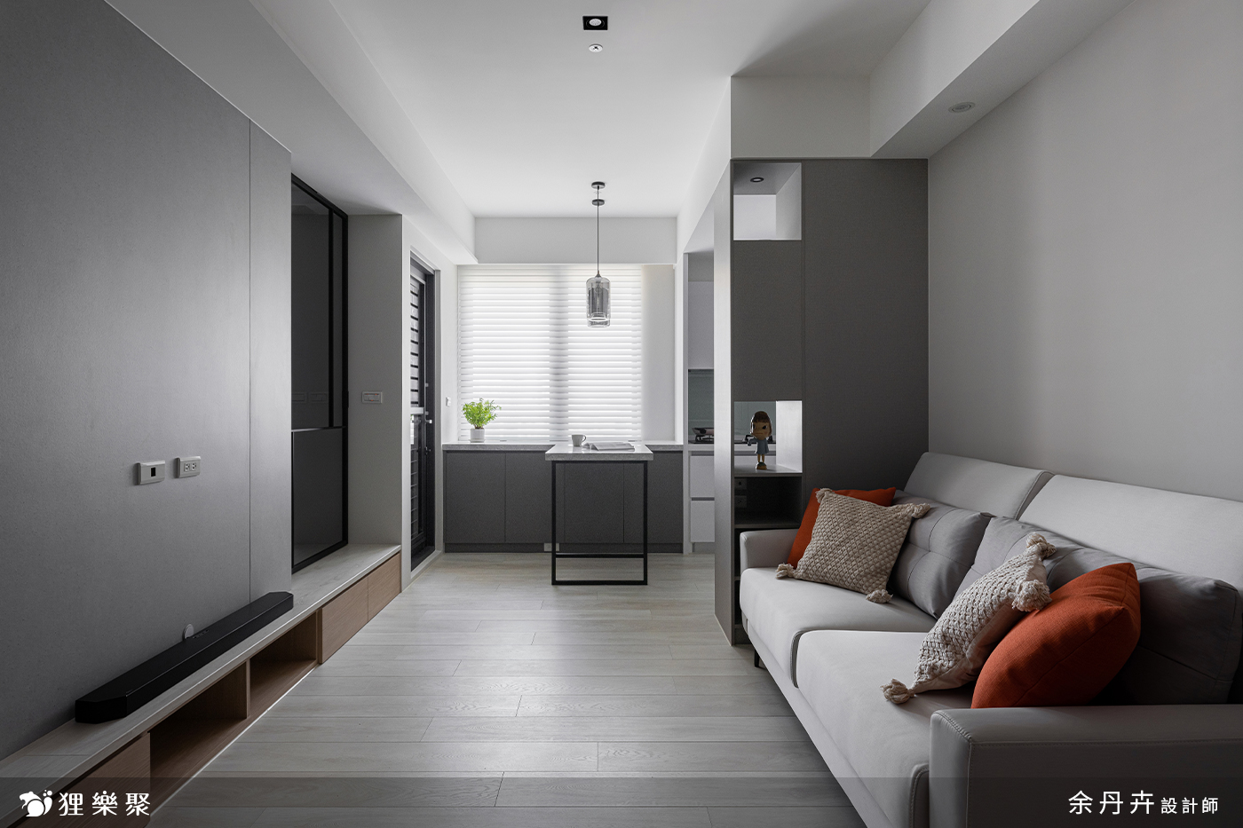沙發一側的灰色櫃體為廚房區的電器櫃,60公分為電器置放區,而40公分改作穿透式櫃體,如此一來不僅能擺放展示物,也能引入光線,增添整體的明亮度,打造高機能的現代風小宅。