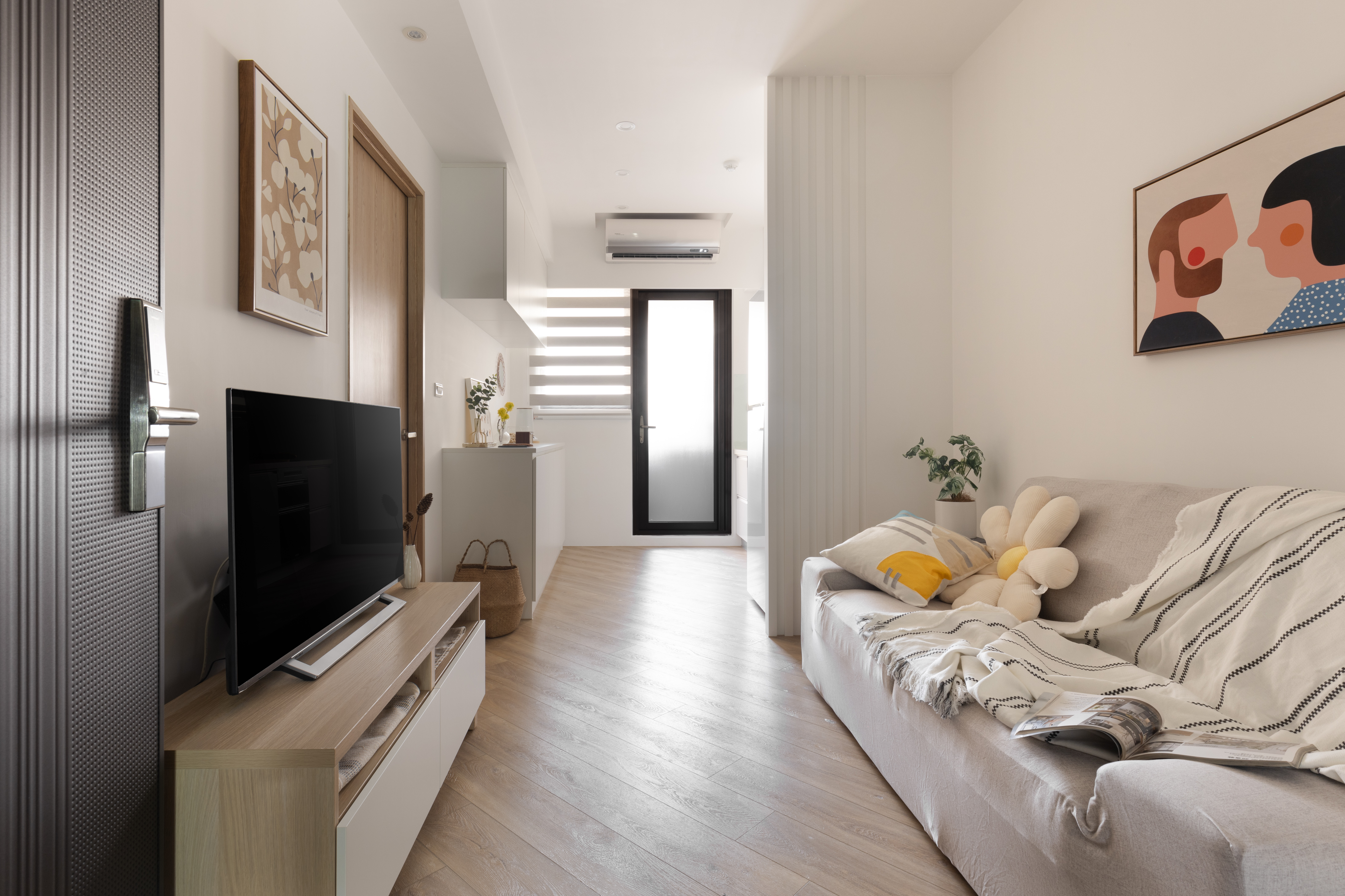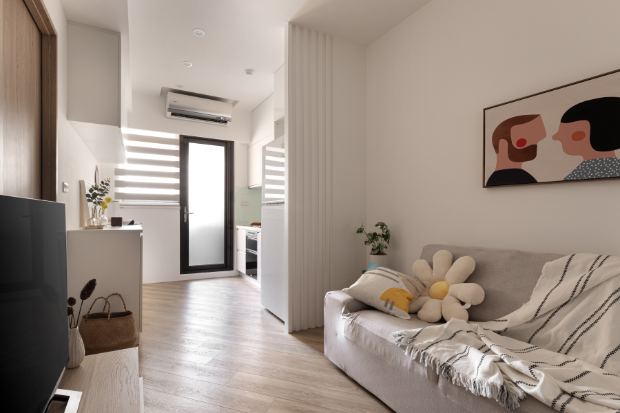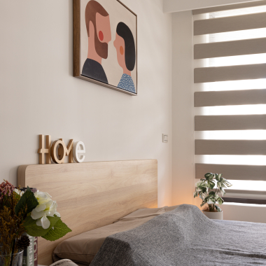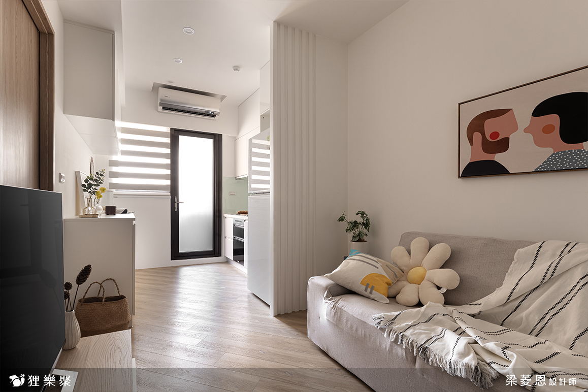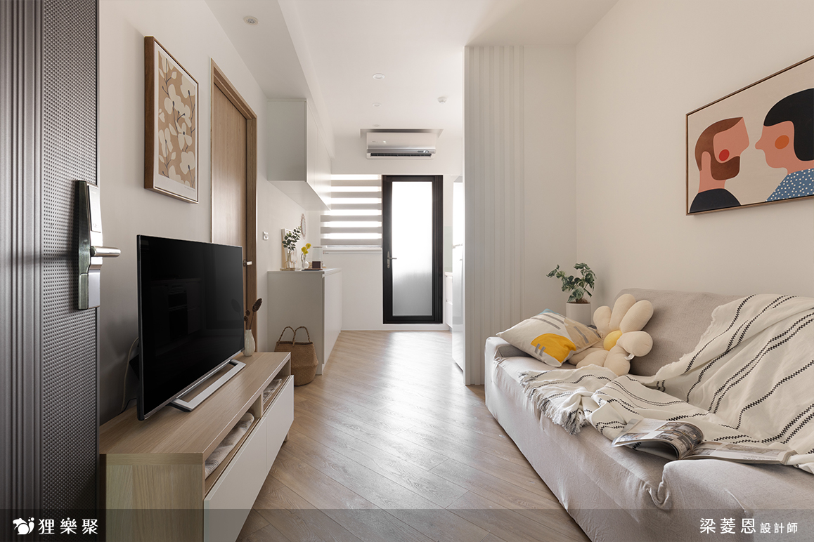 走進起居空間,可以感受淺色木質建材與傢俬散發的溫潤氛圍。設計師特別增加了幾處線條,讓空間以不同幾何方式切分,讓視覺感受不再呆板無趣。冰箱側板巧妙地以凹凸面增加垂直線條,搭配橫條紋調光簾,以及斜面鋪設的木地板,而陽台黑色門框,如同巧妙嵌入這些直、橫、斜線中的幾何設計。此外,茶几與臥室門也選用帶有自然木紋的面料,中和了線條幾何空間的生硬。