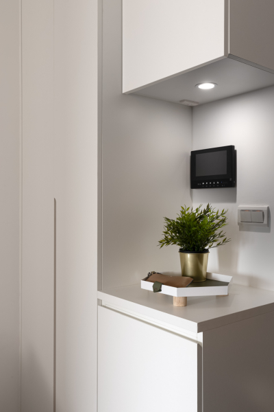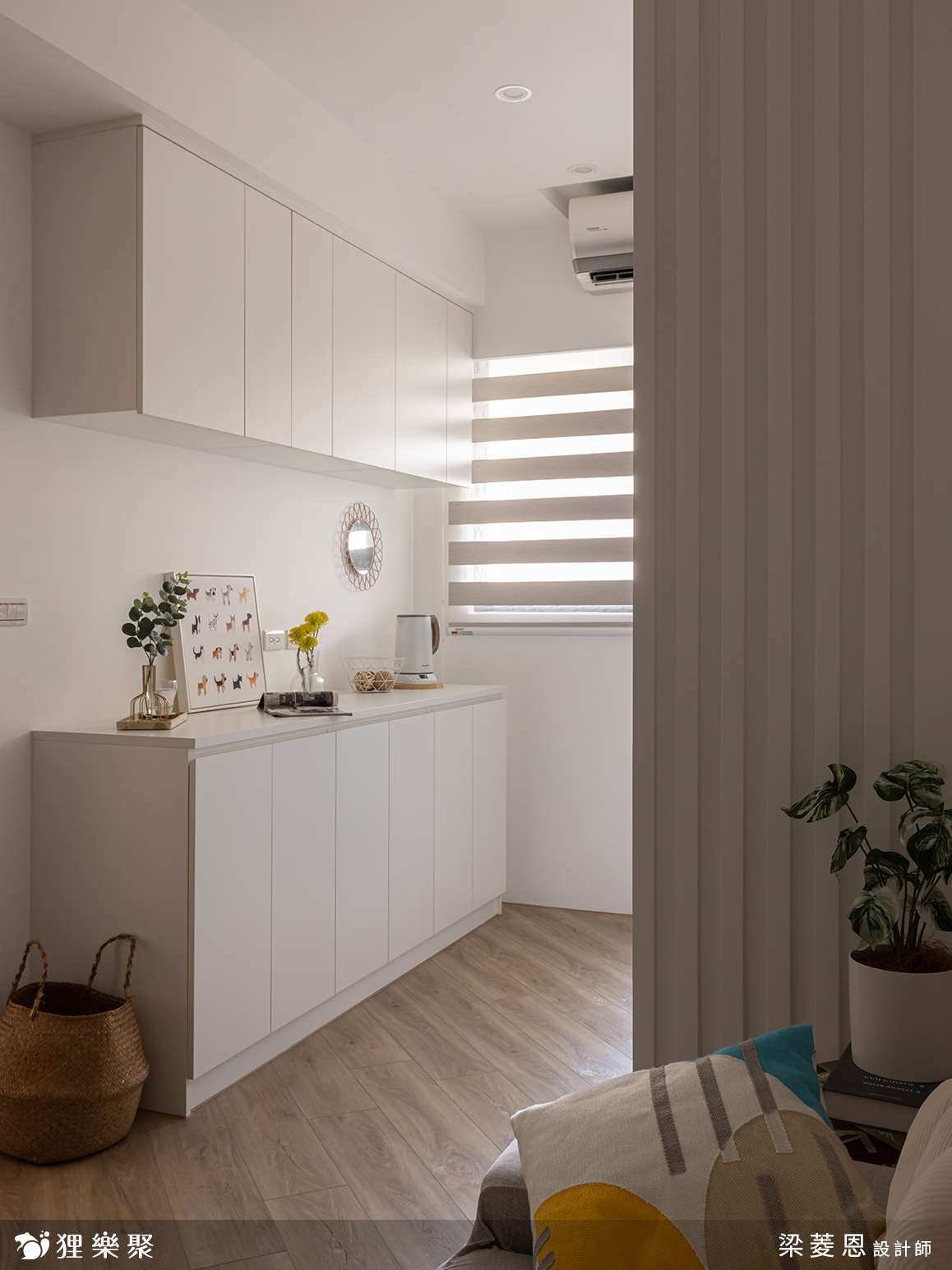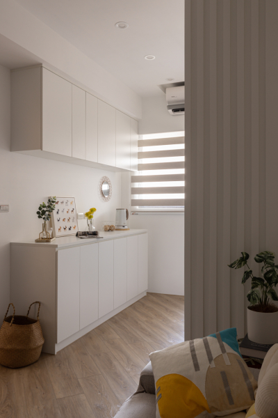 借用辦公室的茶水間概念,上下皆規劃充足儲物空間,可將食品乾糧、生活用品等集中在一處,方便管理,並留有大片作業空間,可整齊擺放咖啡機、電熱壺、氣炸鍋等電器用品,並彈性成為料理備料區、或擺放風格小物。