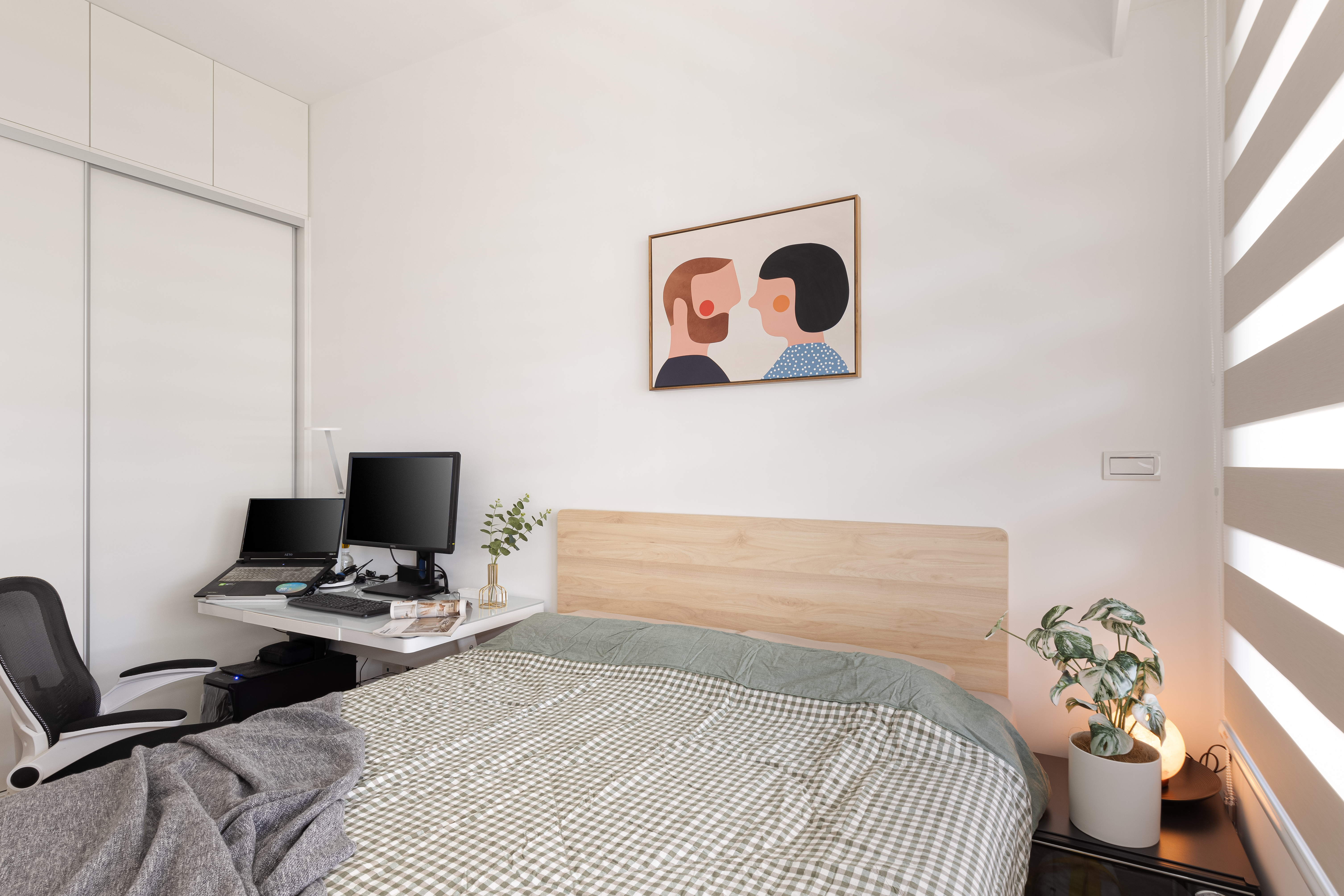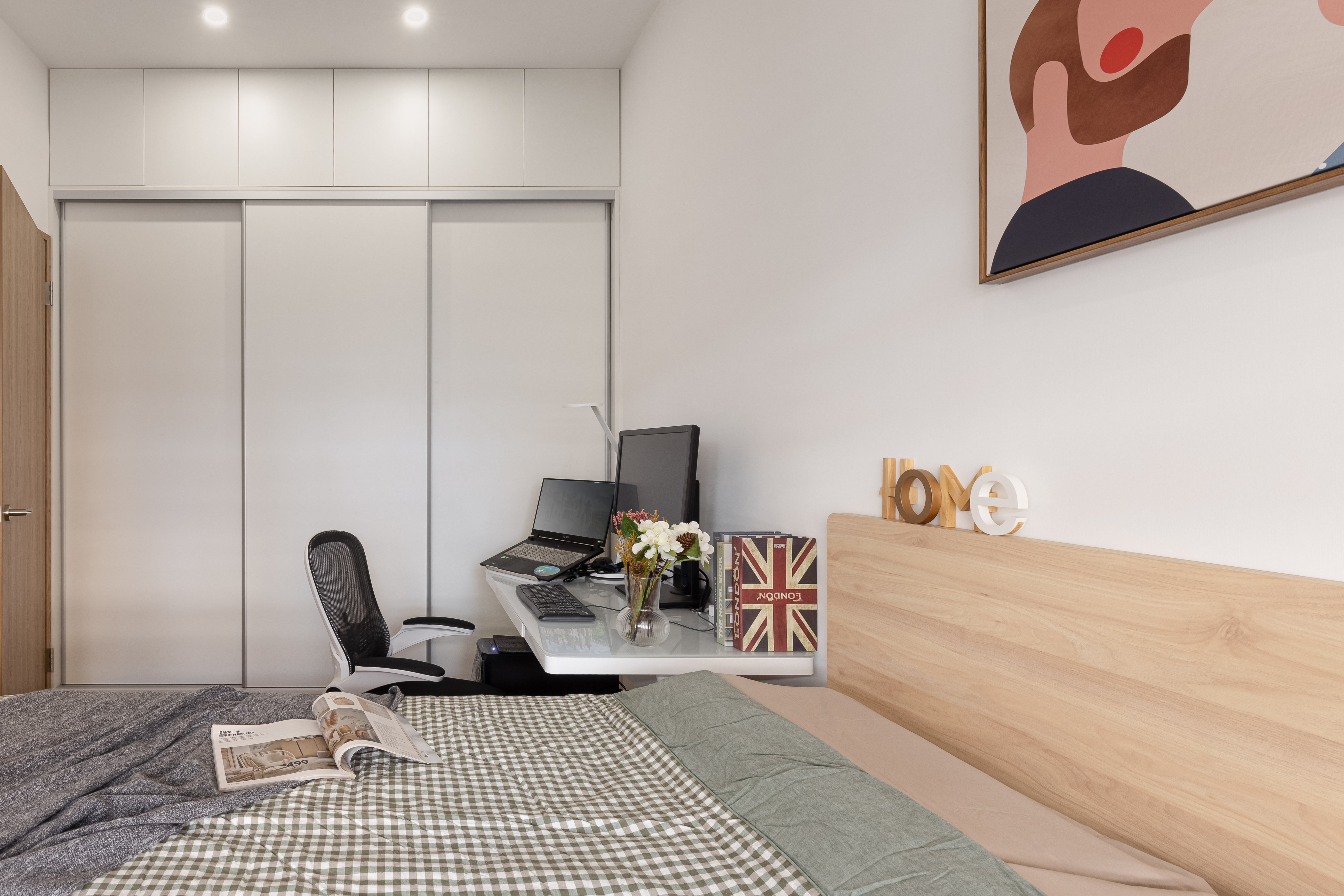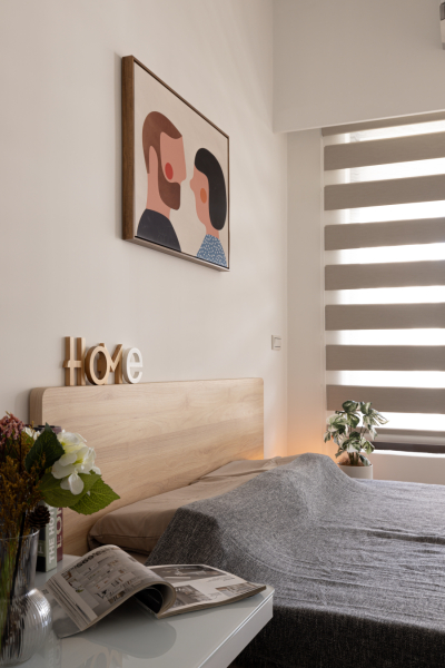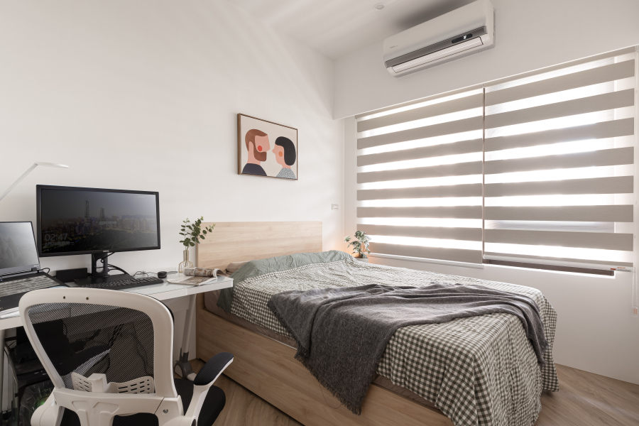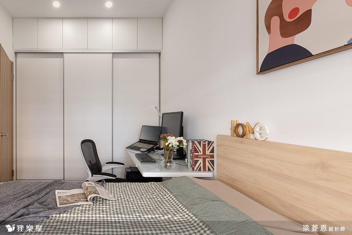 兼具美觀與實用的收納設計,決定了臥室的整齊清淨。衣櫃配合臥室木門高度,切分成上下區塊,維持視覺挑高感。下層為橫拉門片,方便置入行李箱或收納箱,依照需求自由調配空間配置;上層為小面外開式門板,置物取物更加方便,門片寬度也配合下層門片,形成一面幾何裝置藝術。床架則選用了淺木紋質感,給予臥室應有的暖度。