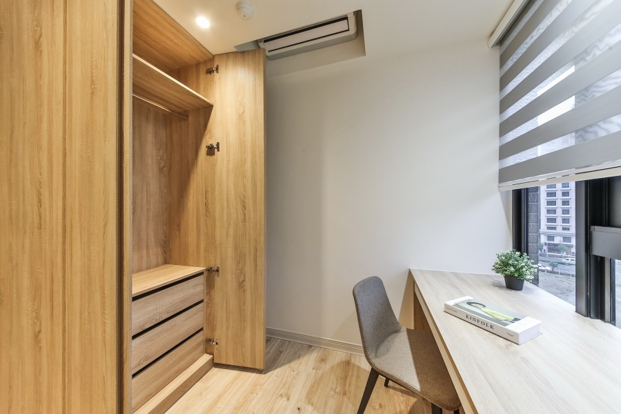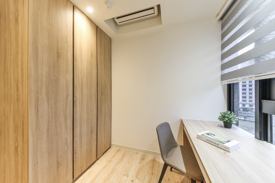 比起現代風格時常使用的黑白灰色系,屋主更喜歡暖色調的木頭色,從地板、收納櫃、臥榻、桌面、床頭板等等,都選擇或深或淺的木頭紋路板材,讓空間多了一份溫馨的感覺,更適合屋主一家大小居住。