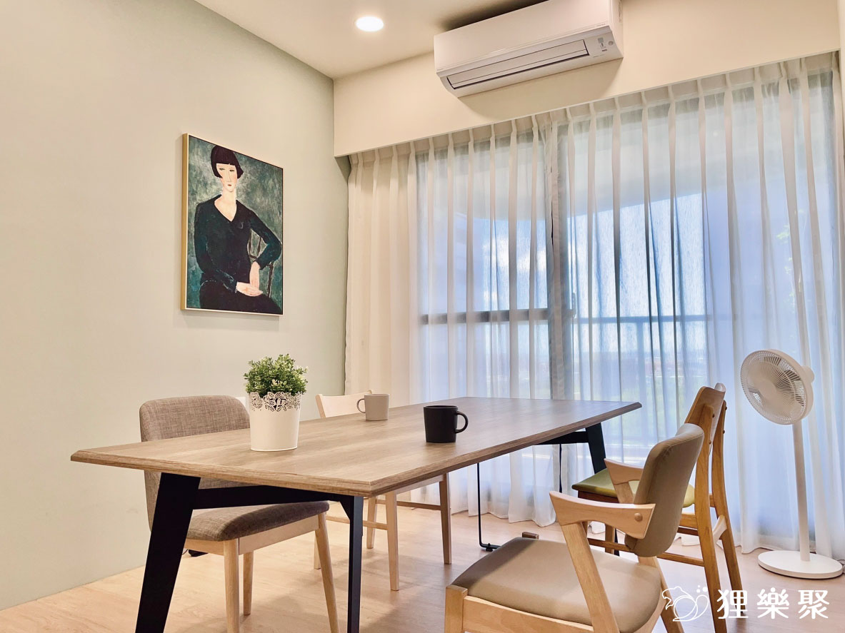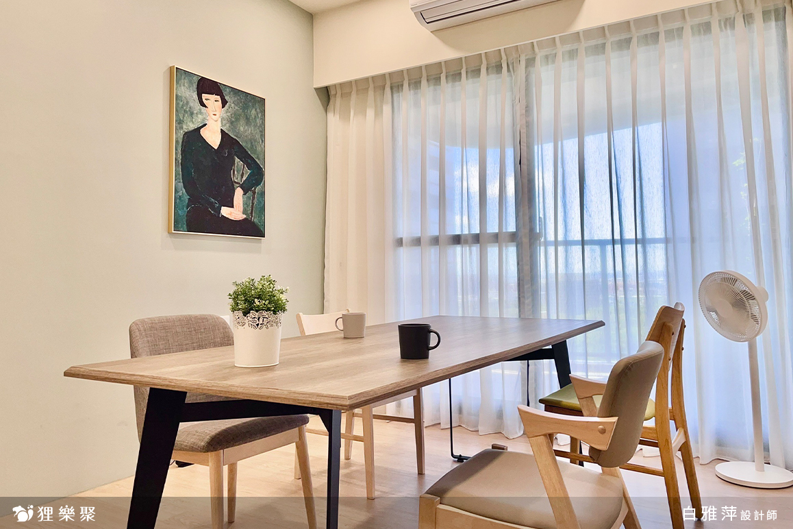 業主對於工作室最基本的需求是一個洽談空間和辦公桌,在採光最佳的客廳區域放張大桌子,並擺上幾把椅子和循環扇,一個舒適的洽談空間就完成了,對於業主談案子也是一個相當加分的條件;而次臥的部分則規劃了辦公桌,簡單的小衣櫃讓業主收納一些較正式的衣服,可以在客戶來訪的時候換上,在工作告一個段落時,臥榻床也能夠讓業主小睡一下;小廚房的部份則可以準備茶水、咖啡提供給客戶,必要時也可以簡單下廚做個午餐,對於居家辦公來說是一個機能性十足的工作室設計。延伸閱讀:<< 哪種裝潢風格適合我家?這樣挑準沒錯! >>