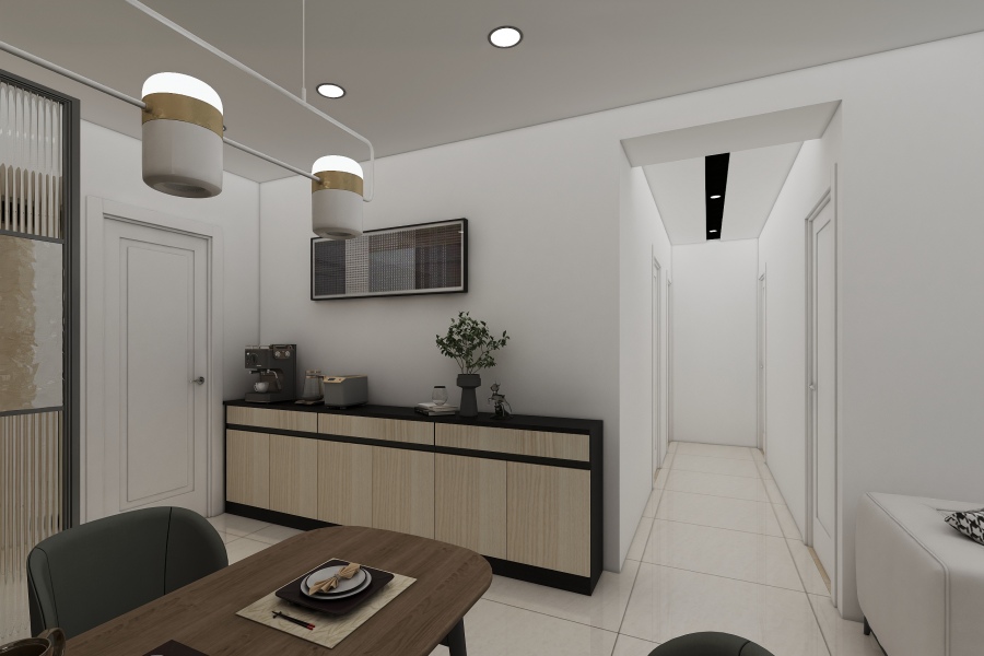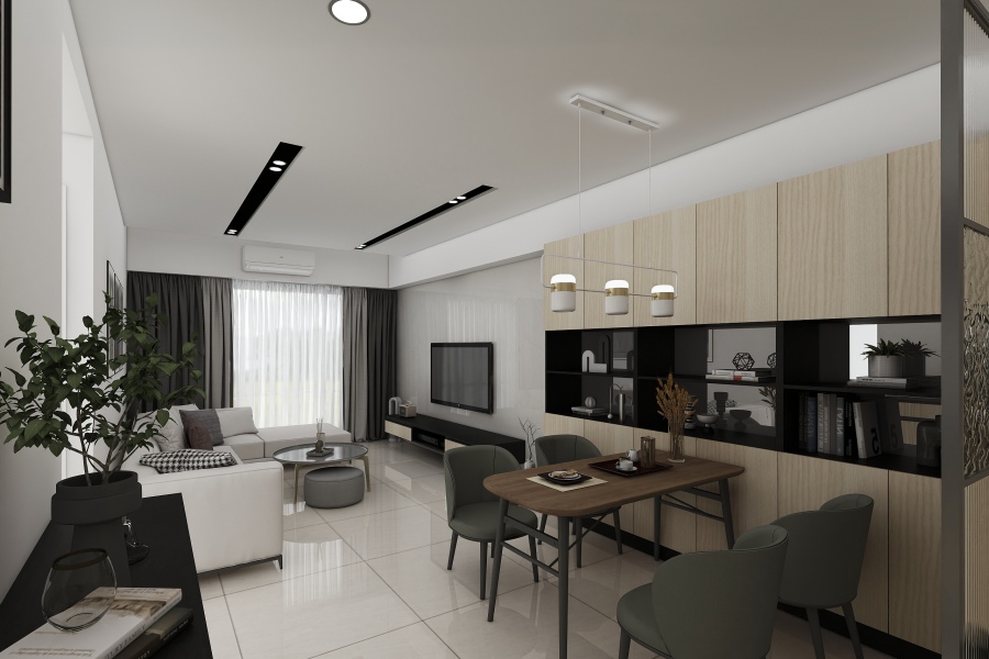 越過屏風即是餐廳和客廳,餐邊櫃同樣利用系統櫃打造,上下櫃中間鏤空的部分貼了黑鏡,再選用線條簡單條俐落的家具,打造寬敞明亮的視覺感受。