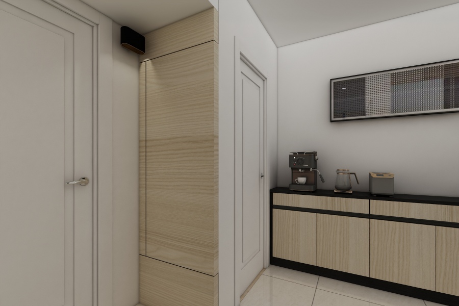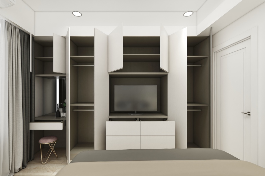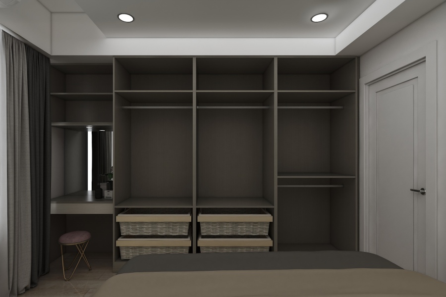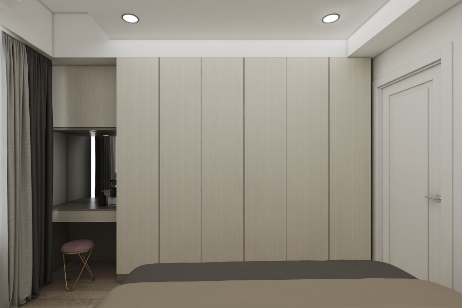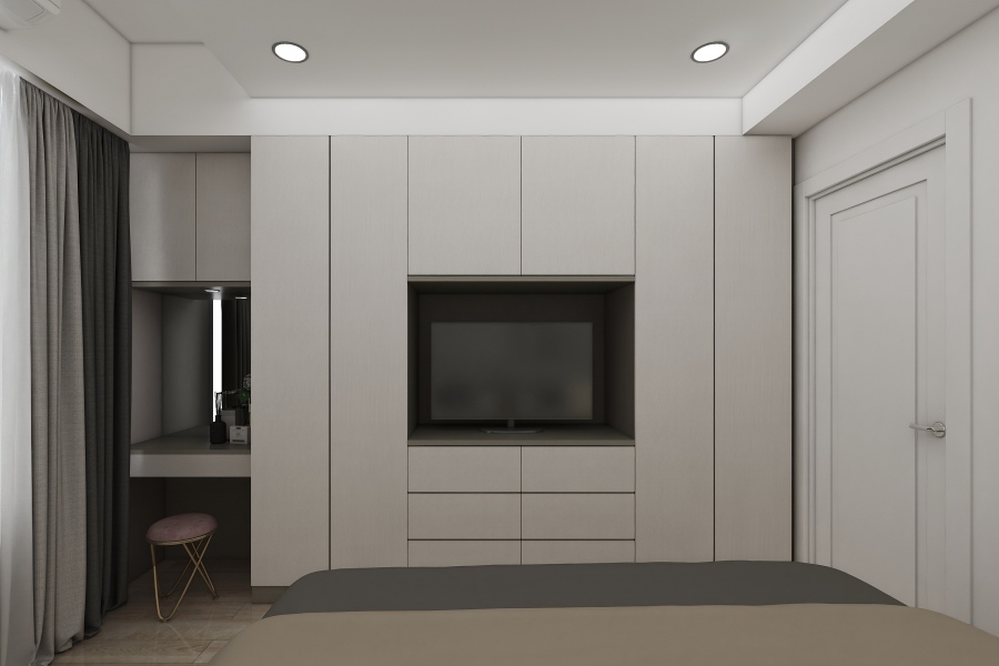 如同案例中臥室的系統衣櫃設計,將樑下的空間完整利用,同時省去清理衣櫃上方灰塵的工作,而系統衣櫃設計也能按照使用者喜好收納衣物的方式做客製化,例如屋主不愛摺衣服,所以僅在電視櫃下方規劃抽屜放置貼身衣物及襪子,其他櫃體皆設置吊衣桿,以符合屋主的使用習慣。