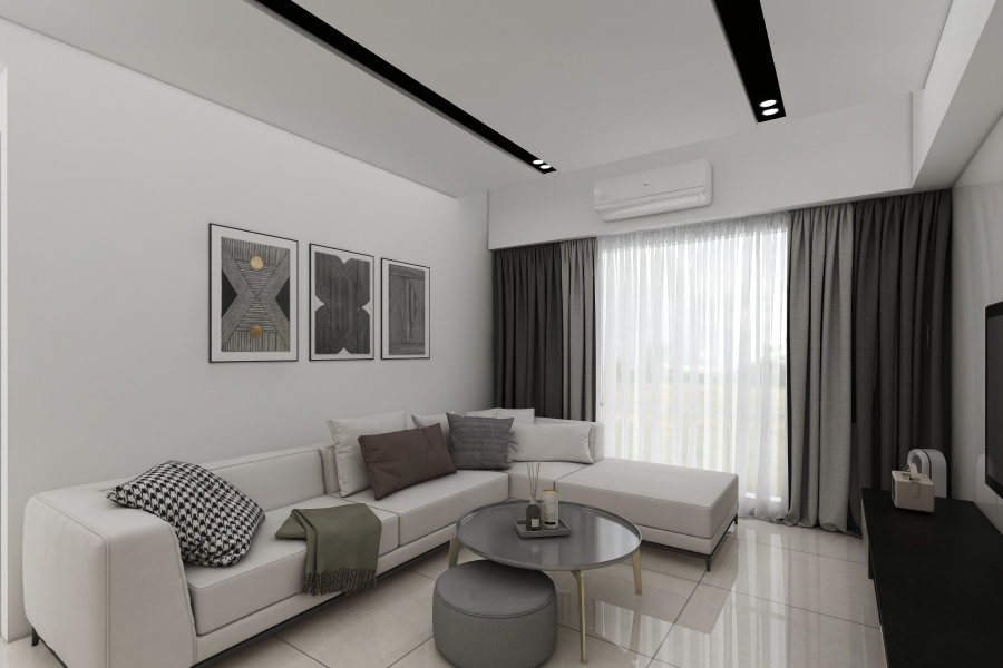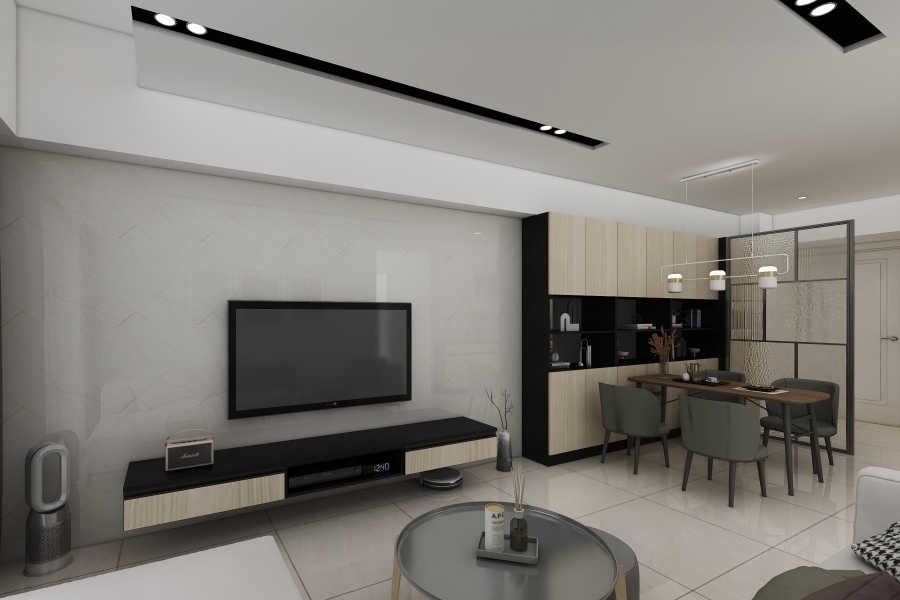 由於地面磁磚、電視牆、天花板甚至是沙發都選用白色系,在天花板設計兩段凹槽,搭配黑色盒燈作為照明,黑色的線條讓整個空間更有立體感,完成了現代簡約風的舒適單身宅。