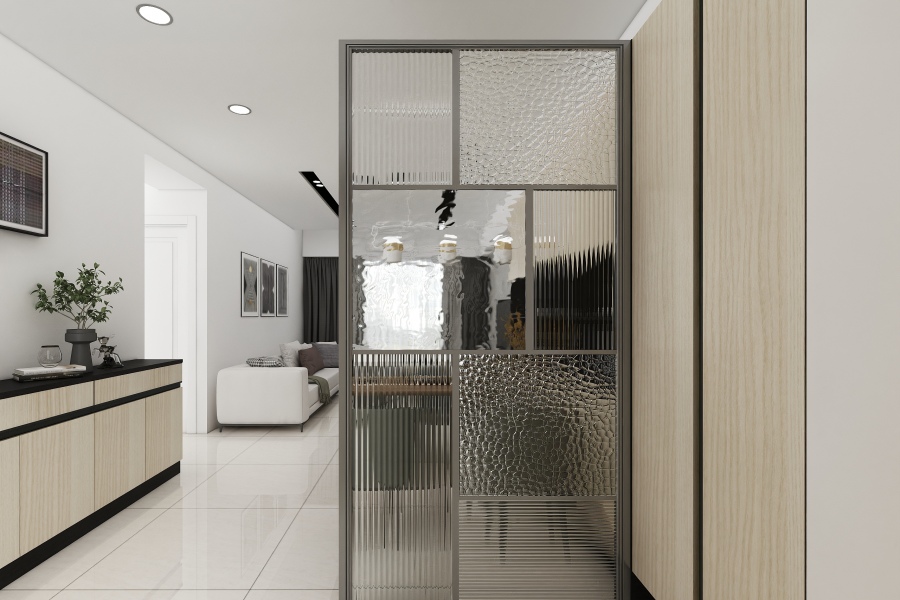 在玄關和客餐廳中間以一道玻璃鐵件屏風做區隔,讓玄關處仍然能有自然光到達,屏風內崁水波紋玻璃和長虹玻璃,利用不同的紋路和方向做變化,在光線透入時能夠呈現相當豐富的視覺效果。
