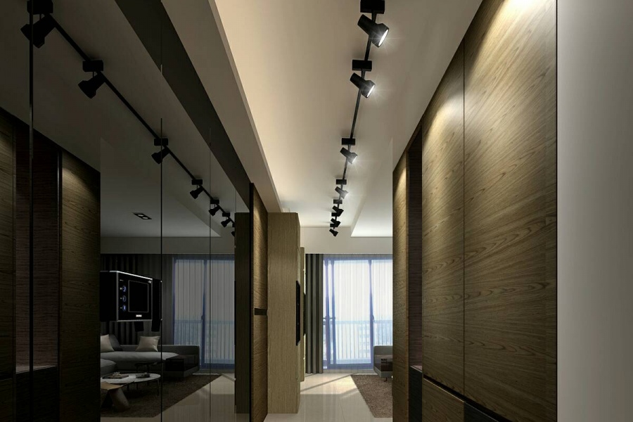 進門後右方規劃了鞋櫃和玄關櫃,狹窄的走廊造成不少壓迫感,所以設計師利用整面牆的黑鏡擴大視覺感,並加上軌道燈具照射在櫃體,透過黑鏡隱約地反射,更讓長廊增添了些許藝術感,一踏進家門就是一場視覺盛宴。