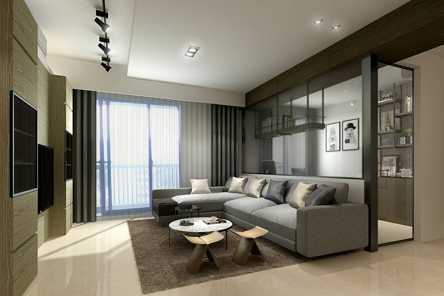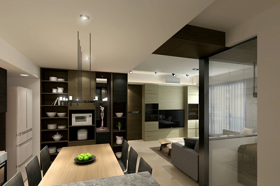 屋主喜歡俐落大氣的現代風,設計師利用燈具、黑鏡以及暗色系的材質來打造,讓屋子透出隱約的奢華感。此次規劃重點在於狹小的書房設計,要讓空間功能與美觀並具;另外,由於屋主有大量的器皿收藏,除了一般家庭會有的展示及收納空間外,在餐桌旁另外需要規劃展示櫃兼電器櫃,方便屋主使用。