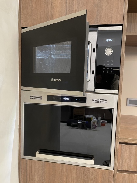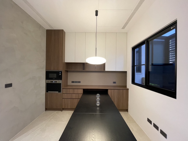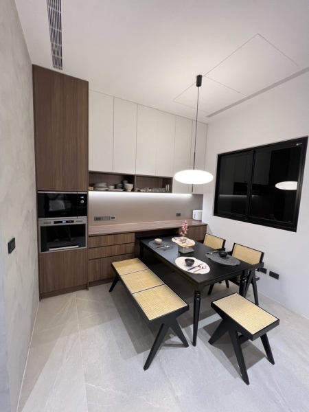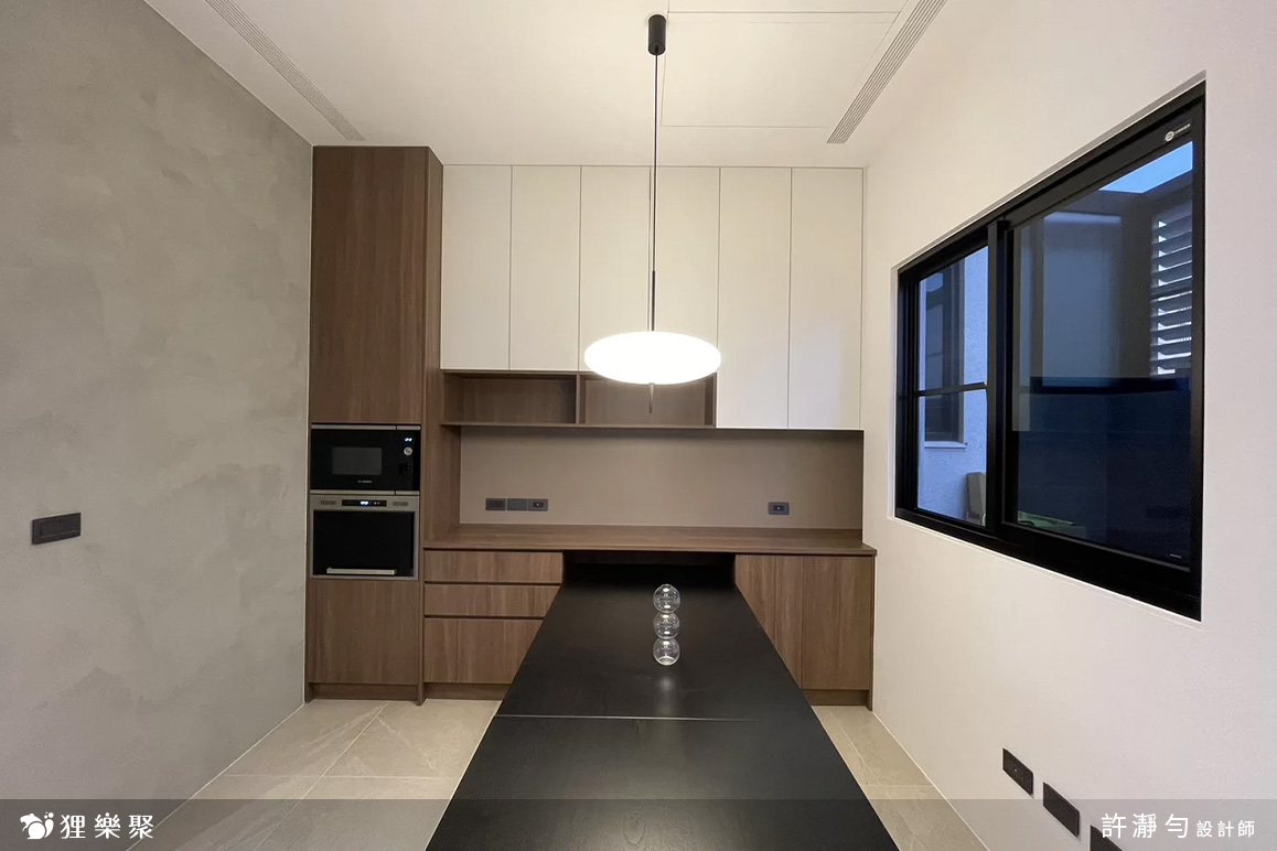 木質+白色調的電器&餐邊櫃設計,能收納大量的碗盤與餐具,小平台則可擺放常用的小廚電,使桌面不再雜亂無章,讓一家人能舒適且愉快的用餐。開放式的廚房色調與餐廳相呼應,讓屋主在烹飪時仍能與家人互動、聯繫感情,機能與美型兼具。