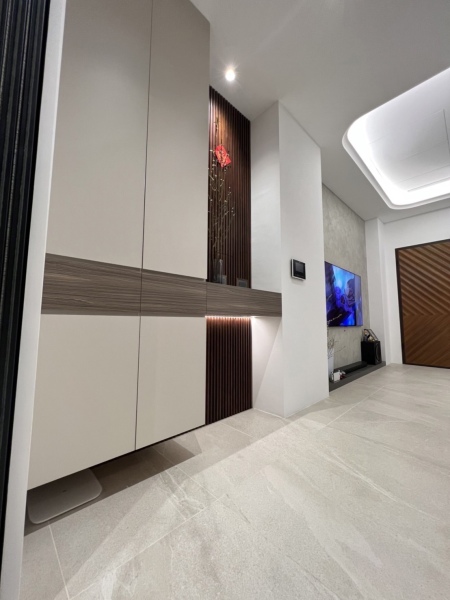 屋主期望讓家人間能舒適相聚、愉快地分享生活大小事,在35坪的空間中,設計師透過司曼特漆塗料、降板造型天花設計帶出整體層次感,並在客餐廳間安排了沉穩的端景牆面,流暢的連結空間,餐廚區則以木質、白色調搭配,並將電器櫃、收納櫃結合,創造高機能且沉穩舒適的生活空間。高機能舒適現代宅