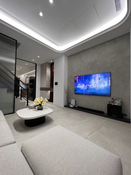 客廳以降板造型天花設計搭配整面、無過多裝飾的司曼特漆電視牆面,展現空間的大器感受;寬敞好坐的L型灰色沙發讓家人能自在相聚、暢談生活大小事,創造舒適的居家核心空間。