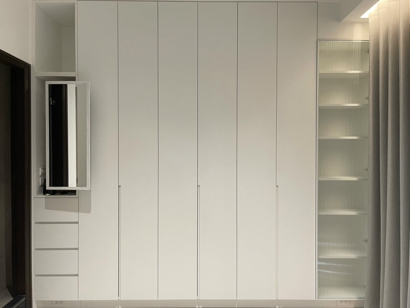 臥室區域著重收納,設計師在更衣室以香檳色門片打造不同方向的高低收納櫃,低身櫃方便收納化妝品瓶罐,另一側櫃體則能收整各類衣物、配件,讓屋主好拿且好找。臥室床尾白色衣櫃內藏旋轉衣架,搭配側邊的長虹玻璃展示櫃,讓屋主能自行布置空間,使生活兼具著舒適與設計品味。
