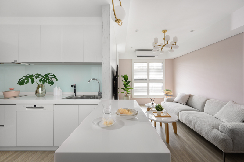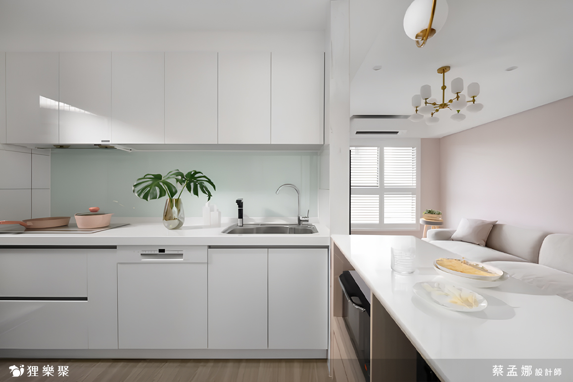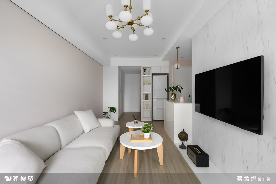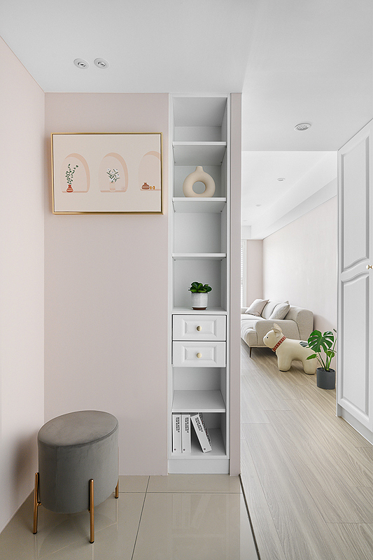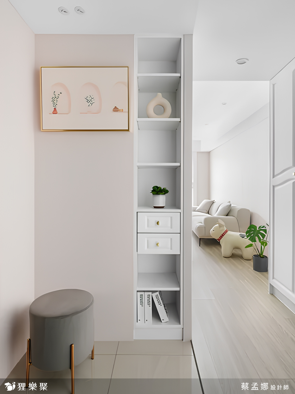 因此在規劃上我們捨棄了餐桌空間,獨立出玄關區域,除了基本的鞋櫃外,將既有臥室格局無法滿足的衣櫃需求整合於此。開放式廚房將冰箱與小家電收納整合成一體,放置於大門口正前方,冰箱背牆兼具玄關端景掛畫牆面功能,區隔出的牆面讓穿鞋椅有其專屬位置。小家電不需要太深的櫃體,將櫃體切割一半給玄關使用,規劃部分做入口展示櫃,平時回到家可以放置鑰匙、小包。