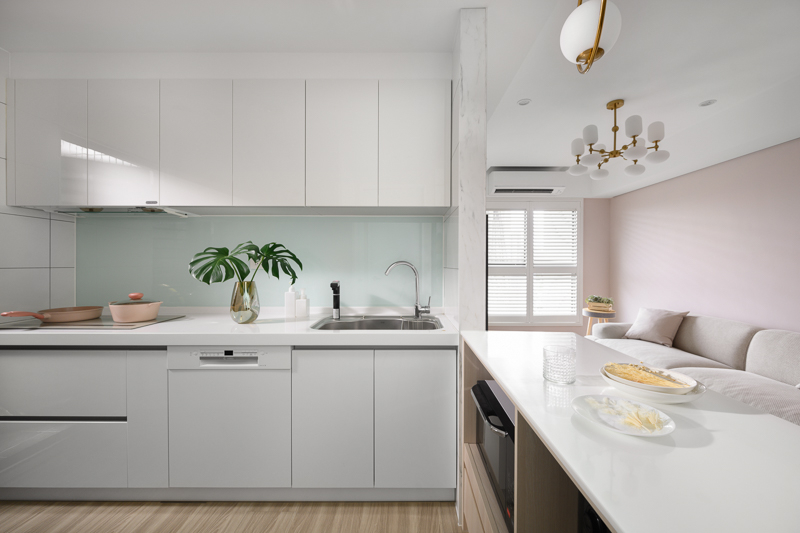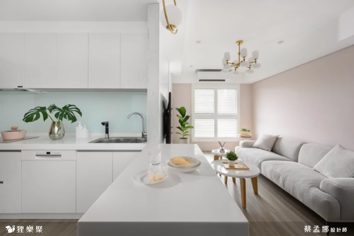 開放式廚房將冰箱與小家電收納整合成一體,放置於大門口正前方,冰箱背牆兼具玄關端景掛畫牆面功能,區隔出的牆面讓穿鞋椅有其專屬位置。小家電不需要太深的櫃體,將櫃體切割一半給玄關使用,規劃部分做入口展示櫃,平時回到家可以放置鑰匙、小包。