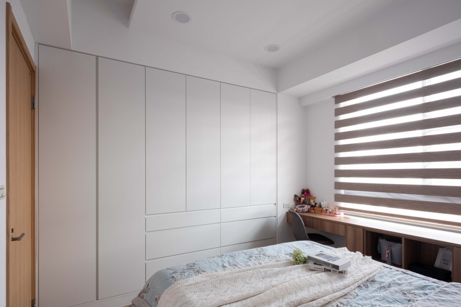 在臥房的部分,設置長型書桌在窗邊,不僅是書桌,同時也是收納櫃以及展示空間,一物多用,將小坪數的空間發揮最多的用途。衣櫃則使用和牆面同色的板材,在與牆面沒有太大區隔的狀況下,就像是一面完整的牆,能夠狹小空間帶來的擁擠感。