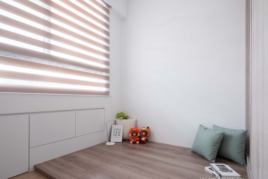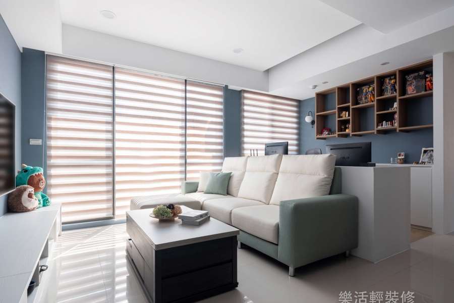 考量房子空間設計,在配置上將空間運用率最大化,前方作為休息放鬆的客廳空間,後半部則作為辦公的場地,中間不以牆面隔開,避免客廳和書房空間都顯得過於狹小,開放式的設計能擴大坪數的視覺效果,後方牆面的木頭吊櫃在開放的空間設計下,也同時作為客廳展示櫃,而書房的窗邊設置了臥榻,能讓屋主在工作的間隙中稍作休息,享受陽光。